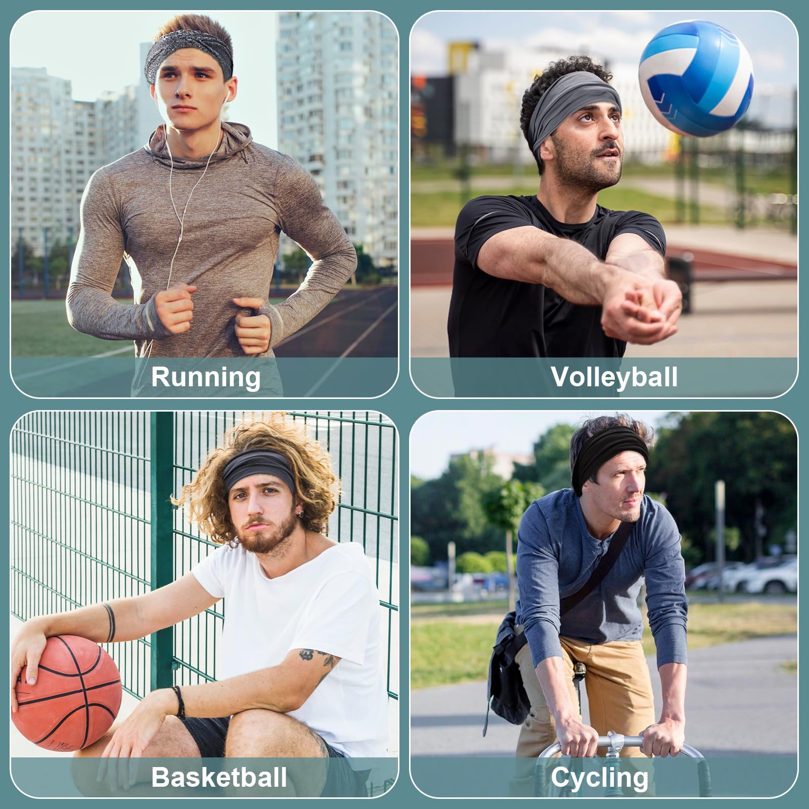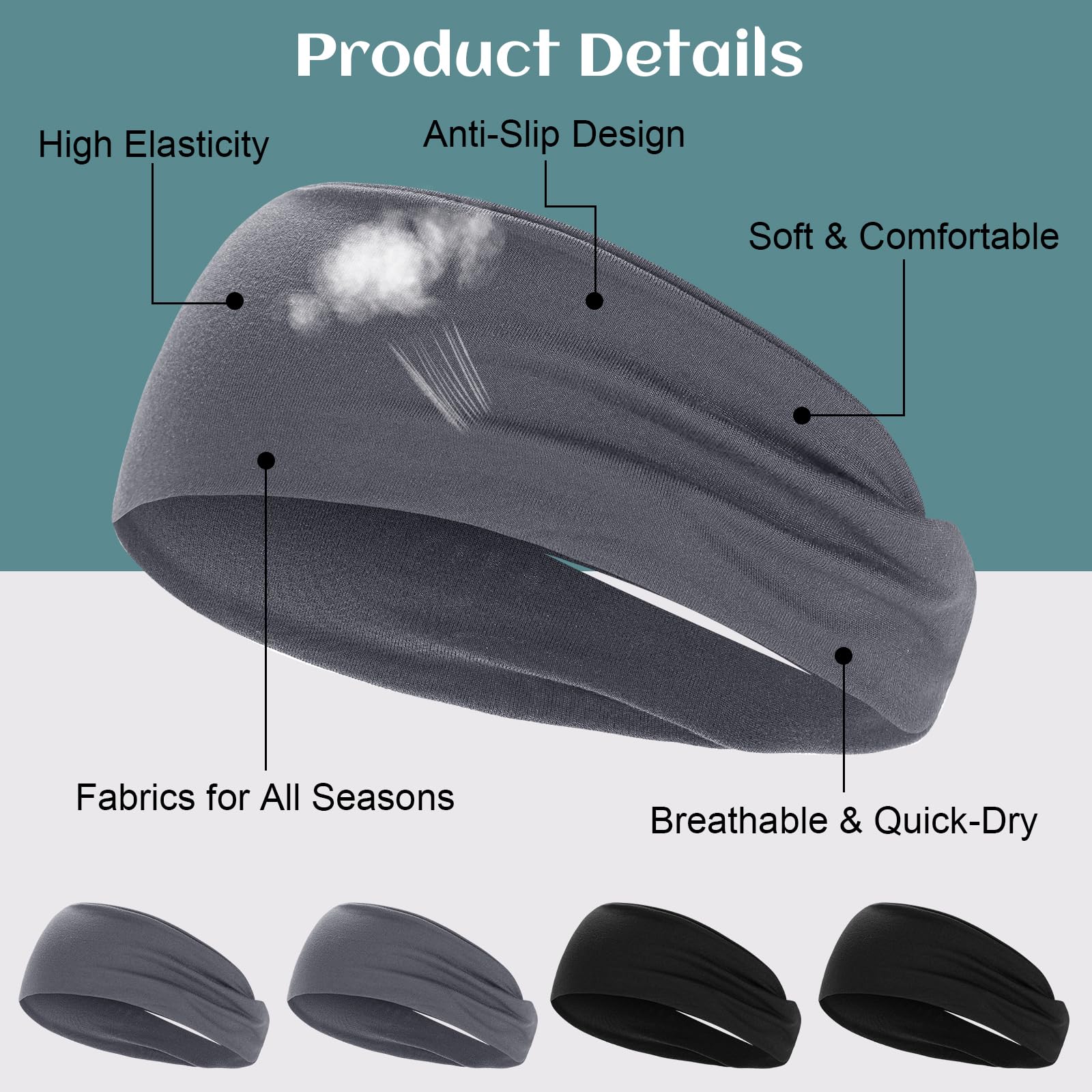 4 Stück Stirnband Herren, Elastisch Breites Haarband Sport Männer Atmungsaktiv Schweißband Stirn rutschfest für Fitness Joggen Laufen Radfahren Basketball (Schwarz, Dunkelgrau)