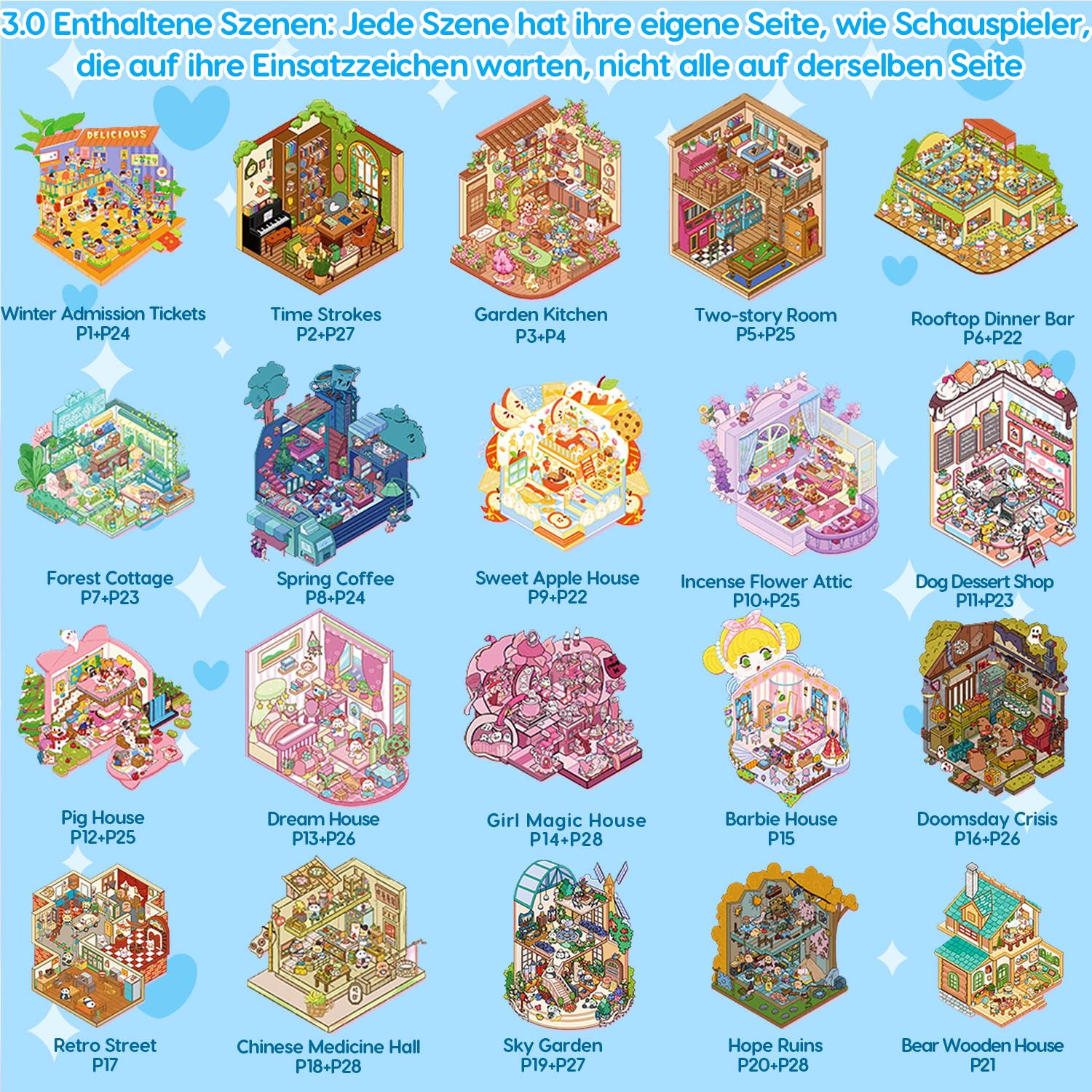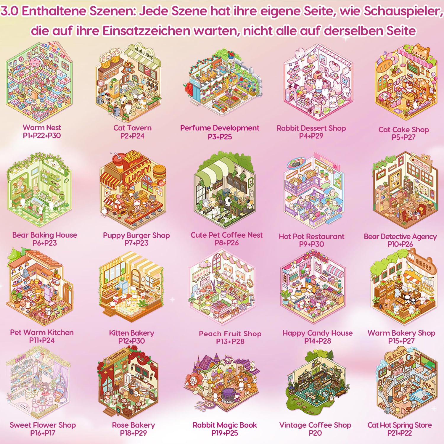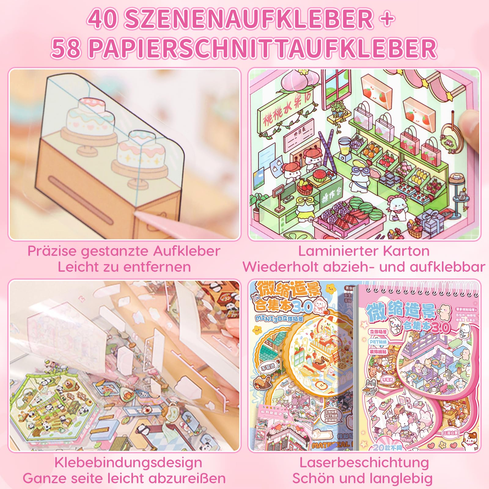 • 【40 Stück 3D House Sticker Scene Set】Dieses entzückende, wiederverwendbare Aufkleberbuch-Set enthält 40 einzigartige 3D-Haus-Szene-Aufkleber, 58 wiederverwendbare, präzise ausgestanzte PET-Aufkleber pro Blatt und 2 präzise gebogene Zangen. Die sorgfältig entworfene Miniaturwelt bietet kunstvoll gestaltete kleine Szenen, von Bäckereien, Arcades, Wasserparks, Kuchengeschäften, Hamburgerrestaurants, Supermärkten bis hin zu Modeboutiquen. Jedes Aufkleber-Set steht im Mittelpunkt niedlicher Cartoonfiguren, gefüllt mit kindlicher Unschuld und Freude