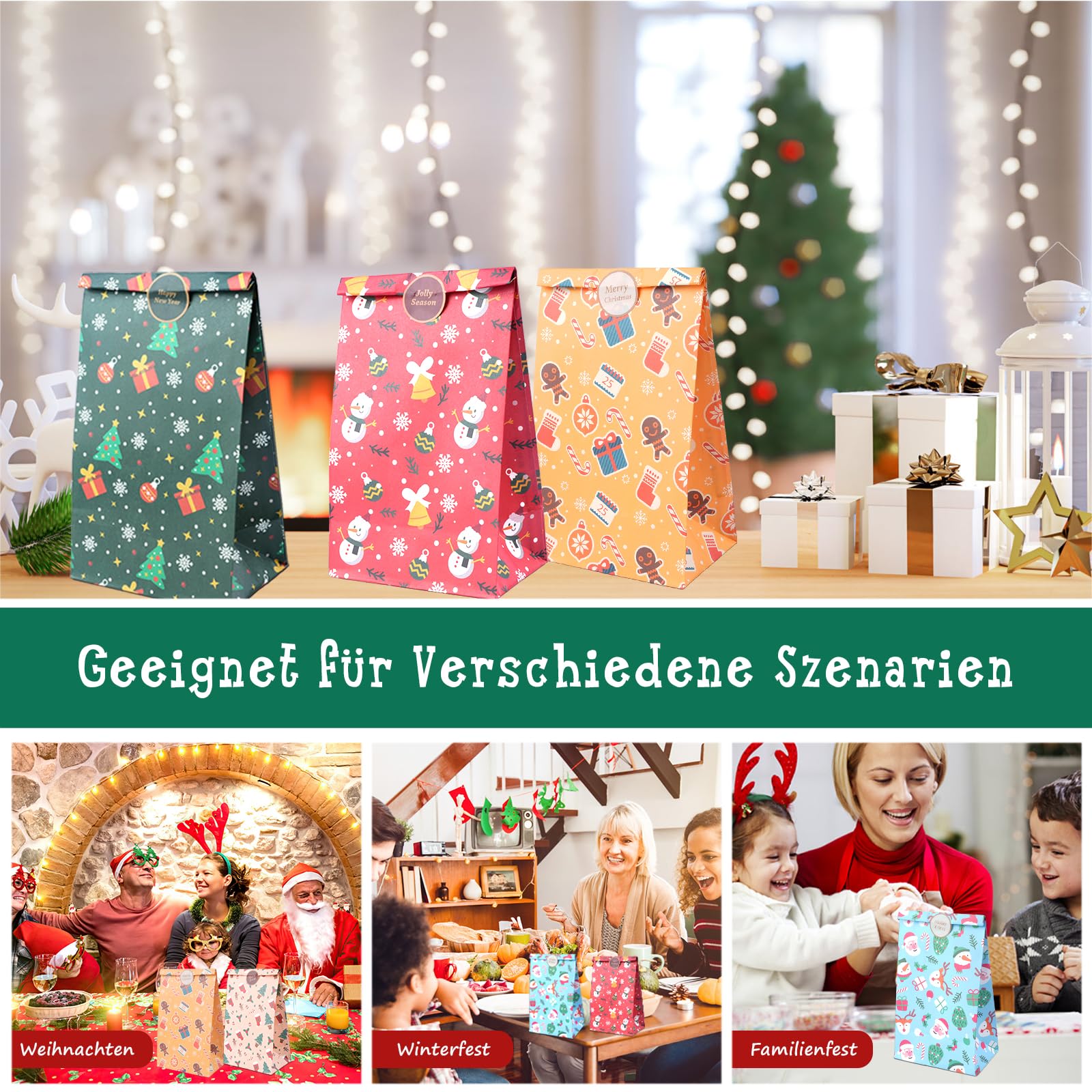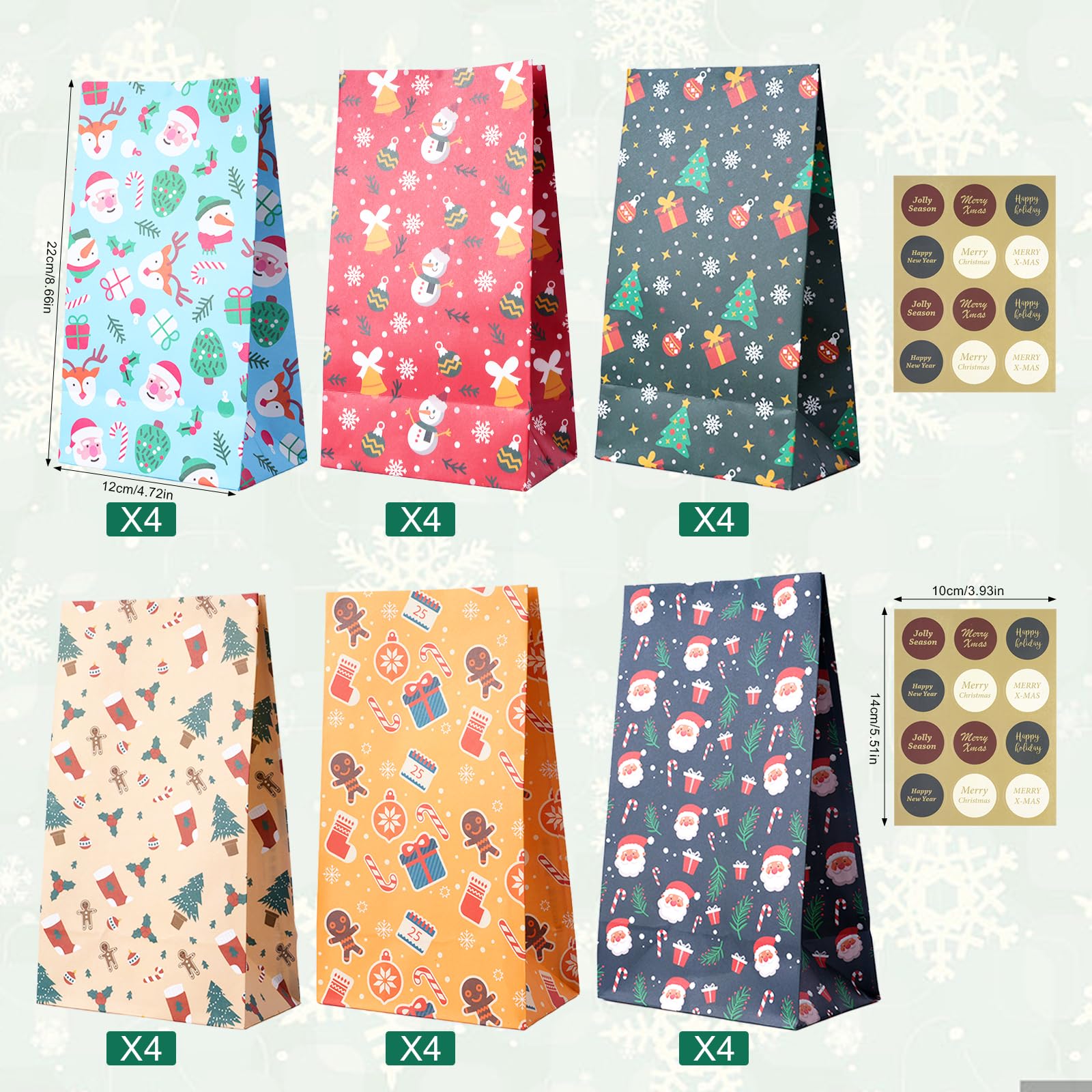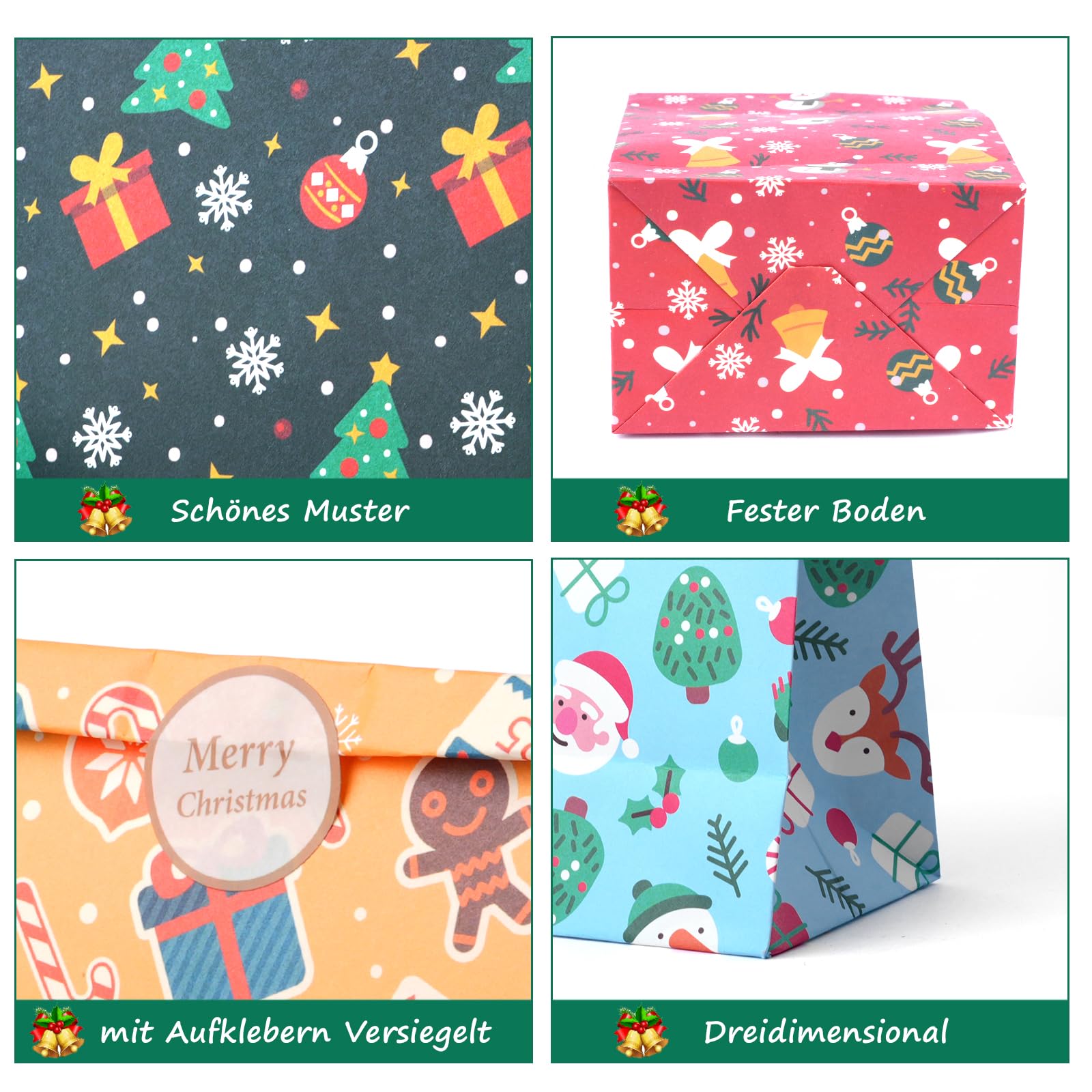 Deepton Geschenktüten Weihnachten, 24 Stück Weihnachtstüten Klein mit Aufklebern, Bunte Papiertüten Weihnachten zum Befüllen, Multifunktionale Papier Tüten für Kekse, Klein Geschenke, Partys