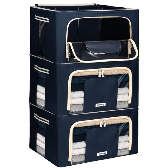 4CONVY Kleideraufbewahrung Kleiderschrank Box mit Reissverschluss Metallrahmen - grosse faltbare stapelbare Aufbewahrungsbox -3x24L Aufbewahrungstaschen - Kleiderbox für Bettdecke Kleidung Aufbewahrung