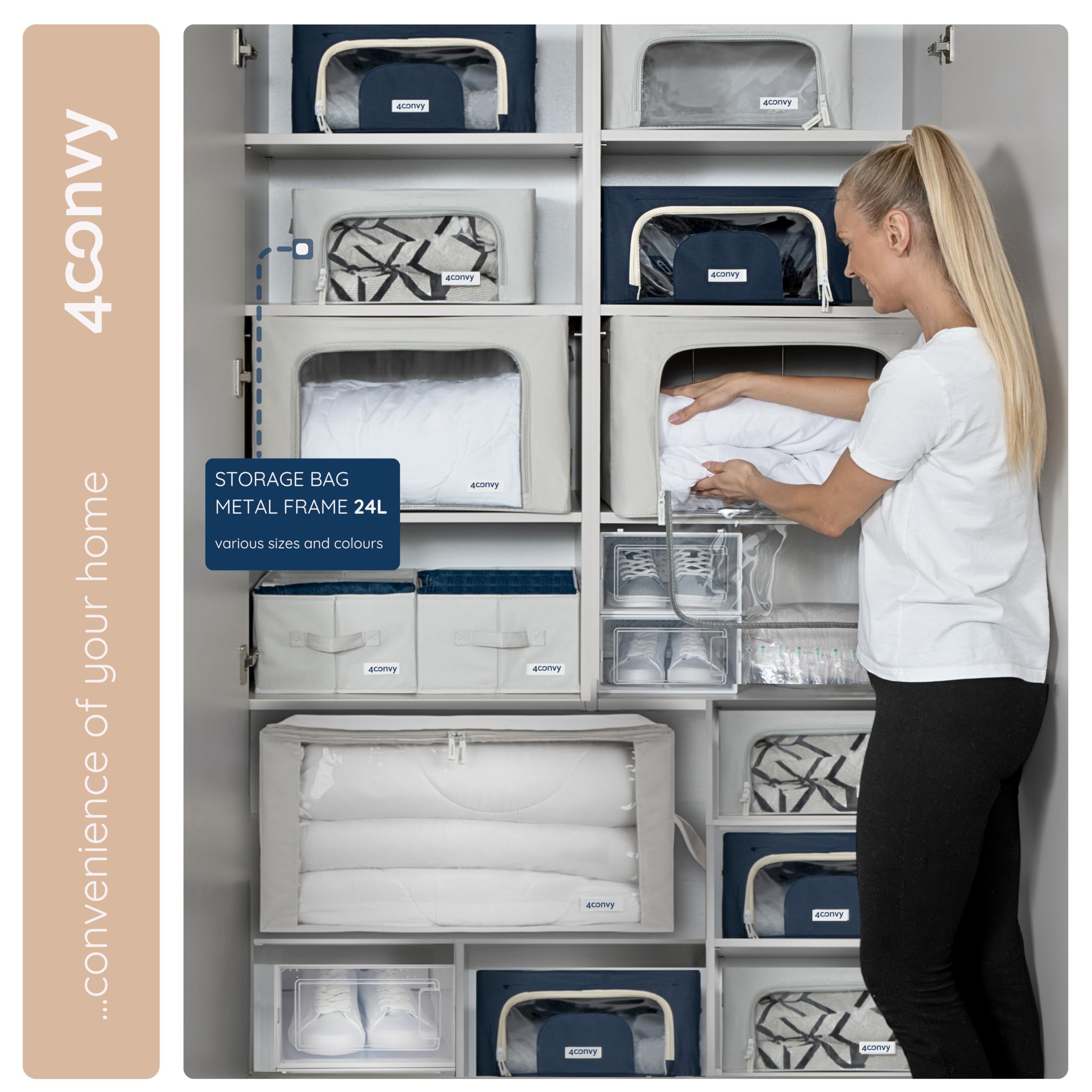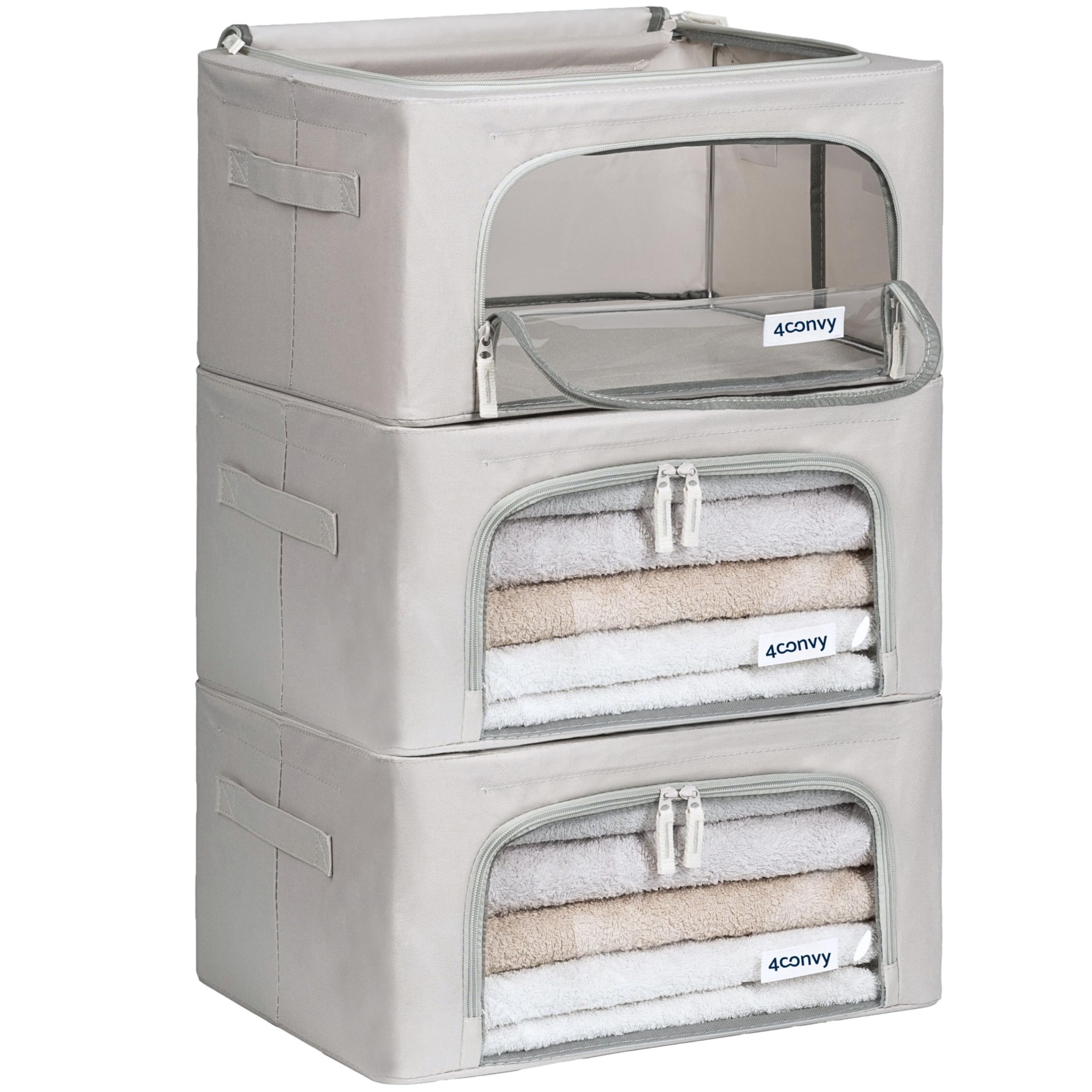 4CONVY Kleideraufbewahrung Kleiderschrank Box mit Reissverschluss Metallrahmen - grosse faltbare stapelbare Aufbewahrungsbox -3x24L Aufbewahrungstaschen - Kleiderbox für Bettdecke Kleidung Aufbewahrung