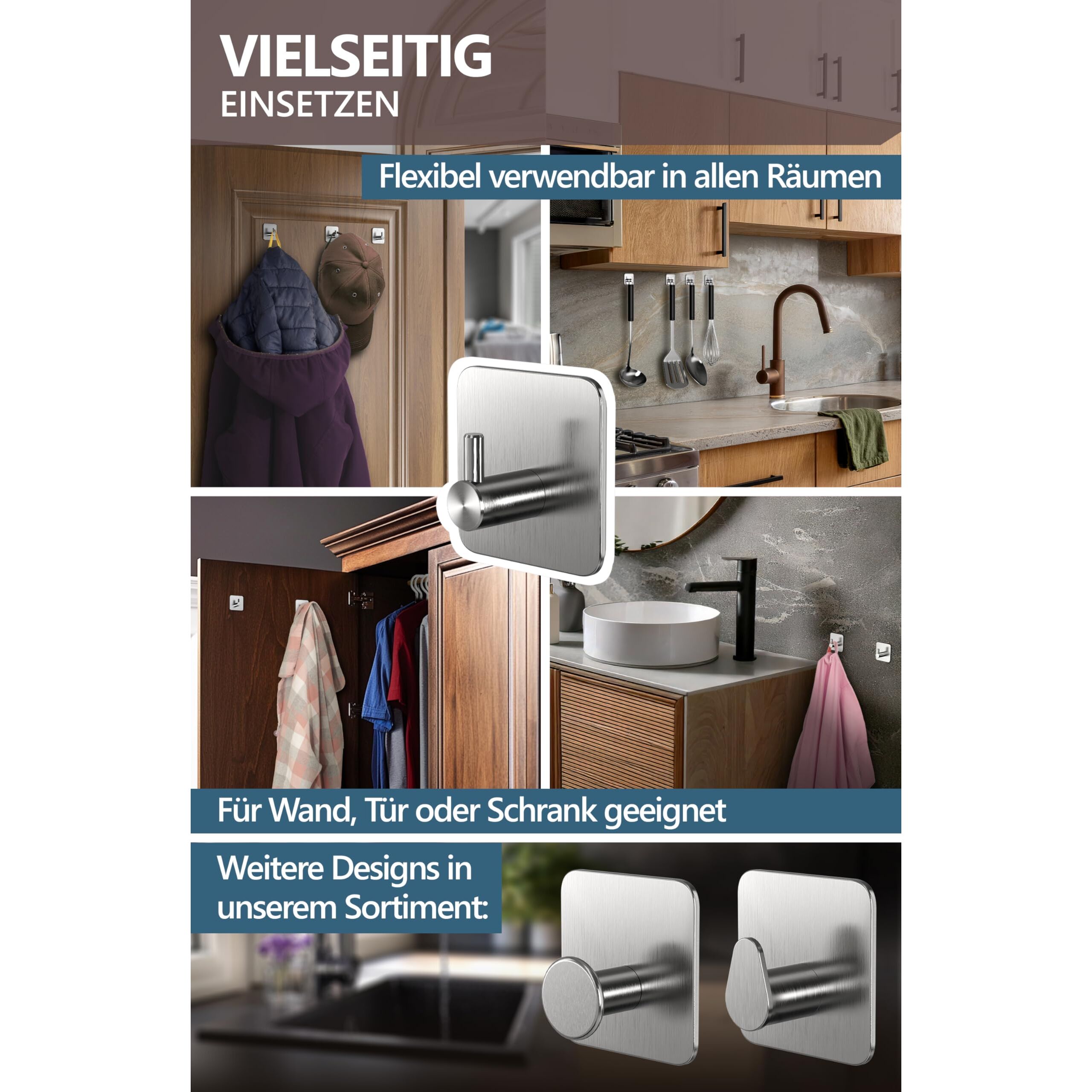 • VIELSEITIG EINSETZEN: Handtuchhaken selbstklebend lassen sich flexibel als Handtuchhalter Küche, Kleiderhaken selbstklebend im Wohnzimmer an Türen oder Schränken einsetzen - die echten Must Haves für erste Wohnung