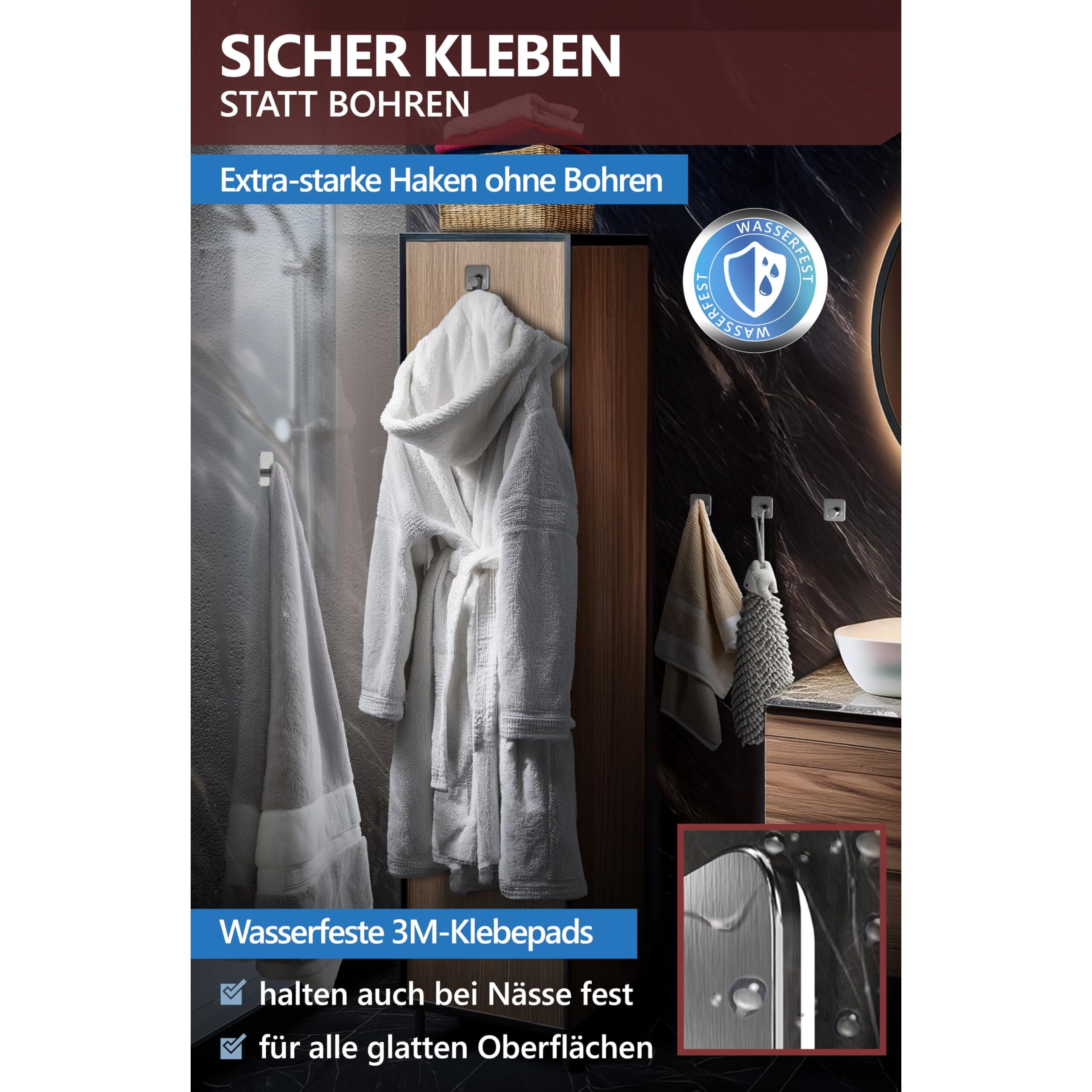4smile Handtuchhalter ohne Bohren, Silber - 6 Stück Badezimmer Handtuchhalter, Klebehaken aus Edelstahl, moderne Haken für Bad, WC, Küche - Wasserfeste Haken selbstklebend, Handtuchhaken