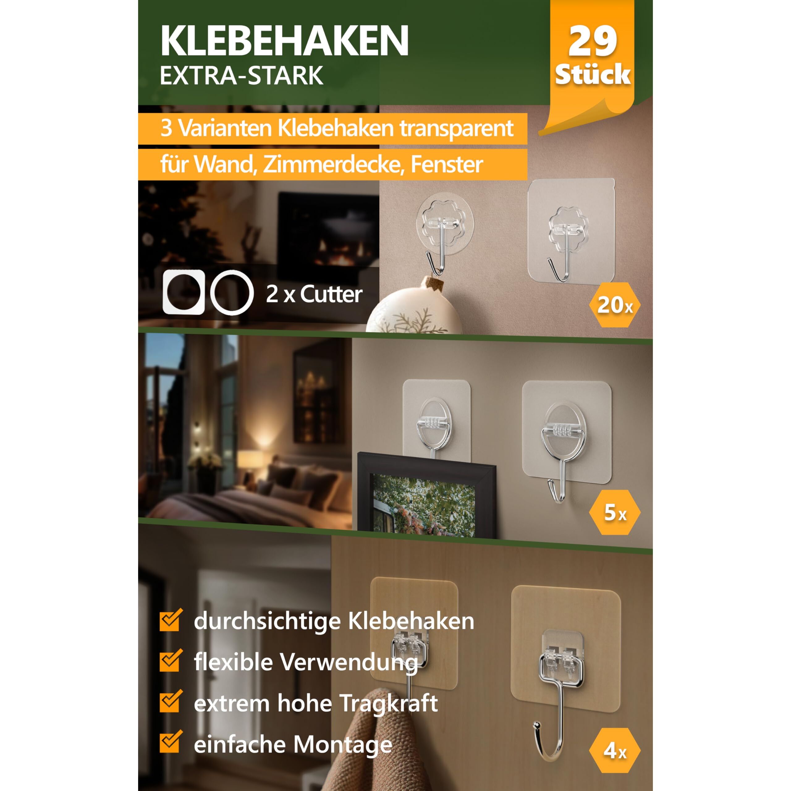4smile Klebehaken extra-stark - 29 Stück Mix-Set mit 3 Varianten selbstklebende Haken transparent - Kleiderhaken selbstklebend
