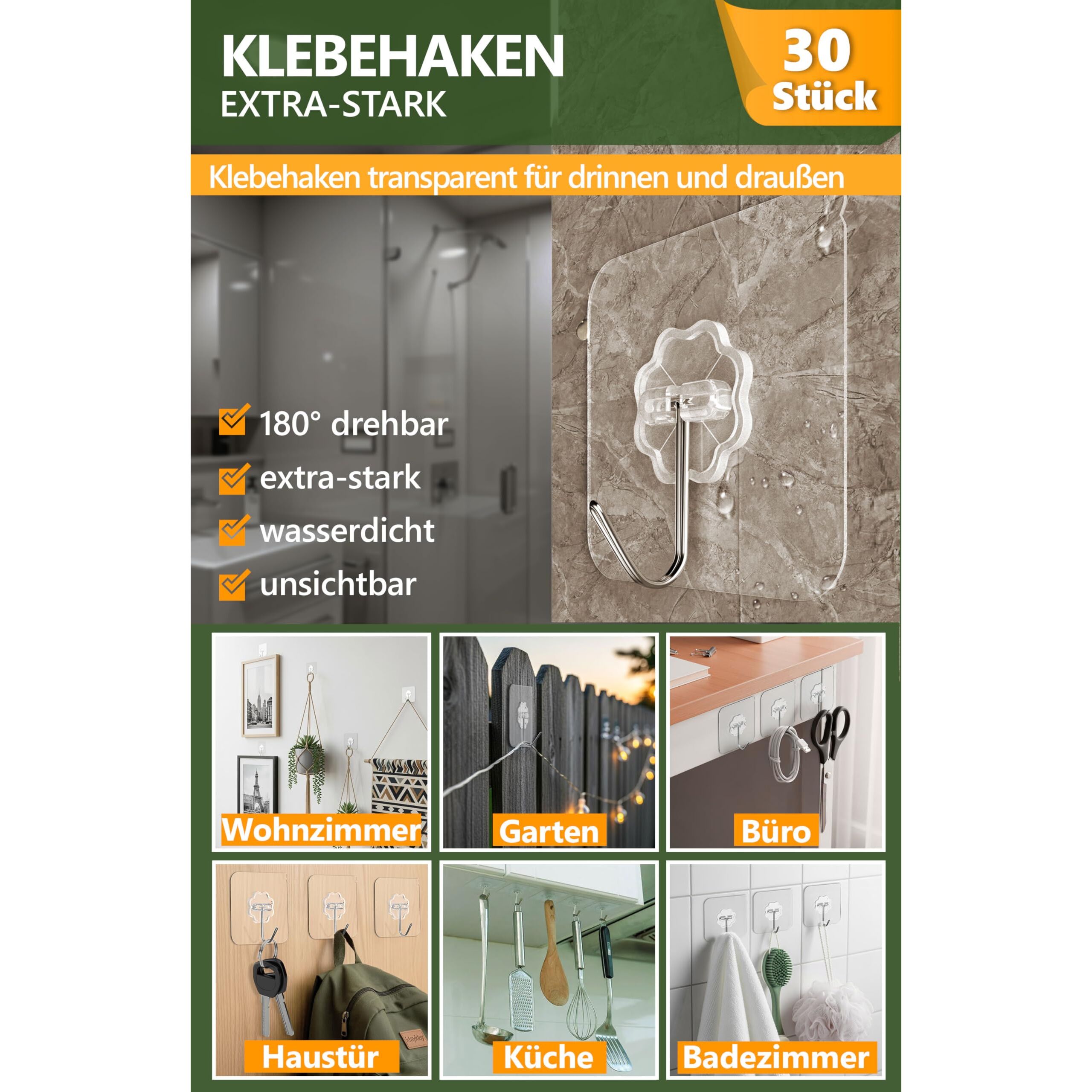 4smile Klebehaken extra stark, 30 Stück, 10 kg Klebehaken outdoor wetterfest, wasserdichte Haken selbstklebend, Wandhaken selbstklebend, transparent - Decke und Wand, Mehrzweck für Küche, Bad