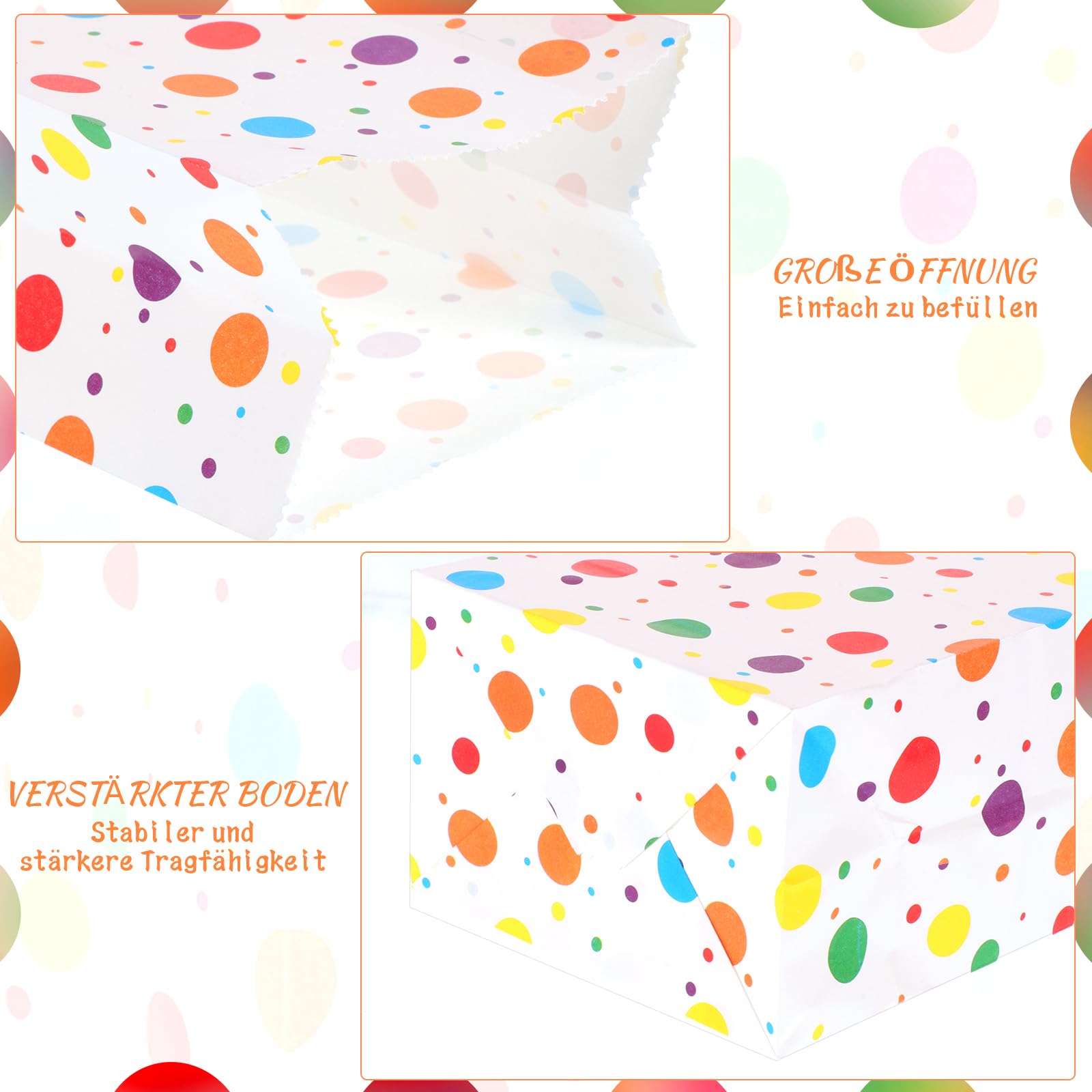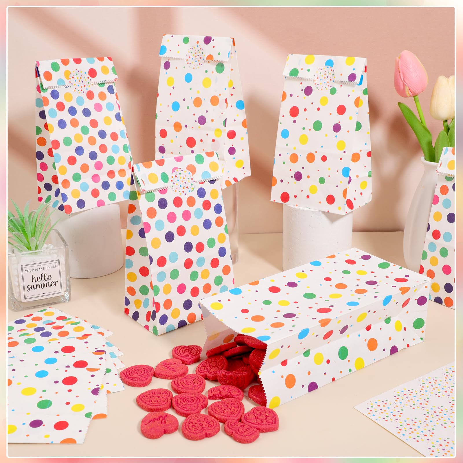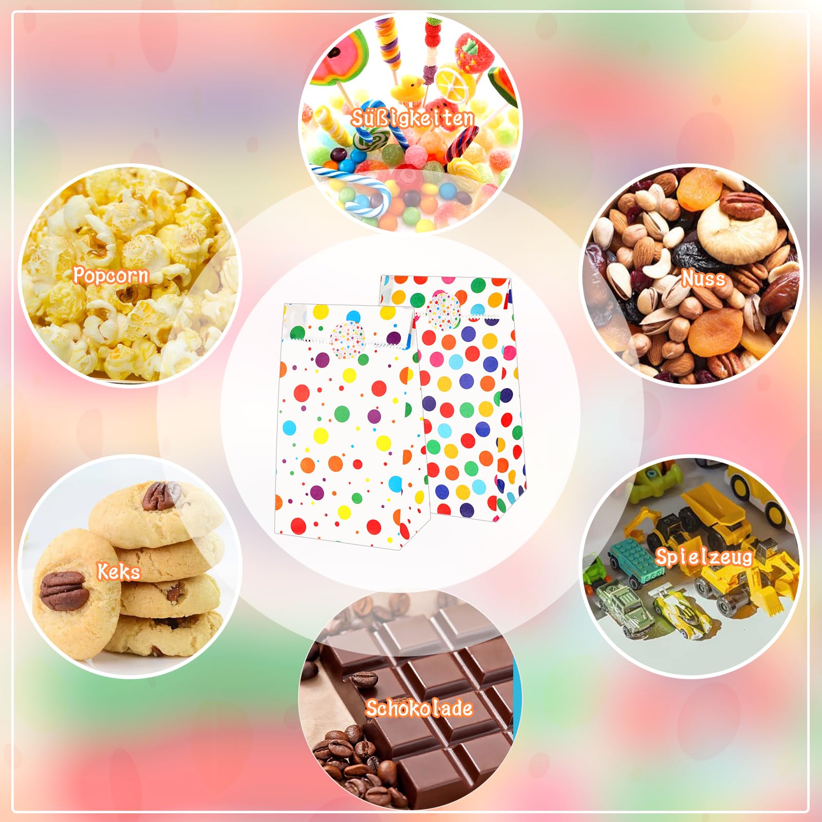 50 Stück Papiertüten Kindergeburtstag Klein, 18 x 9 x 5,5 cm Geschenktüten Klein mit 60 Aufkleber Regenbogen Punkte Mitgebsel Candy Tüten für Valentinstag Ostern Hochzeit Geburtstag Party