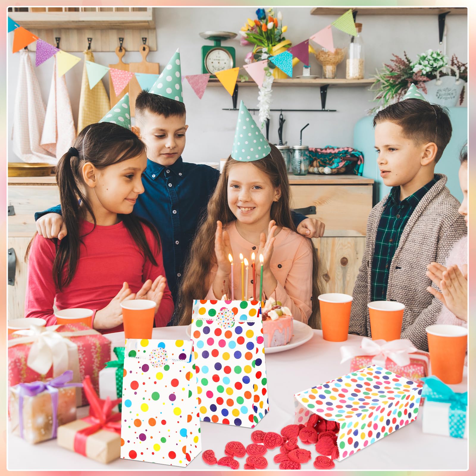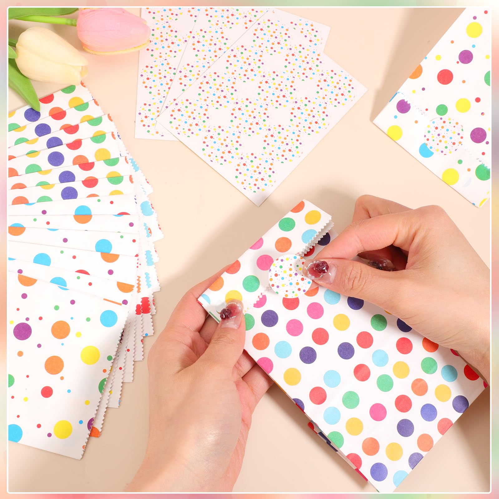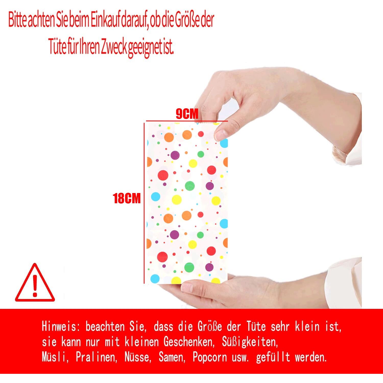 50 Stück Papiertüten Kindergeburtstag Klein, 18 x 9 x 5,5 cm Geschenktüten Klein mit 60 Aufkleber Regenbogen Punkte Mitgebsel Candy Tüten für Valentinstag Ostern Hochzeit Geburtstag Party