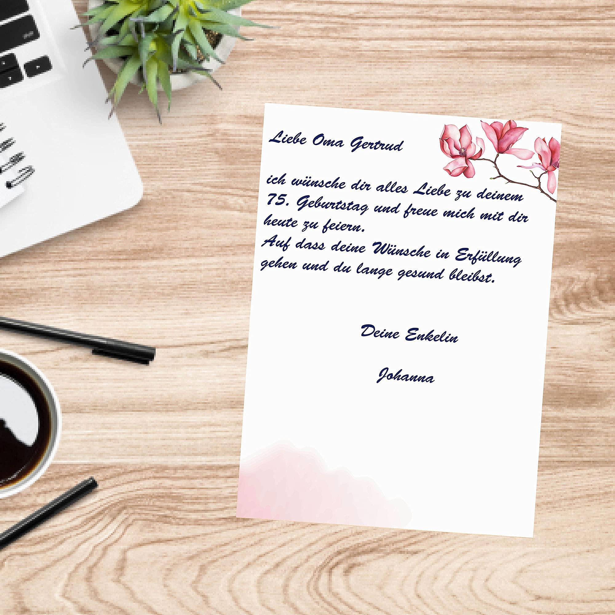 Produktbeschreibung Produktbeschreibung:Mit diesem edlen Briefpapier im rosa Aquarell-Blumen Look kannst du wunderschöne Briefe, Gedichte, Einladungen, Liebeserklärungen, oder vieles mehr selbst bedrucken oder beschreiben. Ein hochwertiges Papier wertet deinen Brief auf und schafft eine Erinnerung, die man immer wieder gerne liest.Das Briefpapier im Detail:50 Blatt DIN A4120 Gramm pro m2Rosa Aquarell & Blumen LookBeidseitig BedrucktFür Laser und Tintenstrahldrucker geeignetMade in Germany