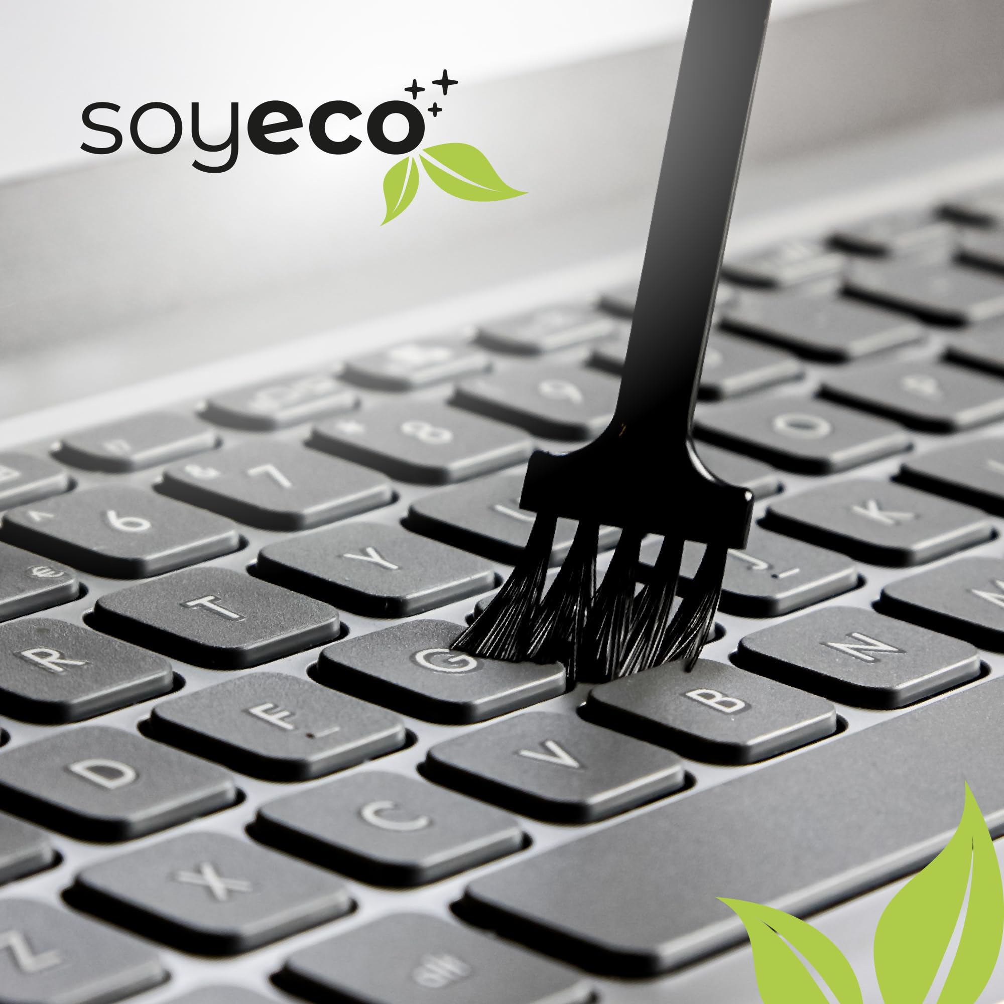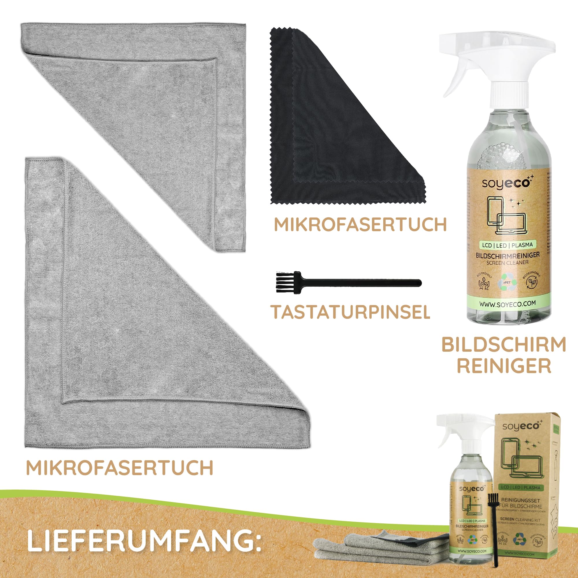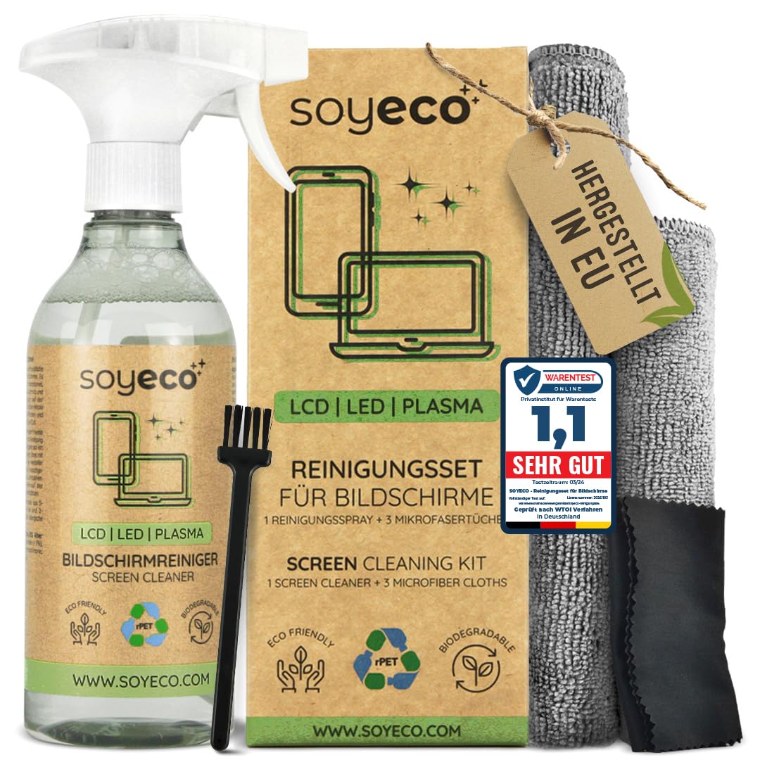 SOYECO ECO Bildschirmreiniger Set 500ml mit 2X Mikrofasertücher & Pinsel - für eine umfassende Gerätepflege - Fernseh Displays (LCD, LED, OLED, QLED, TFT), Handy, Laptop sowie Tastatur, PC & uvm.