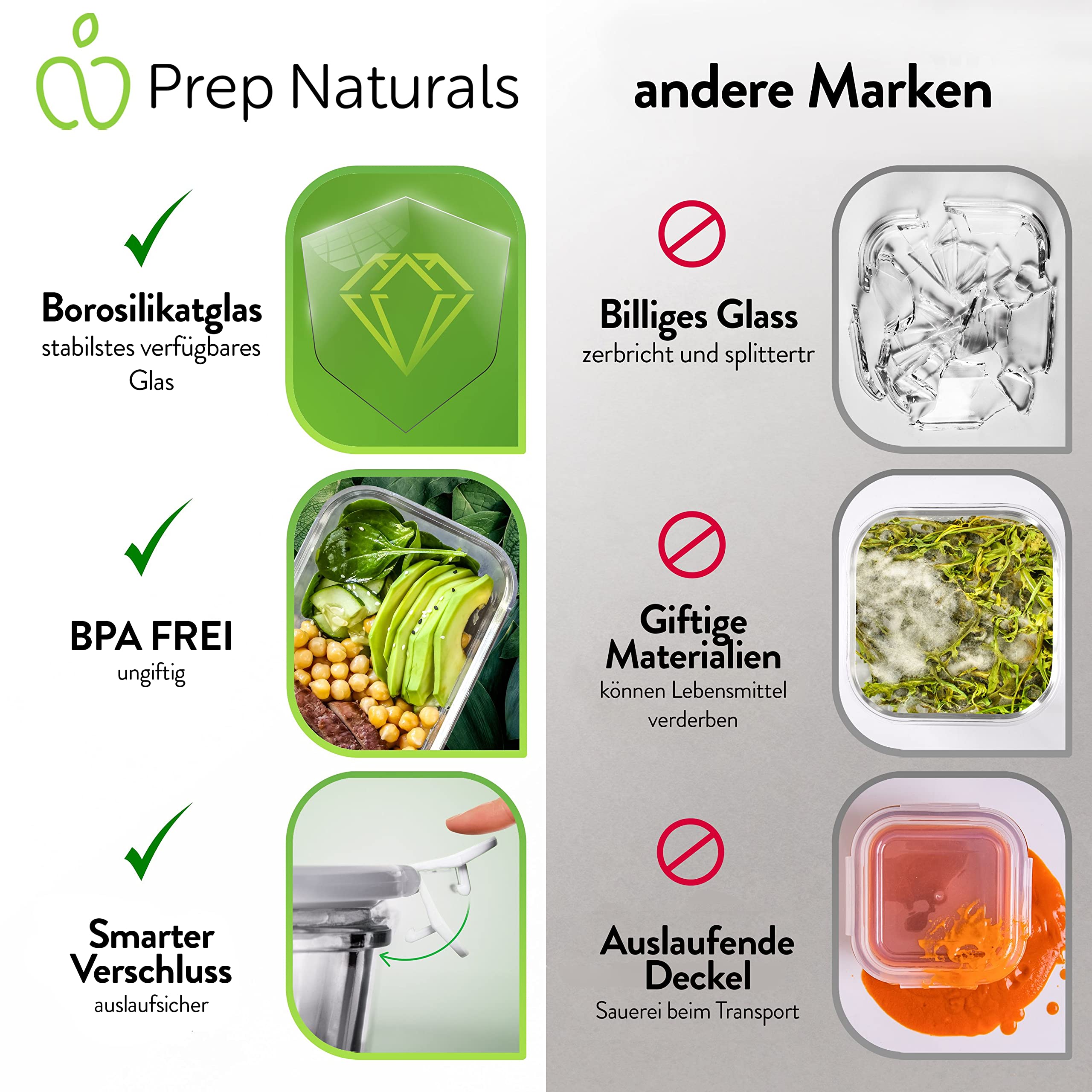 Glas-Tupfer-Set, die sichere und bequeme Art und Weise Ihre Mahlzeiten aufzubewahren und zu transportieren, wenn Sie eine Reihe von Meal Prep Boxen in Ihrem Leben besitzen, haben Sie wahrscheinlich schon gelernt, Qualität zu schätzen wissen. Behälter von niedriger Qualität dichten nicht fest ab und auch hochwertige Kunststoffe neigen dazu, sich beim regelmässigen Einfrieren und Erhitzen zu verziehen oder zu beschädigen. Prep Naturals Glasbehälter für Lebensmittel mit intelligentesten Verschlussdeckeln sind die Lösung für dieses Problem. Kunststoffbiegen und Glas sind absolut sicher für den Einsatz im Gefrierschrank, Ofen oder Mikrowelle. Unsere Vorratsdosen halten Ihre Mahlzeiten sicher und frisch, egal was passiert. Jeder Schliesskasten kann mit dem fortschrittlichen intelligenten Verriegelungssystem dicht verschlossen werden. Bei Nichtgebrauch können die Box und der Deckel von Hand oder in der Spülmaschine gereinigt werden, ohne das Material zu verziehen oder zu beschädigen. Kein Verschütten, kein Verderben mit den intelligentesten Verschlussdeckeln. Das cleverste System ermöglicht eine absolut luftdichte Abdichtung Ihrer Mahlzeiten und verhindert Verschütten. Gleichzeitig sind die Deckel unglaublich einfach zu montieren: Deckel aufsetzen und die vier seitlichen Klappen einrasten - fertig. Kein Kraftaufwand zum Öffnen und Schliessen erforderlich. Deckel löst sich nicht versehentlich ab. Luftdichte Lagerung für Tage, Wochen oder Monate. Sowohl Behälter als auch Deckel zusammen erhitzen, einfrieren oder waschen. Gehen Sie durch den Tag, mit Ihren Mahlzeiten immer griffbereit. Das Lebensmittel-Vorratsdosen-Set aus Glas von Prep Naturals macht Ihren Tag viel bequemer. Arbeiten Sie lange Stunden am Tag? Kochen Sie einfach Ihre Lieblings-Mahlzeiten am Wochenende, frieren Sie sie individuell ein und sparen Sie Zeit nach Ihrer Schicht! Müssen Sie Mahlzeiten für die ganze Familie bereitstellen? Machen Sie einfach was Leckereien. Sie lieben und portionieren die Mahlzeiten individuell. Mit Platz für 32 Unzen können Sie eine vollständige Mahlzeit für lange Ausflüge in die Natur packen oder Ihre tägliche Verzehrmenge bei der Diät leicht kontrollieren.