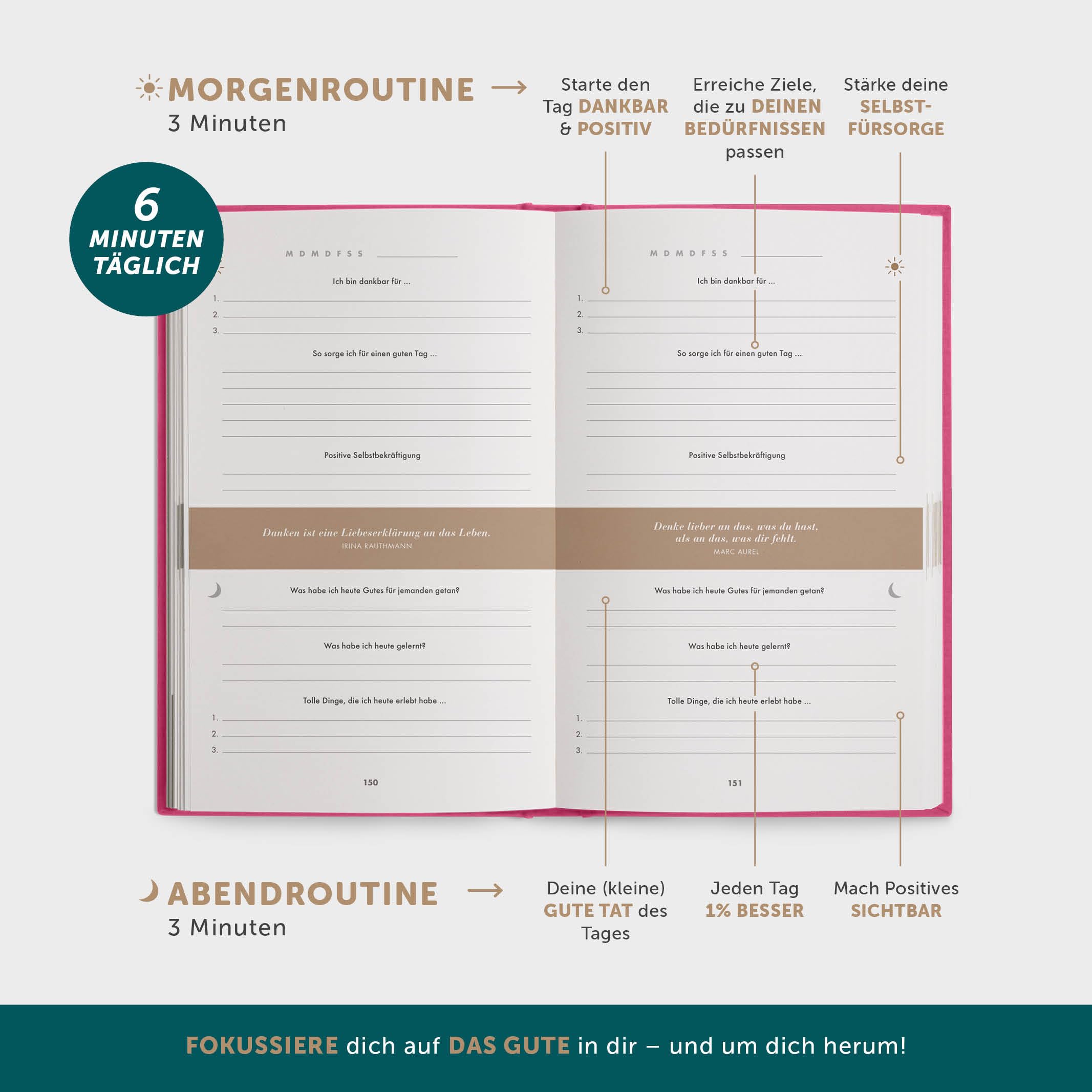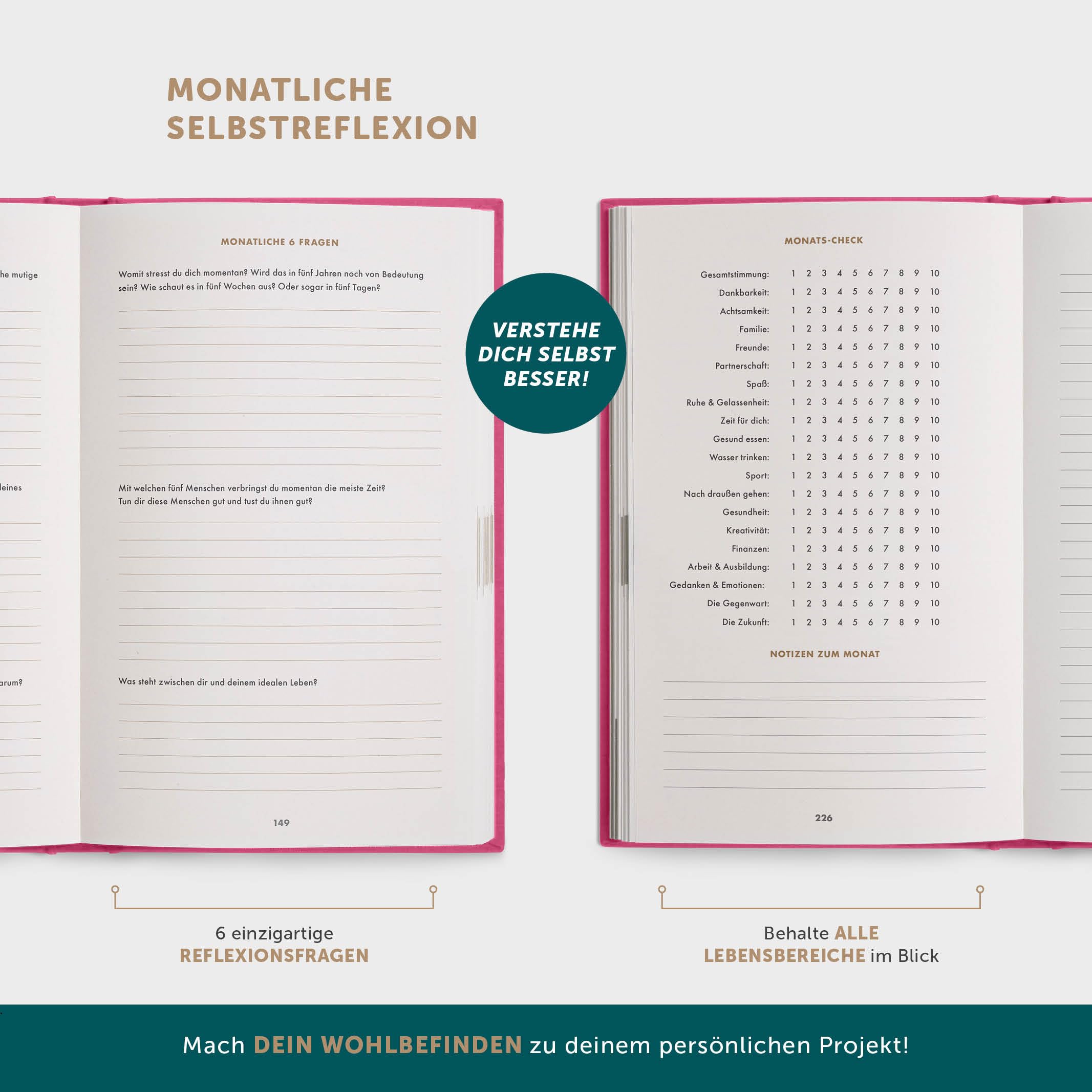 • ✅ Gezielte SELBSTREFLEXION für mehr FOKUS auf FORTSCHRITT und das GUTE in dir und um dich herum – Mit diesem Achtsamkeitstagebuch 2026 findest du heraus, WAS dich glücklich macht und holst durch tägliches Journaling MEHR DAVON in dein Leben. Fokussier Dich auf das, was Dich wirklich erfüllt!
