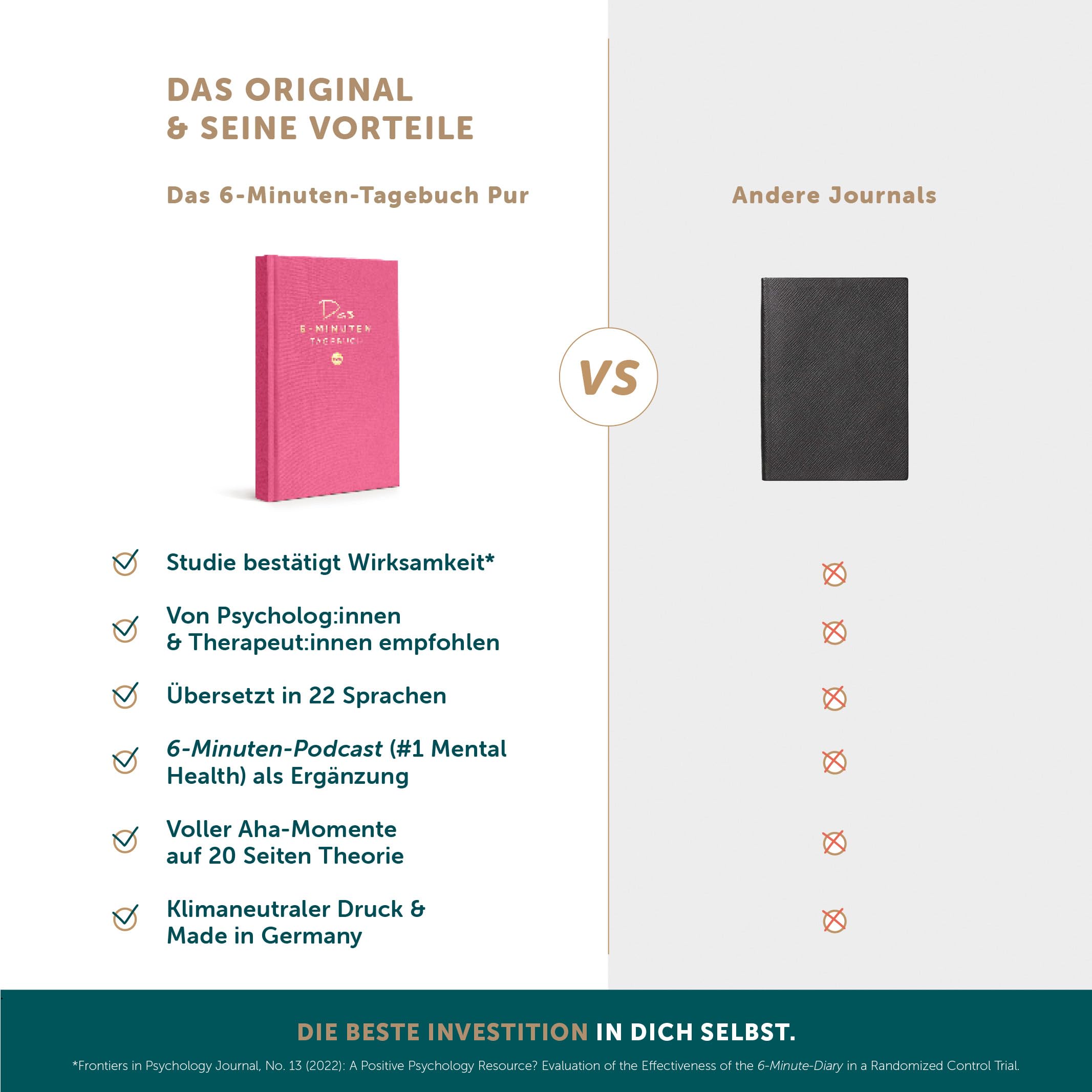 Entfalte dein Potenzial mit dem bewährten 5 Minuten TagebuchSteigere dein tägliches Wohlbefinden mit dem 6 Minuten Tagebuch 2024, einem effektiven Tagebuch für Erwachsene 365 Tage, das auf den Grundsätzen der positiven Psychologie basiert. Dieses daily Journal bietet eine strukturierte Anleitung, die darauf ausgelegt ist, Dankbarkeit, Achtsamkeit und persönliches Wachstum in deinem Leben zu fördern.Sind Sie bereit, Ihr Leben in nur sechs Minuten pro Tag mit dem Tagebuch Depression zu verändern? - Effiziente Tagesreflexion - Basiert auf positiver Psychologie - Fördert Achtsamkeit und Dankbarkeit - Nachhaltige, vegane MaterialienDas 6 Minuten Tagebuch liniert ist mehr als nur ein Journaling Buch; es ist ein Lebensveränderer. Mit täglichen Einträgen, die weniger als fünf Minuten in Anspruch nehmen, ist es das perfekte 5 min Tagebuch für beschäftigte Menschen. Es nutzt die Kraft der kleinen Schritte, um grosse Veränderungen herbeizuführen.Warum sollten Sie sich für dieses Reise Tagebuch für Erwachsene Frauen entscheiden? - Tägliche Motivation leicht gemacht - Wissenschaftlich fundiertes Konzept - Unterstützt positive Lebensgewohnheiten - Journals Qualität aus Deutschland