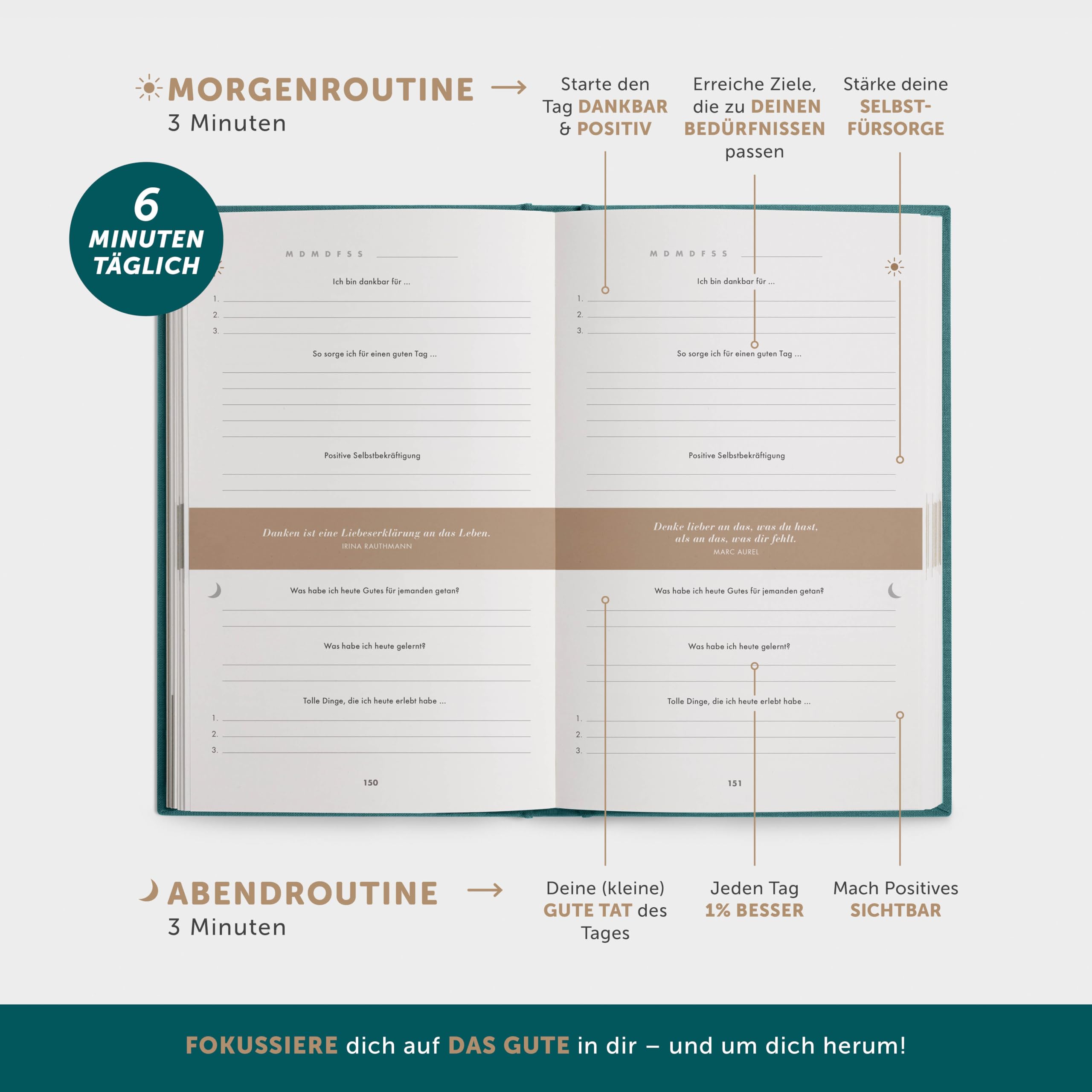 6-Minuten® Tagebuch für Erwachsene 2026 (Das Original) – Mehr Achtsamkeit, Selbstliebe & Resilienz – Dankbarkeitstagebuch, Journal Buch – in 22 Sprachen übersetzt