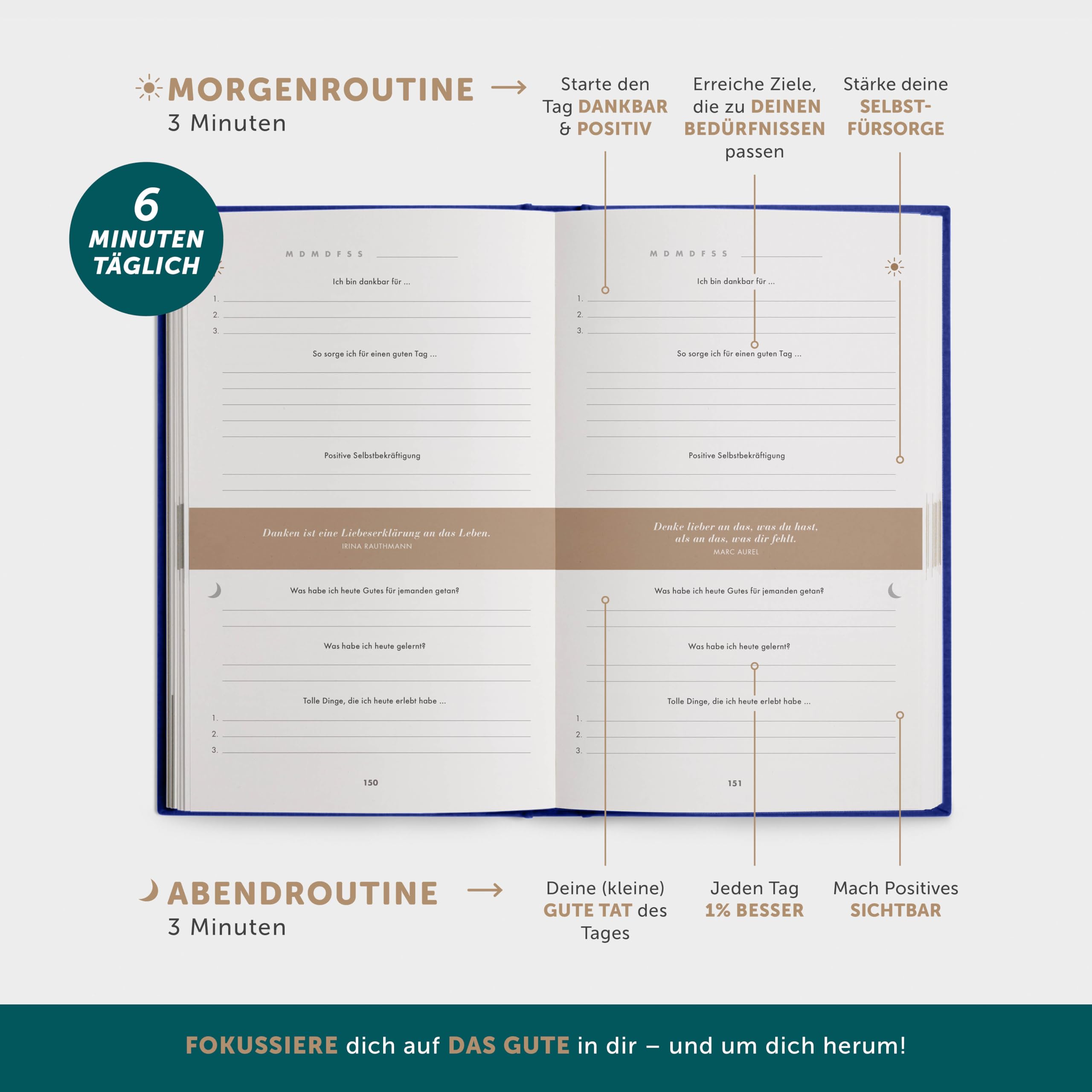 • ✅ Qualität von INNEN & AUssEN: Feinstes Französisches Leinen, Co2-neutraler Druck, vegane Materialien. Mit Liebe in Deutschland gedruckt & gebunden. – Ein Gratitude Journal ohne Motivationsgelaber, Feenstaub & Wischiwaschi. Ein Glückstagebuch, mit dem du mentale Stärke aufbaust