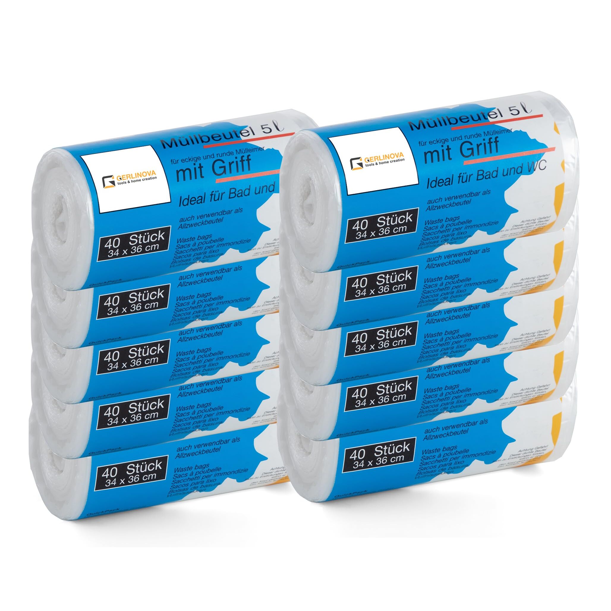 400 Stück Müllbeutel Premiumline: 5 Liter, 10er Pack, Grösse: 34 x 36 cm - Besonders reissfest und wasserdicht - Mit Trage-Griff/Henkel