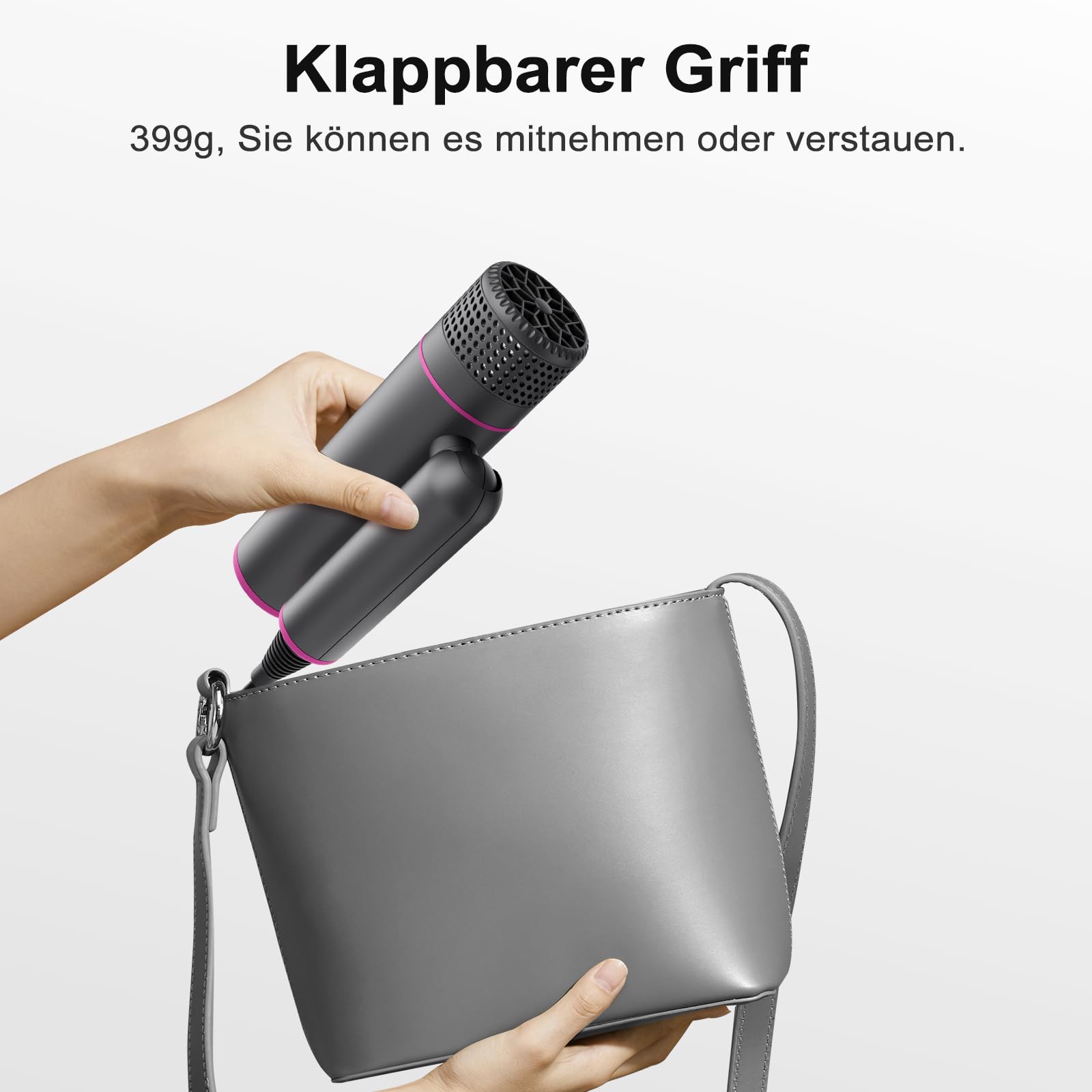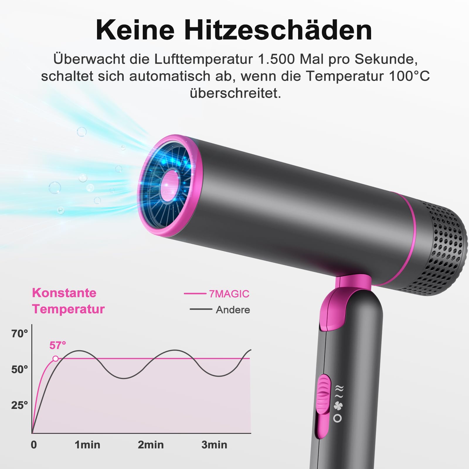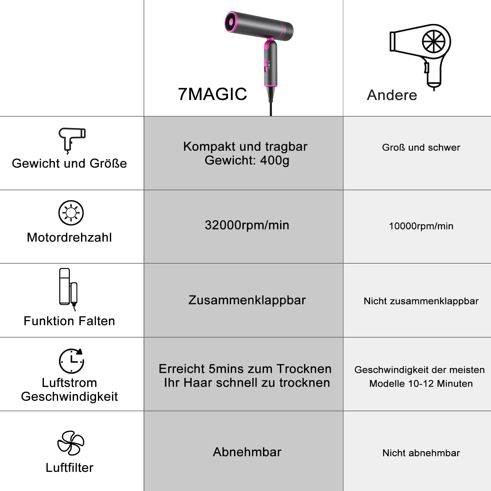 7MAGIC Fön Haartrockner Föhn mit Diffusor, Reisefön Klappbar, 30% Schnellere Trocknung, 300 Mio. Ionen, 99% Haarsaugschutz, Überhitzungsschutz, 1600W, Ultraleicht für alle Haartypen, Grau