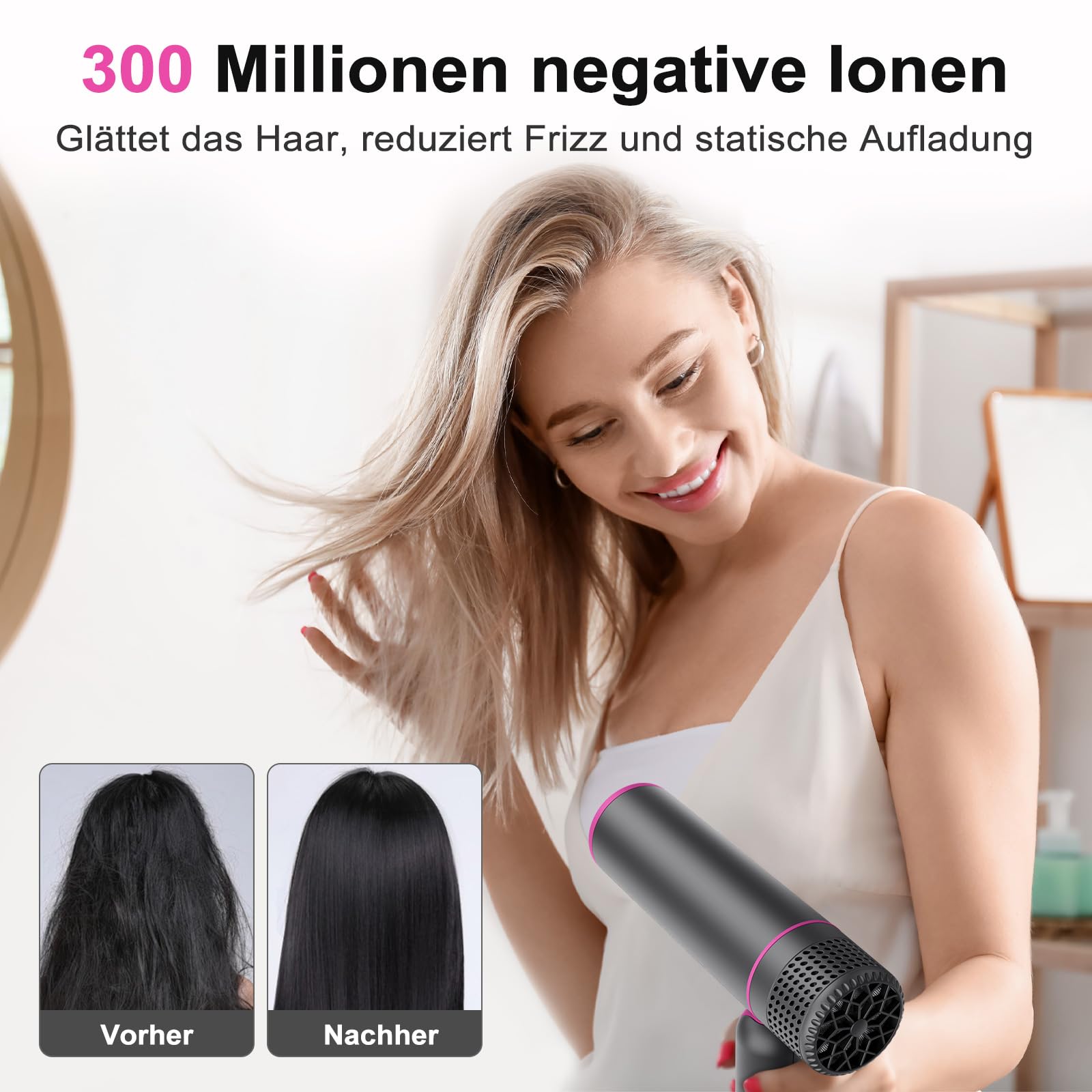 Hauptmerkmale des haartrockner: 5 Minuten zum schnellen Trocknen der Haare, 30 % schneller als andere Negativ-Ionen-Haartrockner. Abnehmbarer Luftfilter, 99 % Ihrer Haare werden nicht in den Trockner gesaugt. Kompakter Haartrockner mit unserer Aufbewahrungstasche, einfach zu transportieren. Einfach zu verstauen. Das leichte und schlanke Design hilft Ihnen, Armkrämpfe beim Trocknen Ihrer Haare zu vermeiden. 3 Temperatureinstellungen (KÜHL/WARM/HEISS) und 2 Geschwindigkeitseinstellungen (NIEDRIG/HOCH). Überhitzungsschutzeinstellungen. Einstellung des doppelten Überhitzungsschutzes 1. Wenn das Temperaturkontrollelement erkennt, dass die Temperatur den Sicherheitsbereich überschreitet, schaltet sich der schnell trocknende Haartrockner automatisch ein Ausschalten, um den Schutzmechanismus zu starten. 2. Die Thermosicherung kann unter extremen Bedingungen zum Schutz irreversibel durchbrennen Spezifikationen des leichten Haartrockners. Wattleistung: 1600 W Spannung: 220–240 V Hz-Bereich: 50/60 Hz Drehzahl: 32.000 U/min Windgeschwindigkeit: 18 m/s Grösse: 19,5 x 13 x 5,3 cm Gewicht: 399g