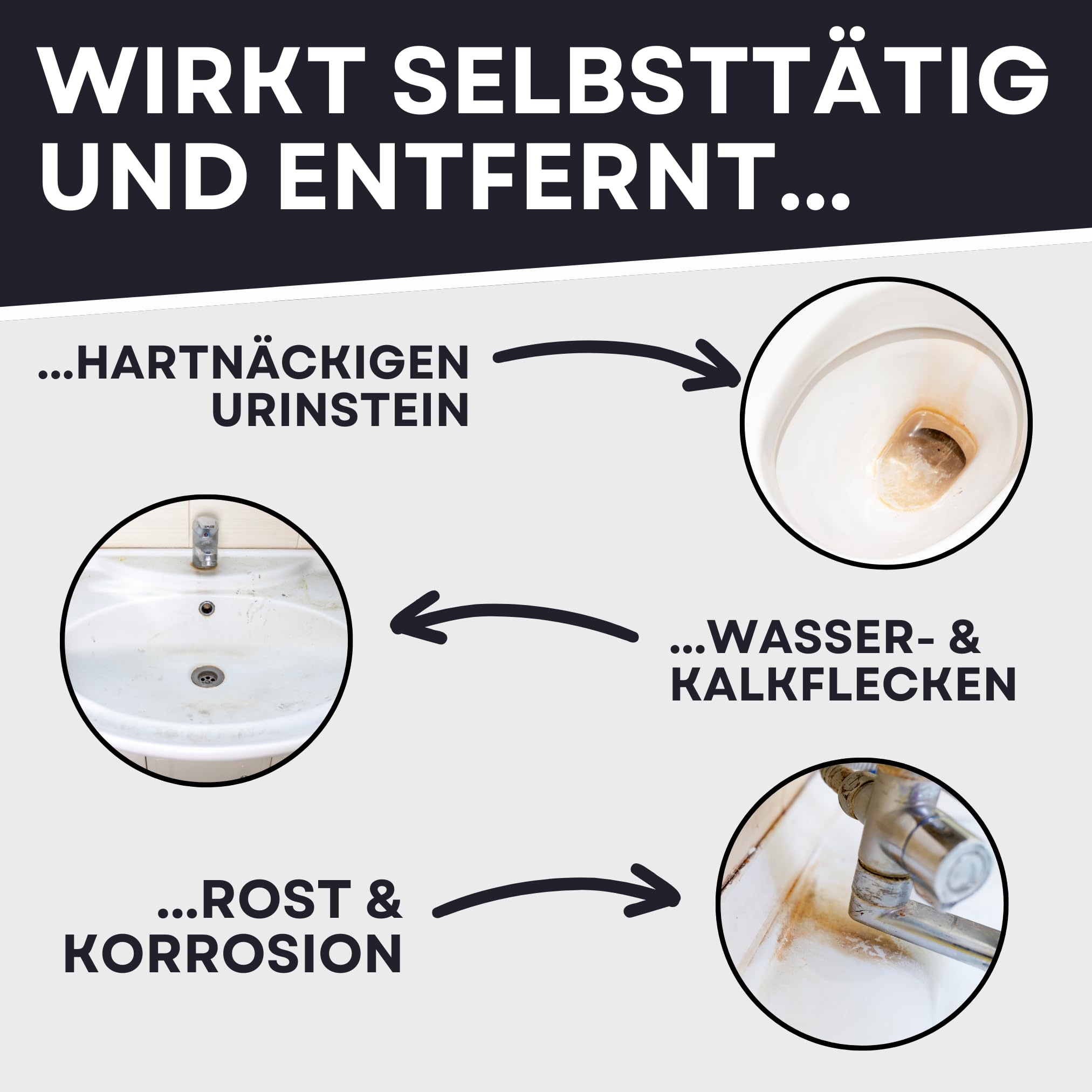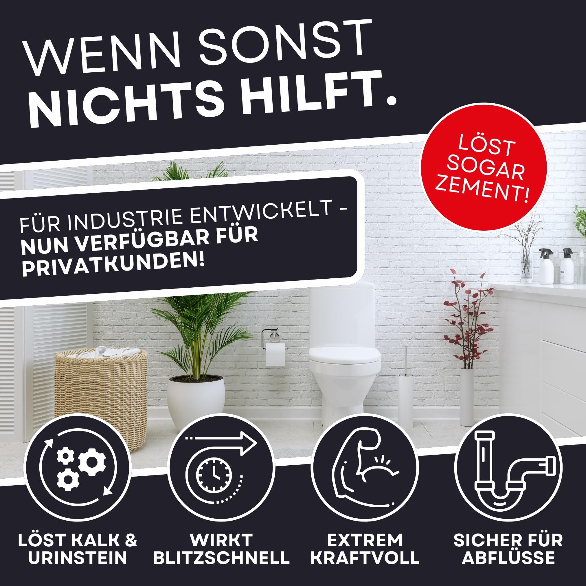 • ✅ VIELSEITIG EINSETZBAR: Unser Urinsteinlöser eignet sich ideal für Toiletten, Urinale, Waschbecken, Fliesen und Abflüsse. Er entfernt zuverlässig Rost, Kalk und Wasserflecken. In professioneller Industriequalität ist er nun auch verfügbar für private Haushalte! Bitte nicht auf verchromten Armaturen anwenden, da diese angegriffen werden können.