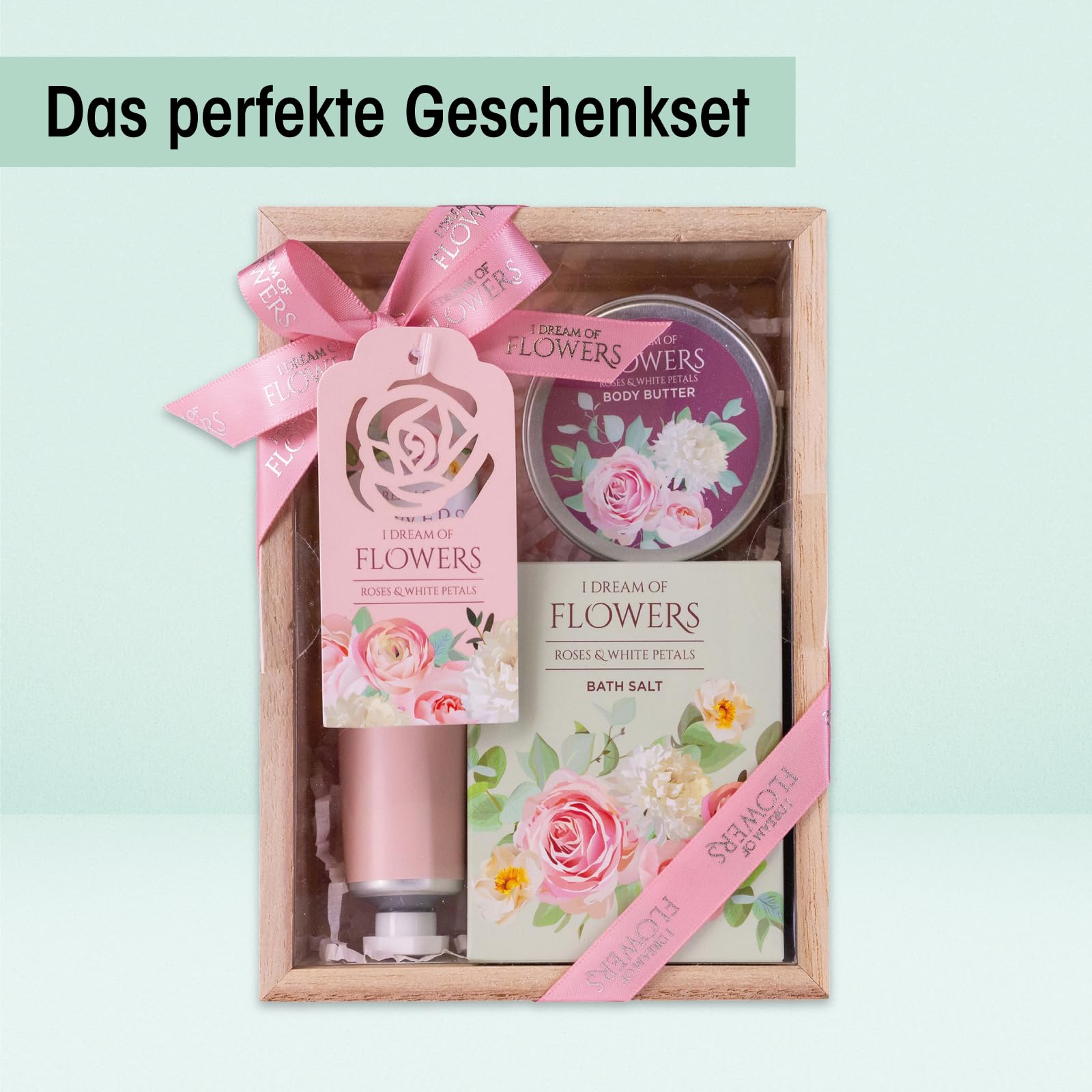Accentra – Badeset Frauen Geschenkset I DREAM OF FLOWERS in schöner Geschenkbox – 3-teiliges Pflegeset mit Handcreme, Körperbutter und Badesalz – Geschenk Set zum Valentinstag & Muttertag