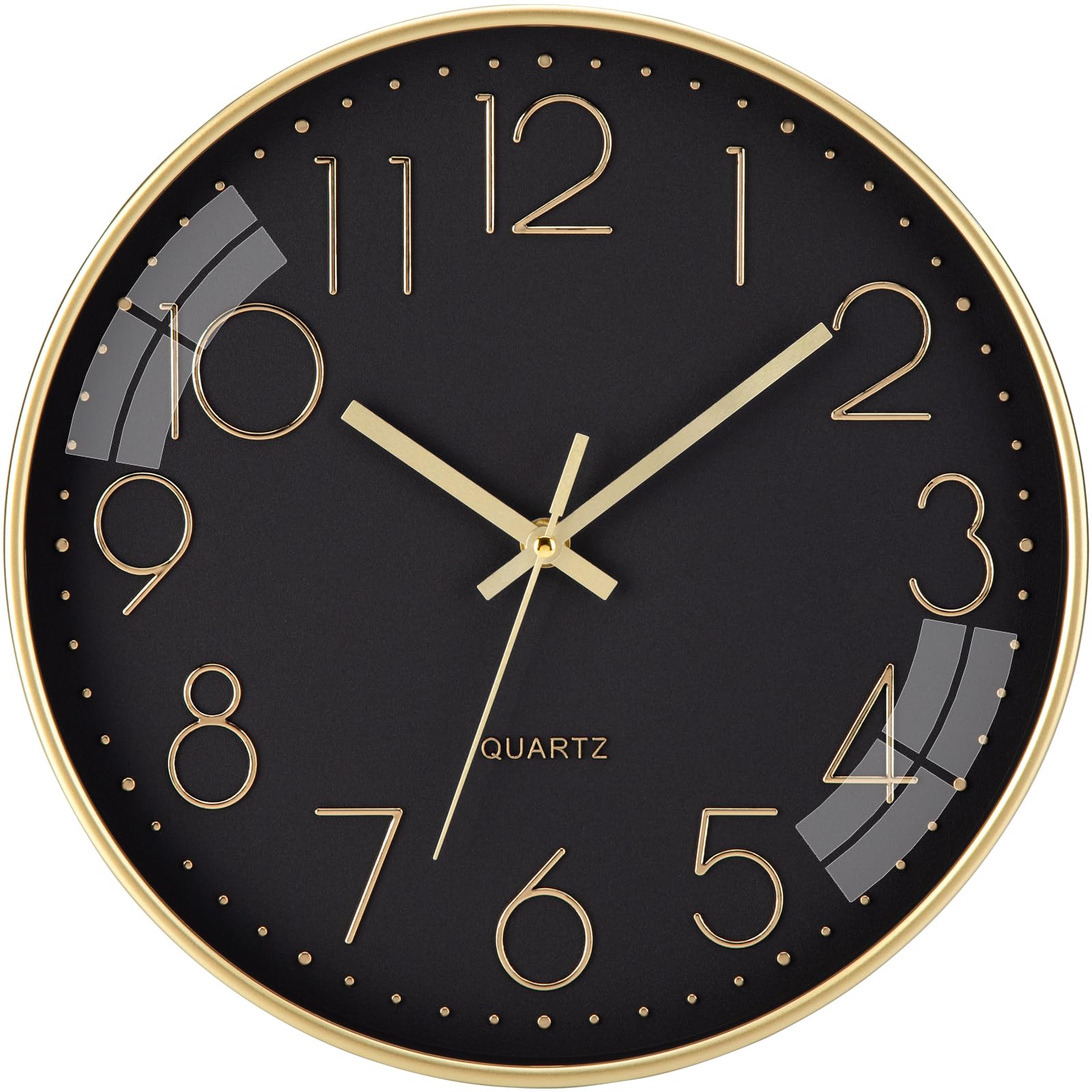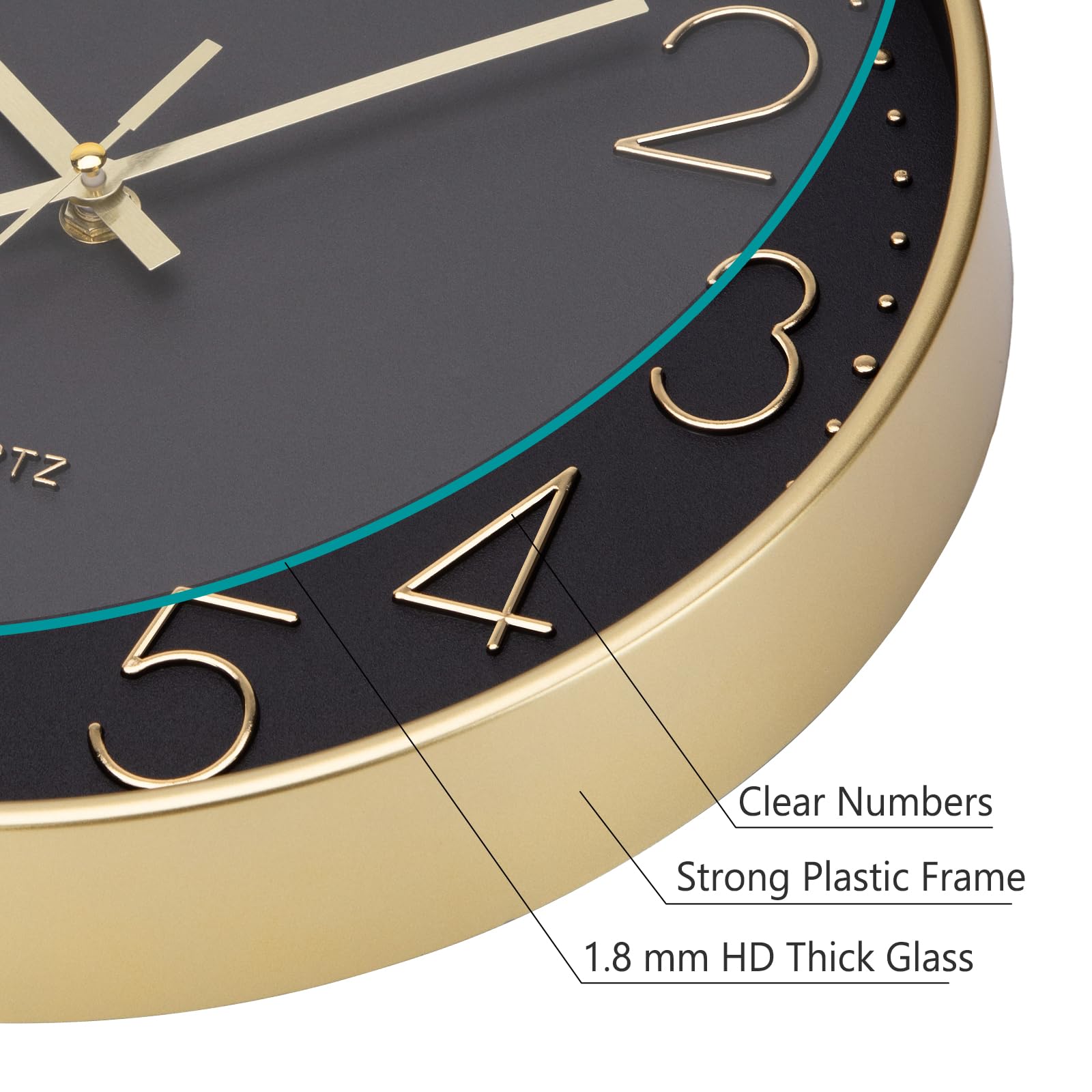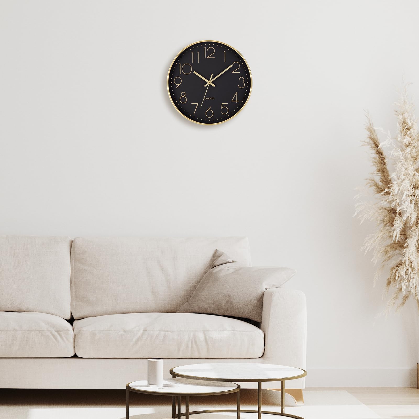 Brand: ACCSHINE Moderne Wanduhr aus Kunststoff & Glas – 30 cm, lautlos, kindersicher – perfekt für Küche, Wohnzimmer & Kinderzimmer Endlich Zeit ohne Tick-Tack: Dank des geräuscharmen Quarzwerks bleibt diese Wanduhr ohne Tickgeräusche 100 % lautlos – ideal als Küchenuhr, Wanduhr Wohnzimmer oder Wanduhr Kinderzimmer, wenn Ruhe beim Kochen, Spielen oder Schlafen gefragt ist. Produkt-Details auf einen Blick Gehäuse: hochwertiger, recyclebarer Kunststoff-Rahmen (ABS) in seidenmatter Premium-Optik – leicht und stossfest. Front: echtes, kratzfestes Glas für klare Sicht und langanhaltende Brillanz – keine vergilbende Kunststoff-Scheibe. Grösse: 30 cm Ø, 4 cm Tiefe – die beliebte Wanduhr gross, die jeden Raum sofort modern aufwertet. Design: schlichte, moderne Minimallinien mit 12 mm hohen, gold arabischen Ziffern – auch aus 6 m Entfernung perfekt ablesbar. Zeiger: kontraststarke Metallzeiger → zusätzliche Ruhe und reduziertes Wall-Clock-Design. Kindersicher & energieeffizient Das robuste Glas bricht nicht so leicht wie herkömmliches Fensterglas; das ABS-Material ist BPA-frei und lässt sich mit einem feuchten Tuch abwischen. Eine einzelne AA-Batterie (nicht im Lieferumfang) reicht für bis zu 18 Monate – sparsam und umweltfreundlich. Montage in 60 Sekunden mehr braucht eine moderne Wanduhr nicht. Einsatzorte Küche: Hitzebeständiger Kunststoff, leicht zu reinigen Wohnzimmer: dezentes Schwarz-Gold-Design Geeignet für alle minimalistischen und modernen Wohnzimmerstile Kinderzimmer: lautloses Uhrwerk & unzerbrechliches Glas → sicher für Kleinkinder