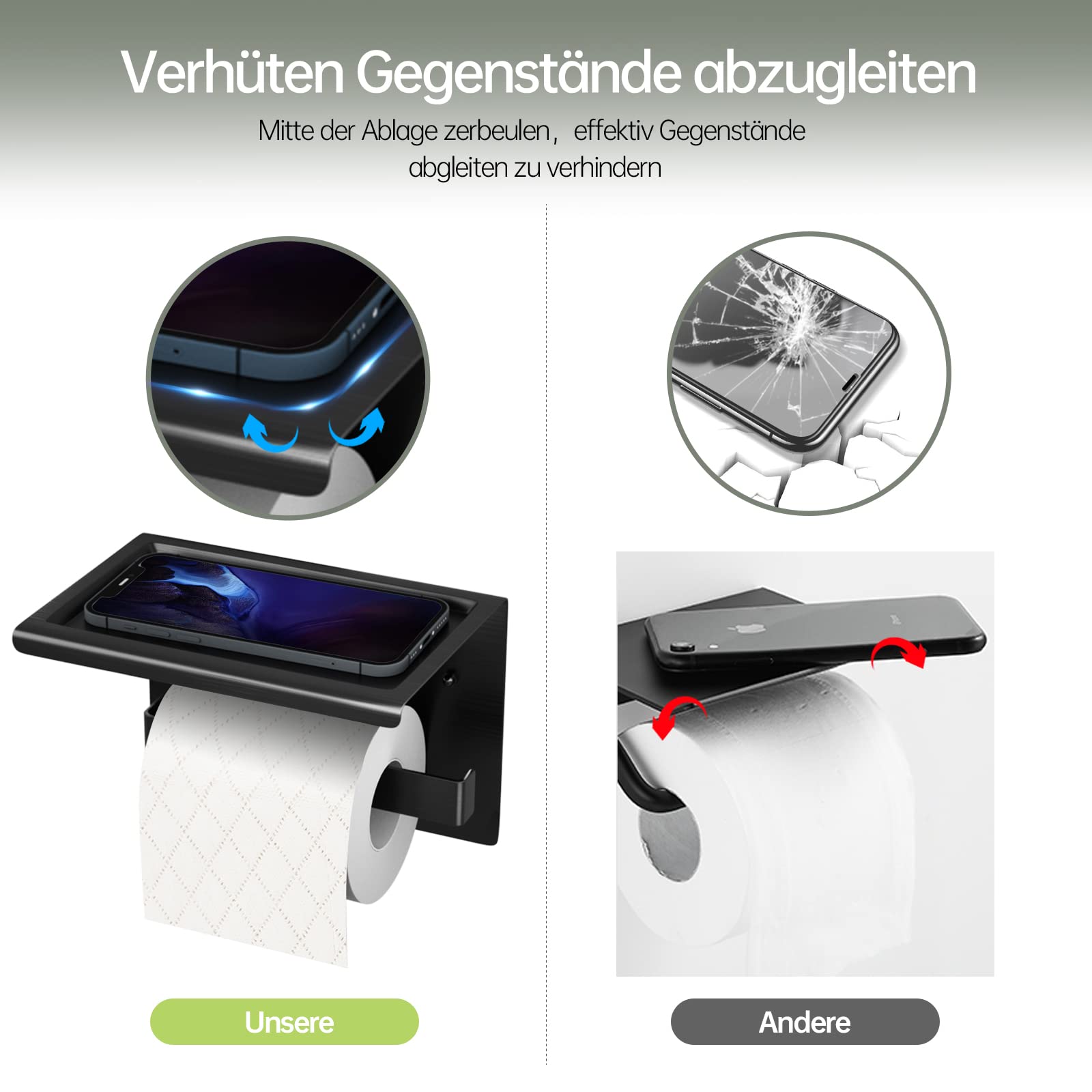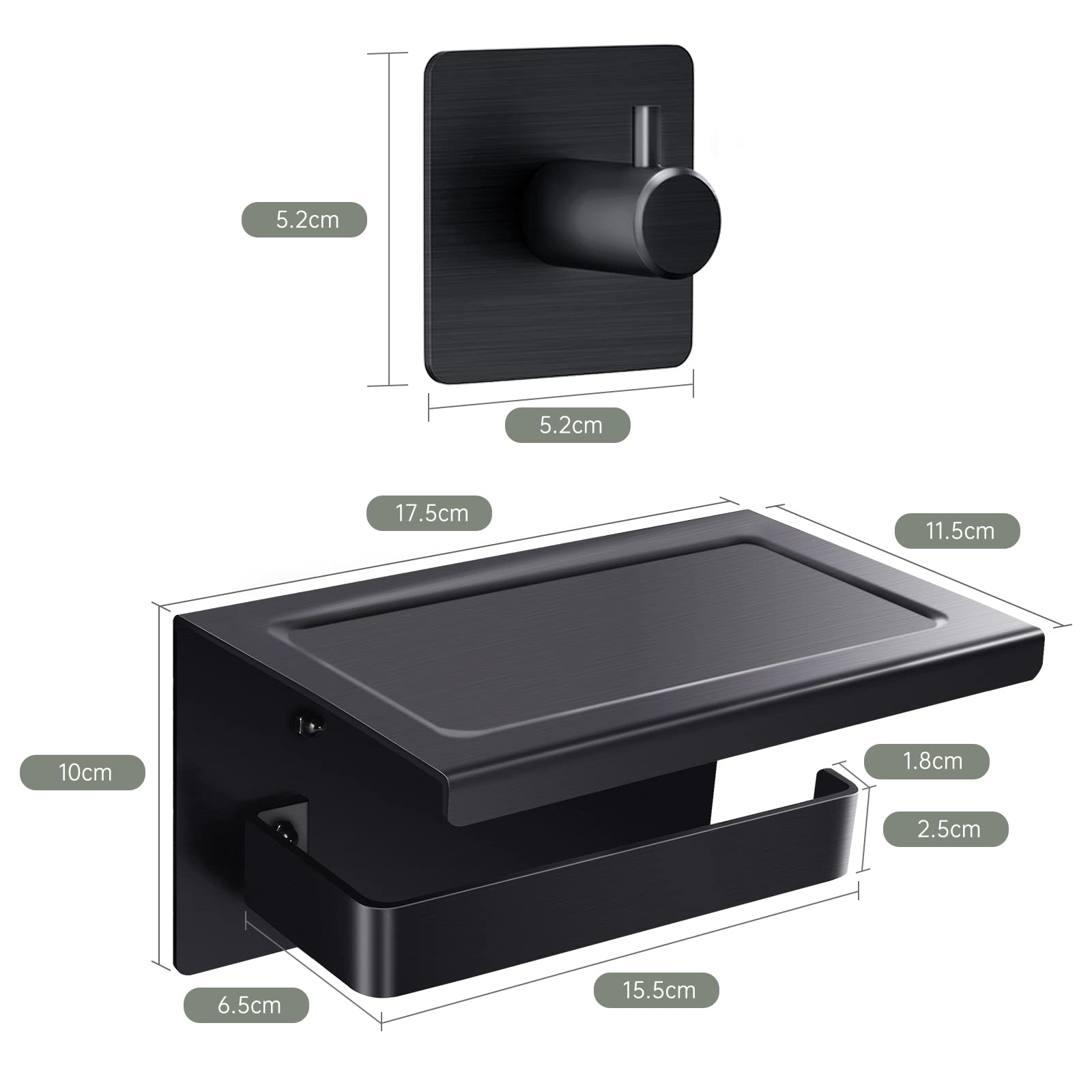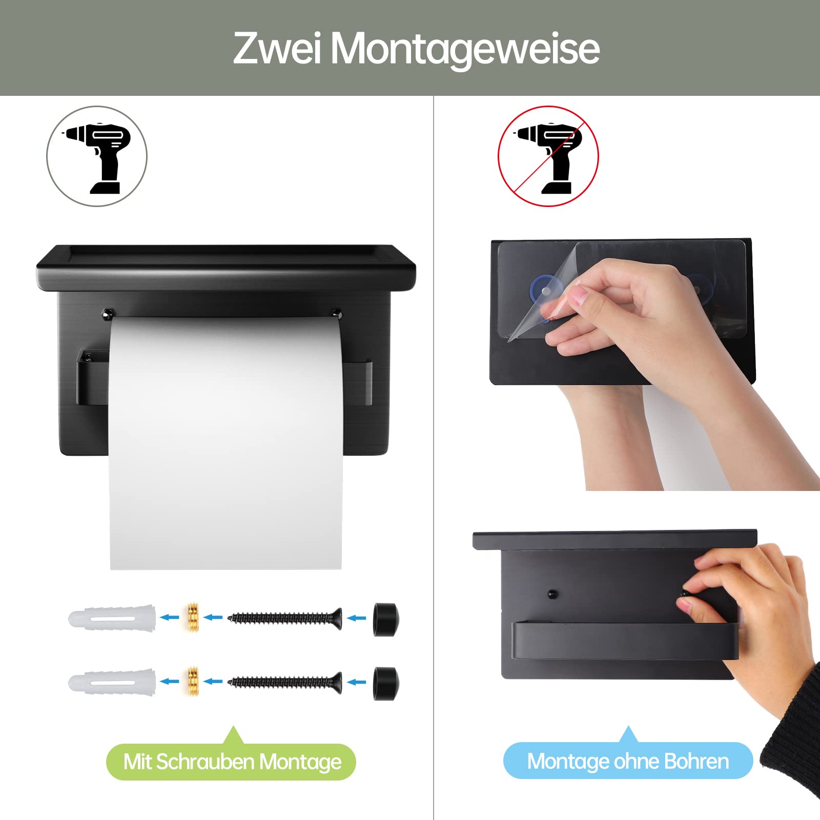 Acmetop Toilettenpapierhalter ohne Bohren Aluminium Klopapierhalter mit 17 cm Ablage, Selbstklebende WC Papier Halterung mit 2 Klebehaken Wandmontage Klorollenhalter für Küche und Badzimmer Schwarz