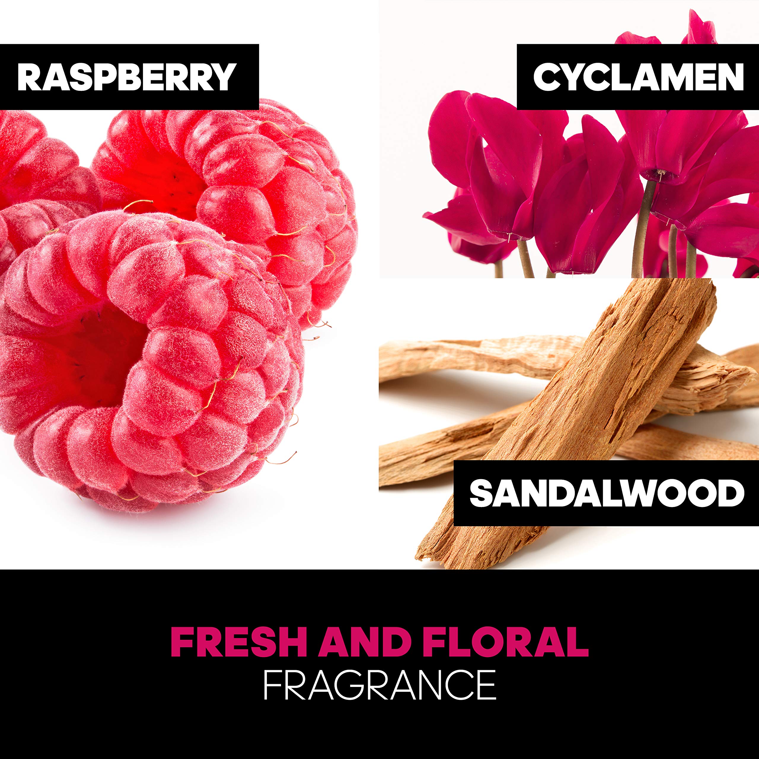 • Das exotisch-florale Konzept vereint im Auftakt süsse Himbeere & Johannisbeere, entfaltet Noten von Freesien & Veilchen und klingt mit kräftigen Sandelholz & Moschus-Akkorden in der Basis nach