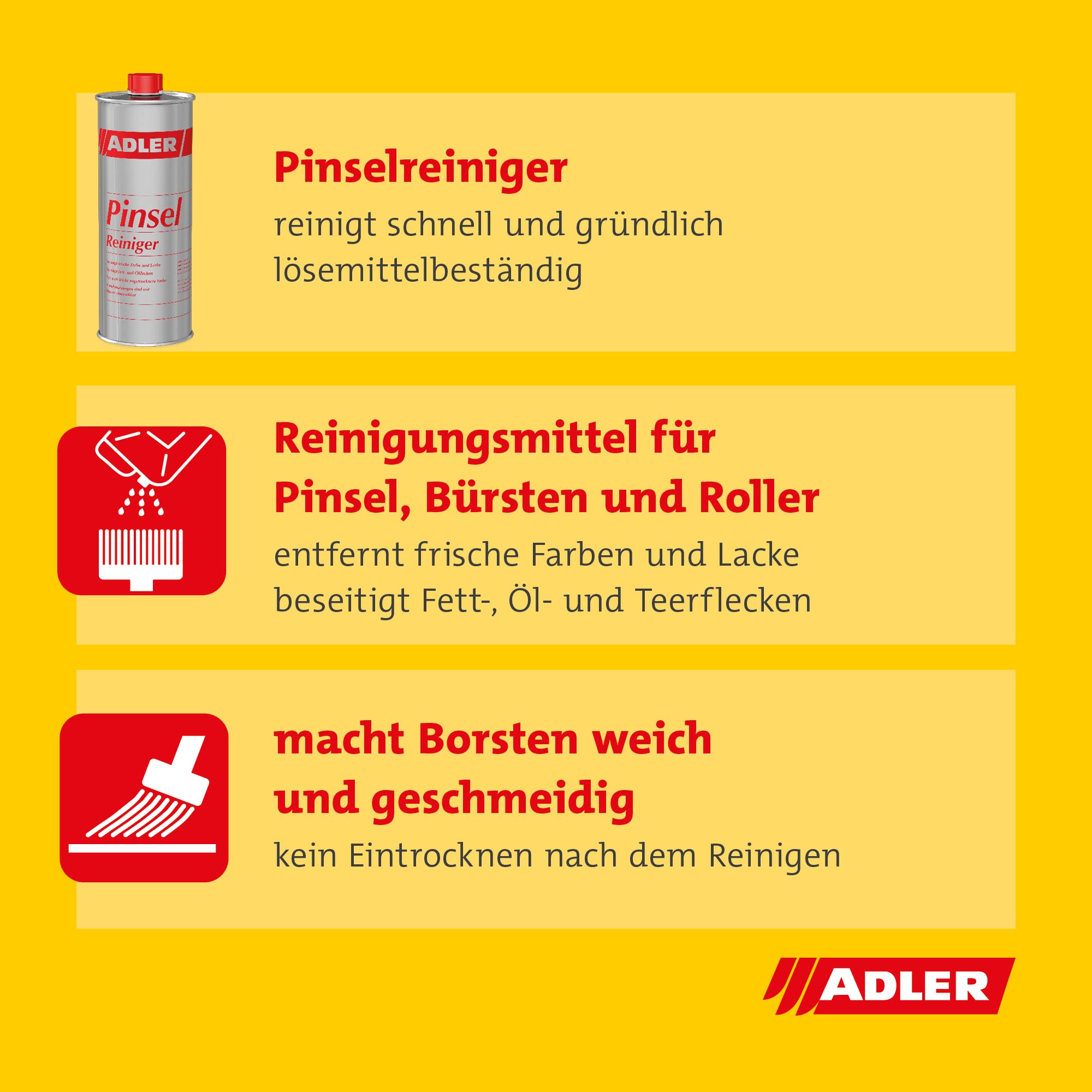• PINSELREINGER und FARBLÖSER von Adler entfernt frische Farbe und Lacke hocheffizient und mit perfektem Ergebnis. FETT, Öl und Teerflecken werden ebenso aus Ihrem Pinsel beseitigt.