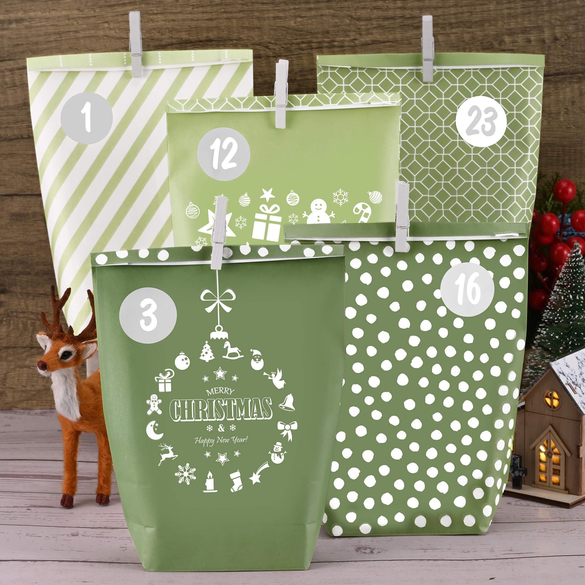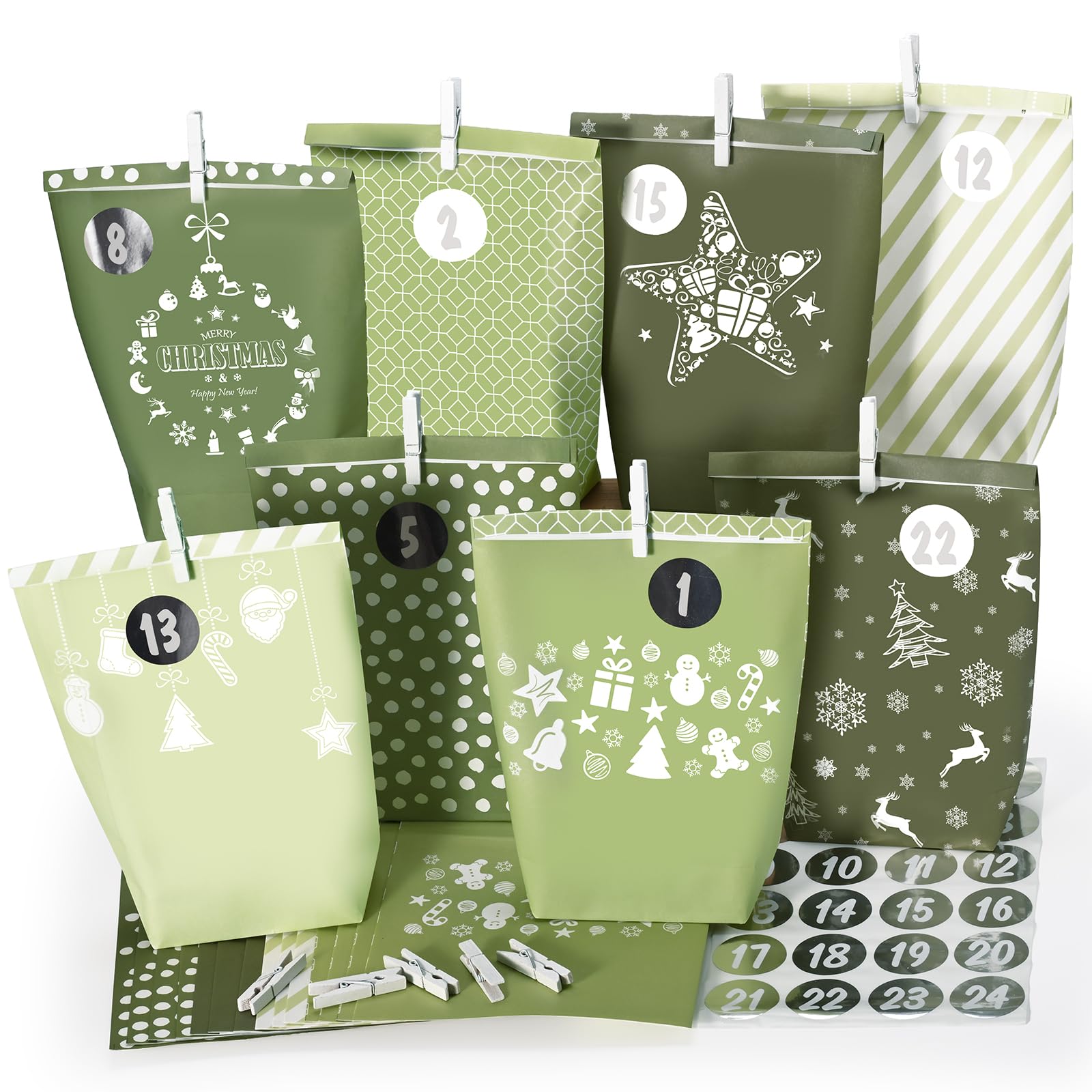 GRÜNER WEIHNACHTS-ADVENTSKALENDER: Dieses Set enthält 24 stilvolle grüne Papierbeutel, die mit festlichen Motiven wie Schneeflocken, Weihnachtsbäumen, Rentieren und Sternen bedruckt sind. Die Tüten sind mit weissen Zahlenaufklebern und passenden weissen Holzklammern ausgestattet, was ihnen einen eleganten und harmonischen Look verleiht.