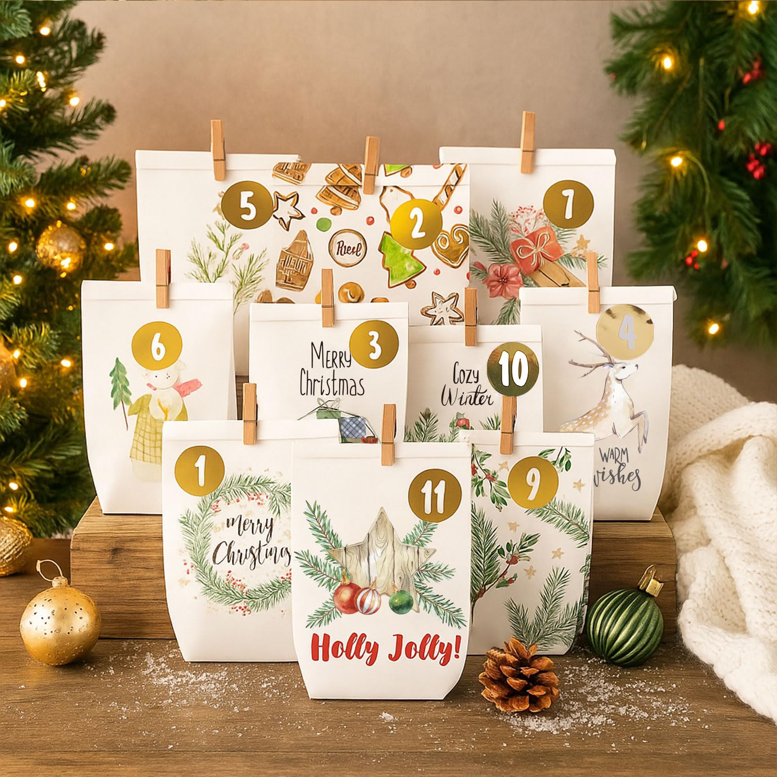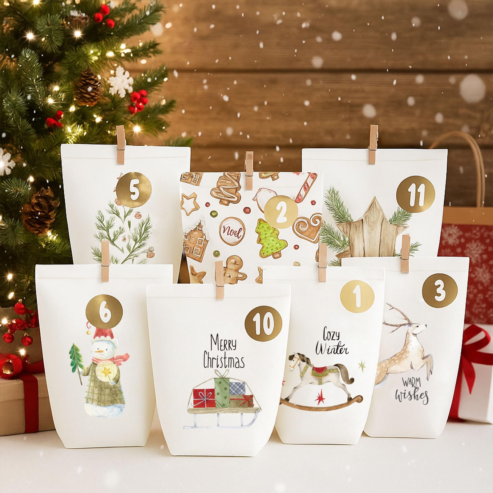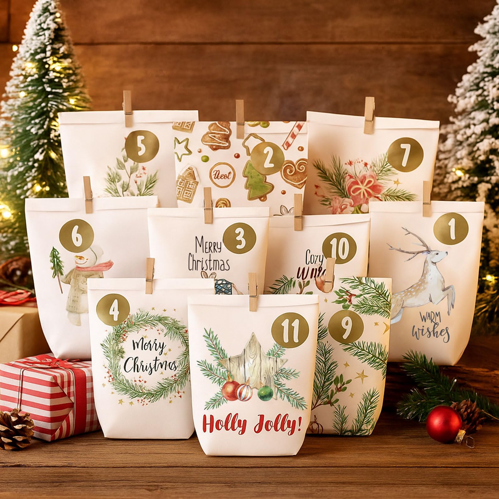 - Motivkalender das Aquarell Papptüten zum Befüllen: Ein Weihnachts kalender papiertaschen-Set mit 24 papier tütchen (Kreuzbodenbeutel 16 x 6 x 22 cm) und Aufdruck - in Winter Bunt, 24 Golden Aufkleber Sticker Zahlen, 24 Holzklammern. Ideal zum Verpacken von Süssigkeiten, Make Up, Spielzeug, Schokolade, Schmuck, kleiner Figuren, Gutscheinen oder anderen kleinen Geschenken.