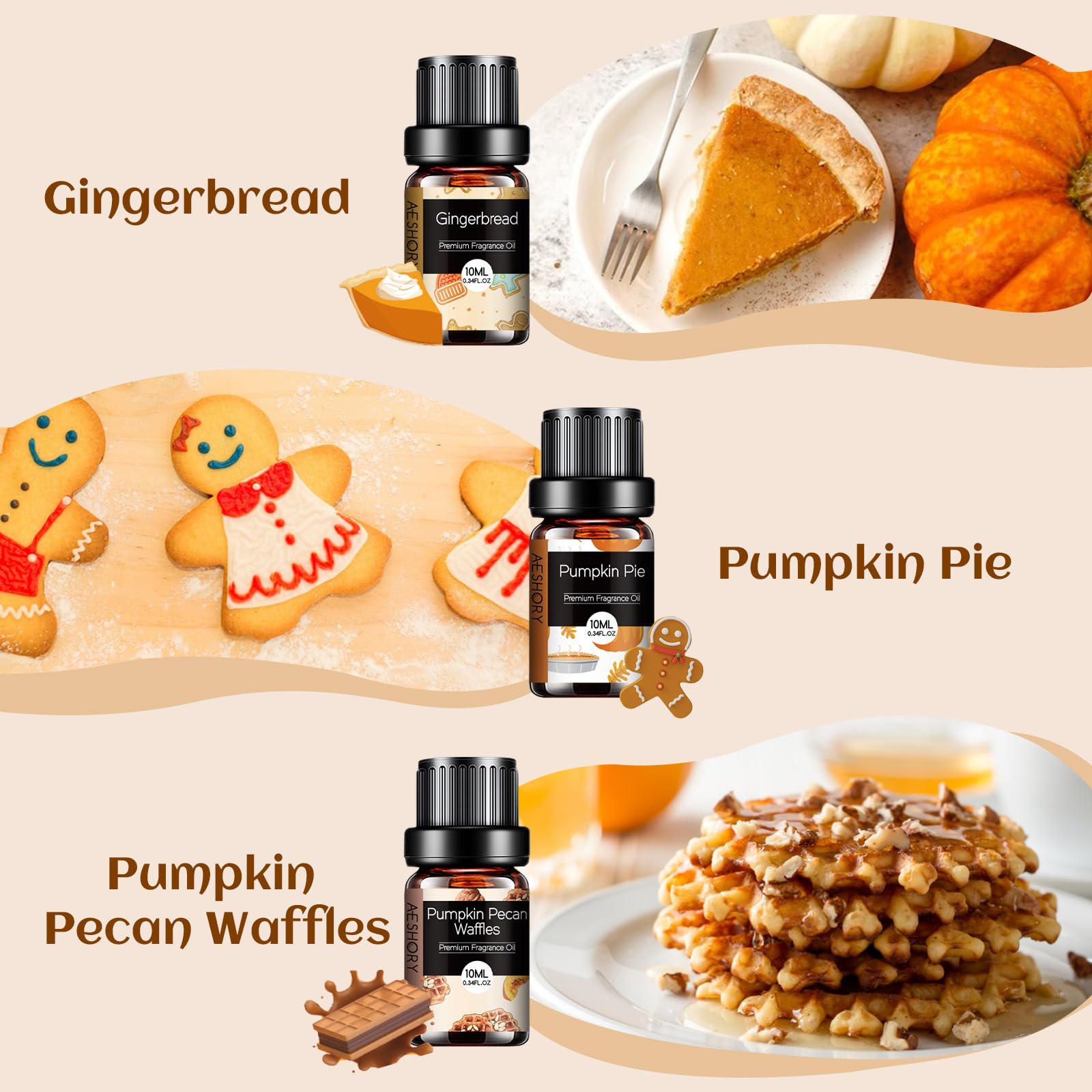 AESHORY Backöl Ätherische Öle Set 6x 10ML, Aromatherapie Duftöl für Diffuser, Kerzenherstellung - Lebkuchen, Kürbiskuchen, Kürbis-Pekannuss-Waffeln, Schokoladenkeks, Kirsch-Käsekuchen, Kaffeekuchen