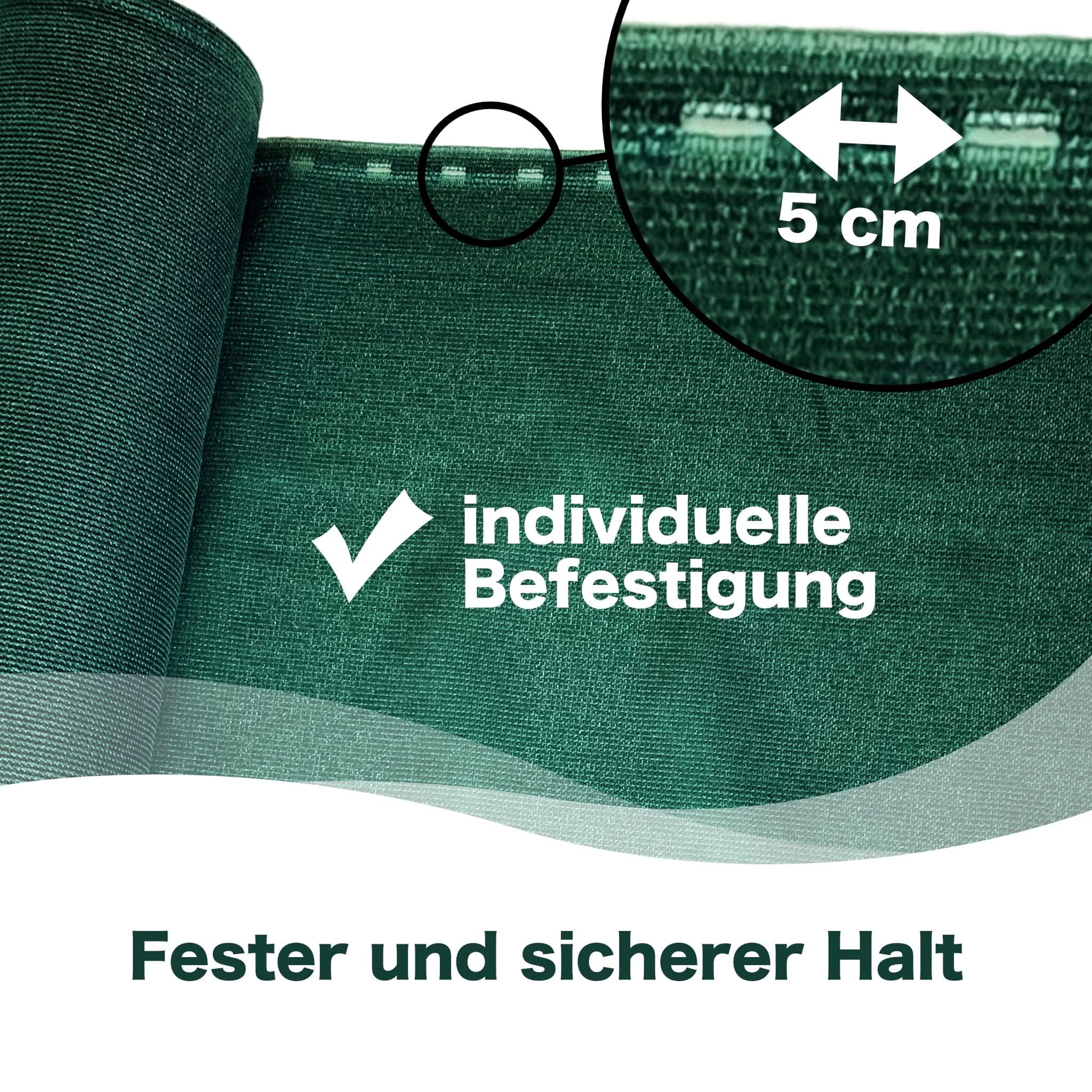 Schattierwert: ca. 80% Eigenschaften: 100% PE, wetterfest, reissfest, UV-stabilisiert, verrottungsfest, wasser- und säurefest, farbecht Konfektion: gewirkter Saum mit Knopflöchern alle 5 cm am Rand der Längsseiten Anwendungen: Schattiermatte, Sichtschutz, Windschutz, Staubschutz, Balkonblende Farbe: dunkelgrün Gewicht:150 g/m²