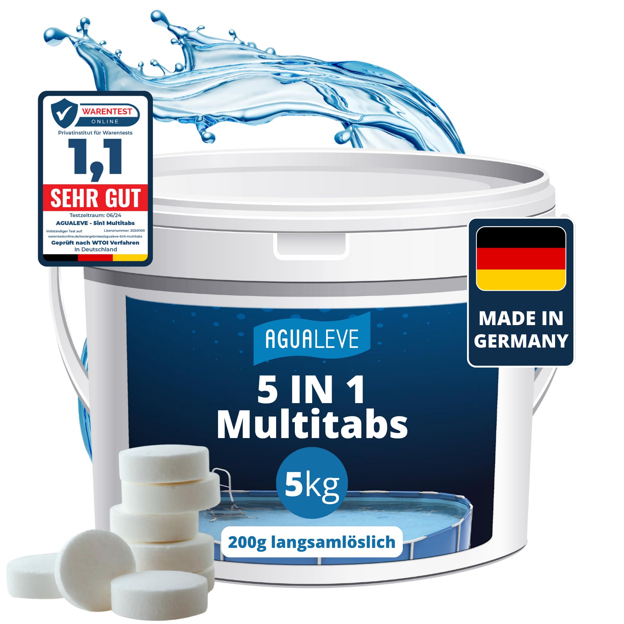 AGUALEVE® 5 in 1 Chlor Multitabs 200g langsamlöslich 5kg *NEU* | für Pools jeder Art ab 25.000 Liter Wasser | Desinfektion, Algenschutz, Flockung, pH-Stabilisierung & Klareffekt | Made in Germany