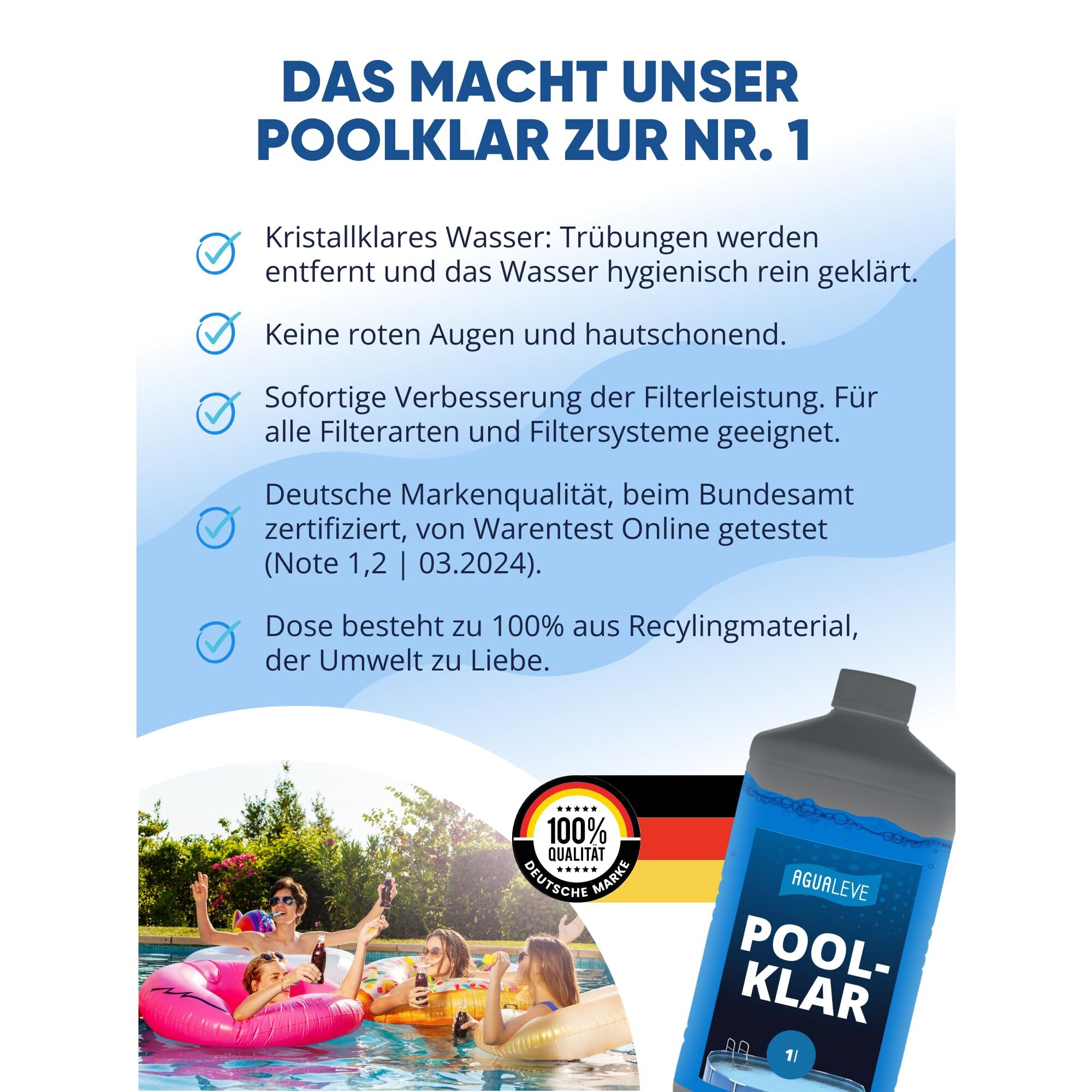 AGUALEVE® Poolklar 1l *NEU* – Kristallklar 2.0 Formel für perfektes Poolwasser – Pools, Whirlpools, Planschbecken – Markenqualität Made in Germany – für 200.000 Poolwasser – mit Note 1,2 getestet