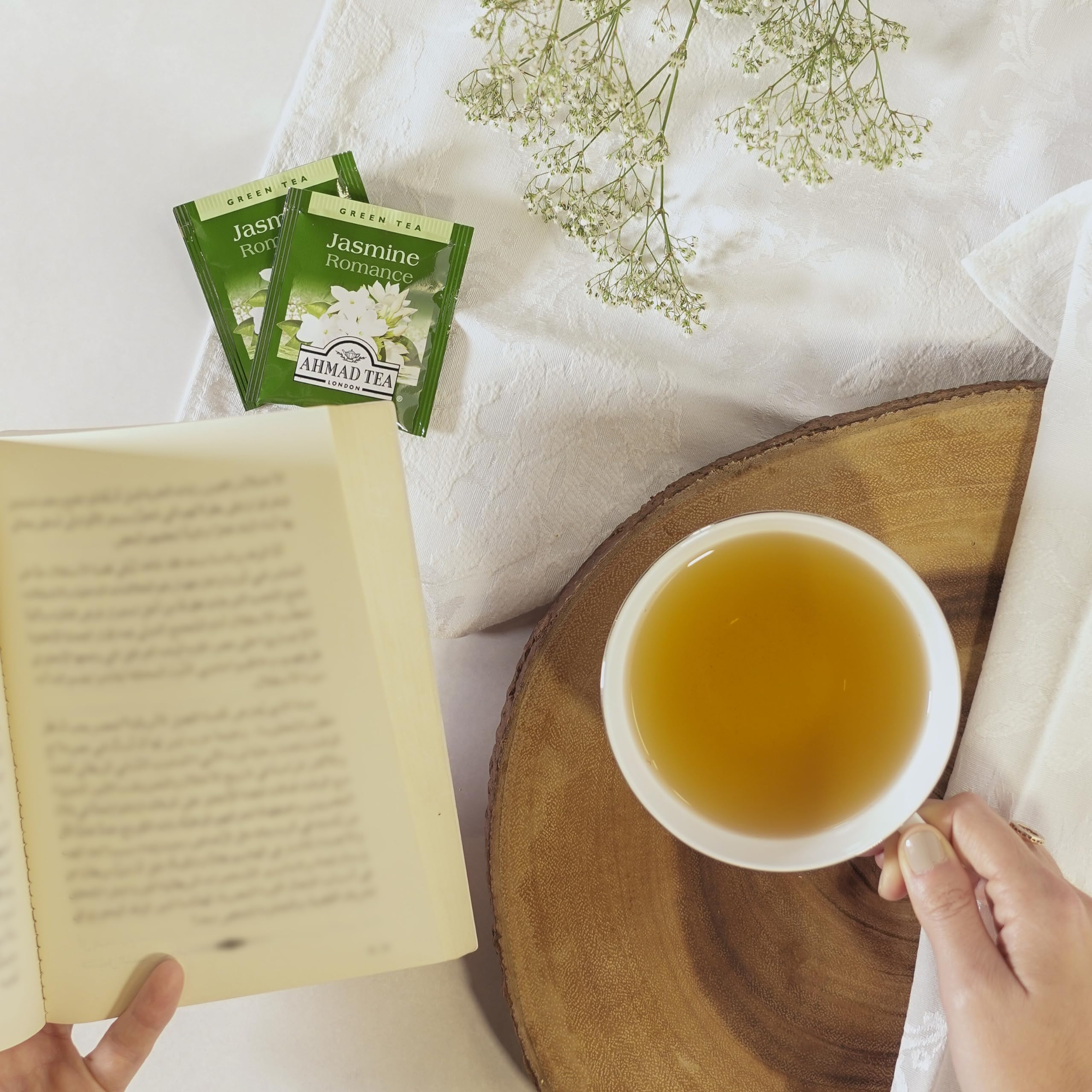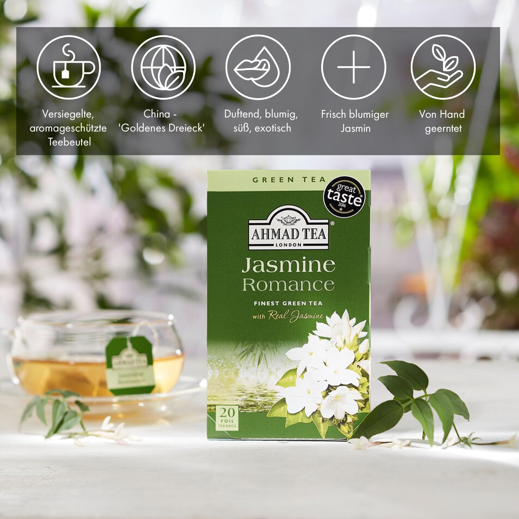 Ahmad Tea - Jasmine Romance - Grüner Jasmintee mit echten Jasminblüten - Einzeln Verpackte, Aromaversiegelte Teebeutel mit 2g Tee pro Portion - 20 Teebeutel mit Band
