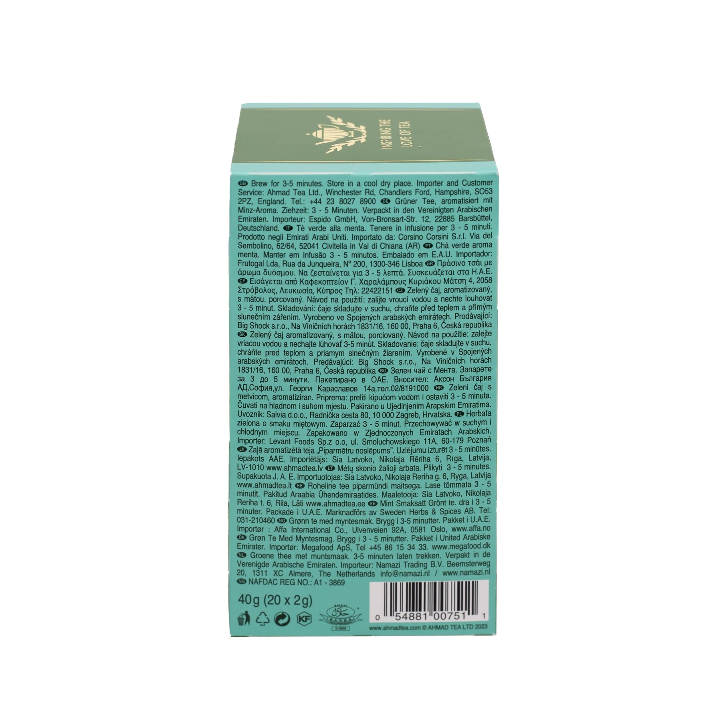 Mindestanzahl für die Bestellung von "Ahmad Tea Green Mint - Grüner Tee mit Minze - Einzeln Verpackte, Aromaversiegelte Teebeutel mit 2g Tee pro Portion - 20 Teebeutel mit Band (Packung mit 3)" ist 1.