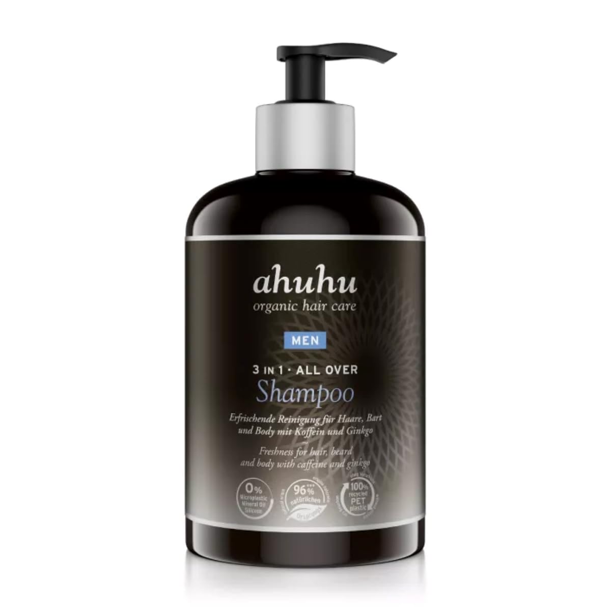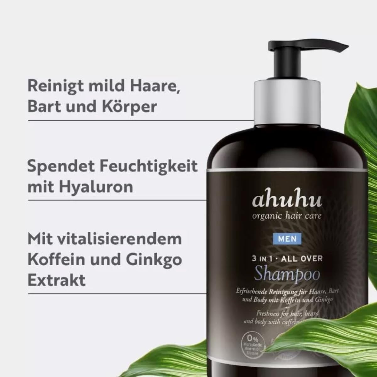 ahuhu MEN 3 in 1 ALL OVER Shampoo XXL (500ml) - All-in-One Männer Shampoo für Haare, Bart und Körper, pflegt Haare & Bart angenehm weich mit Koffein, Hyluaronsäure & Gingko, vegane Haarpflege