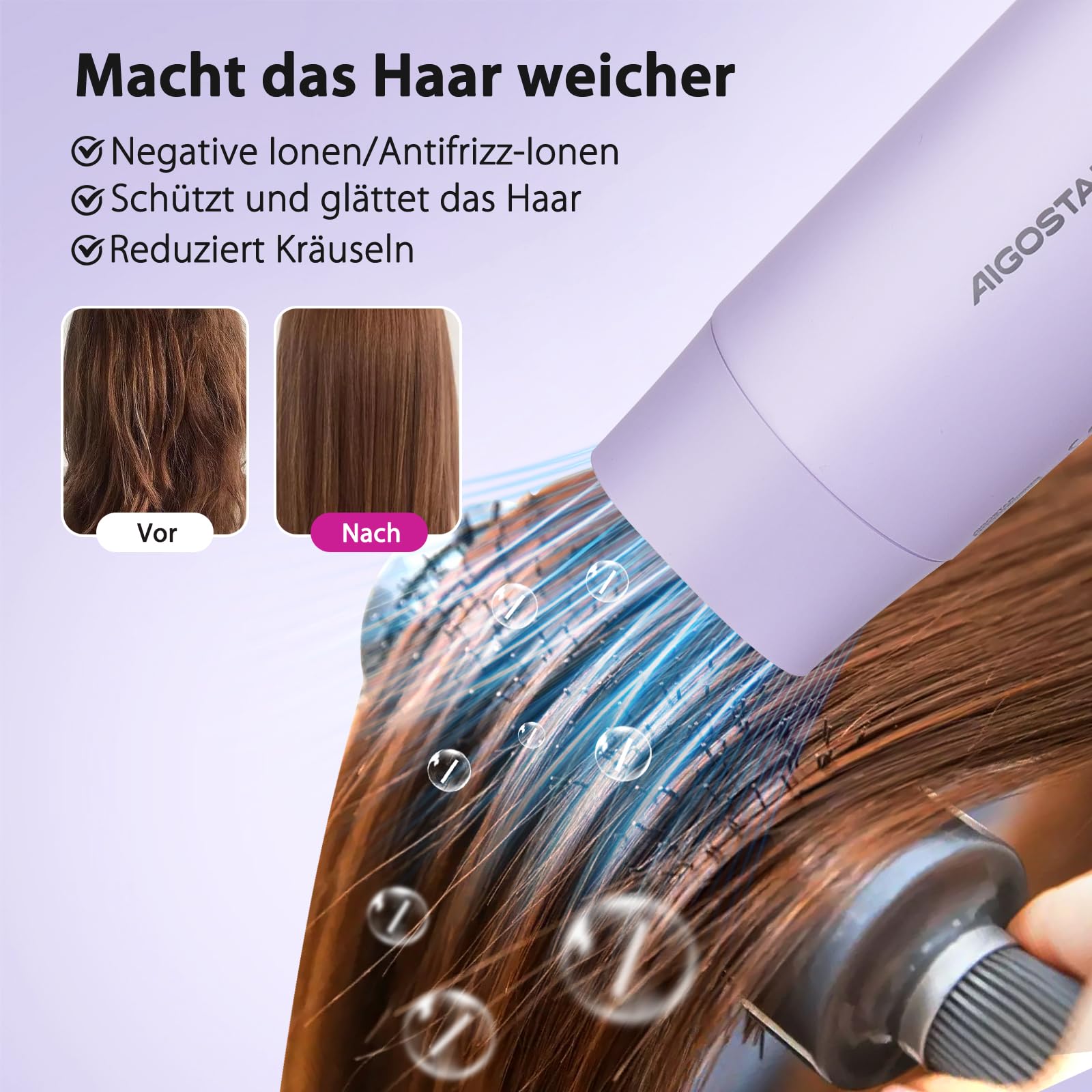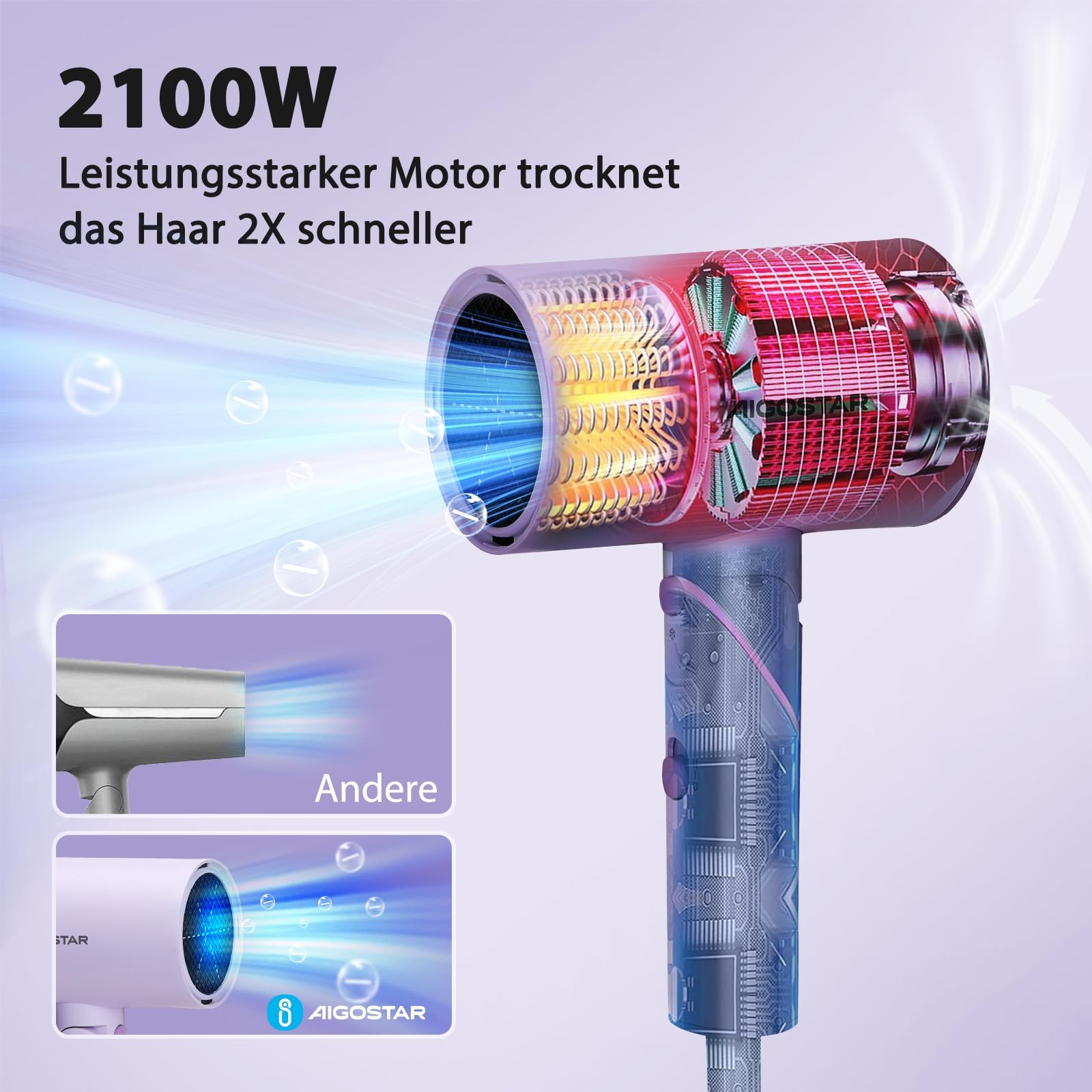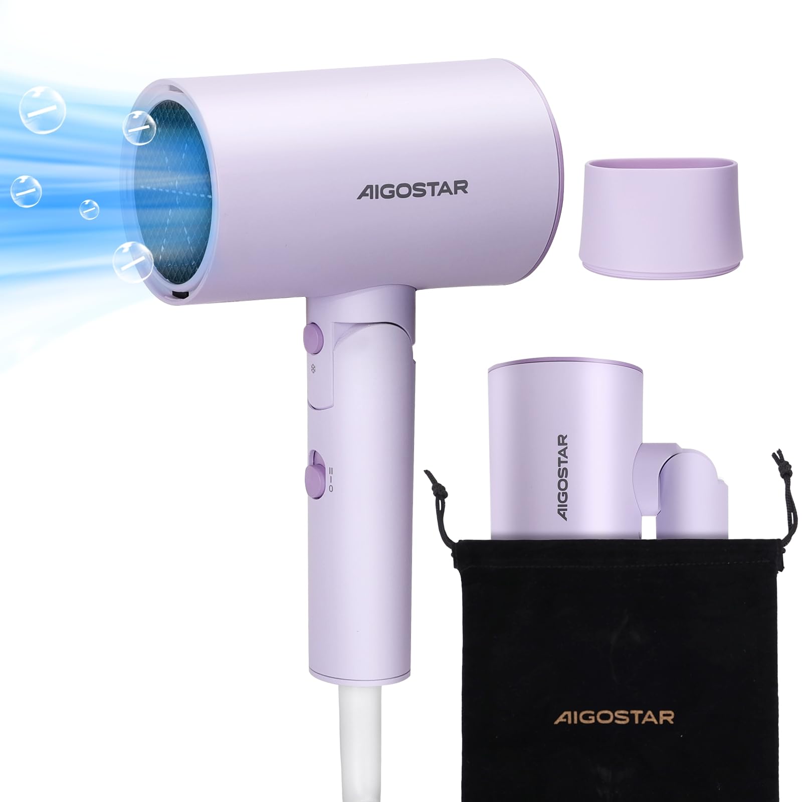 Aigostar Reise-Haustrockner - 2100W Ionentechnologie, 3 Temperaturen / 2 Geschwindigkeiten, Überhitzungsschutz, Lila mit Speicherbeutel