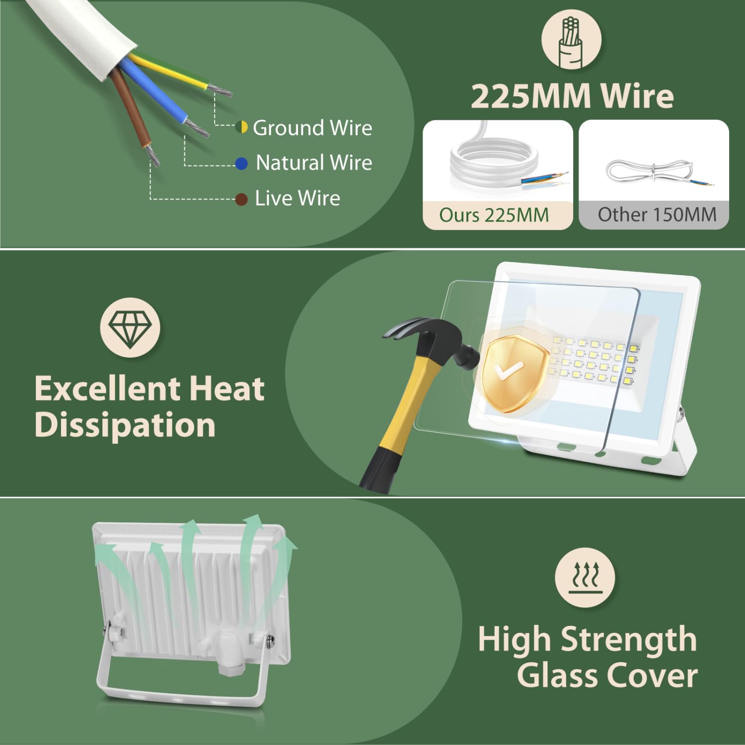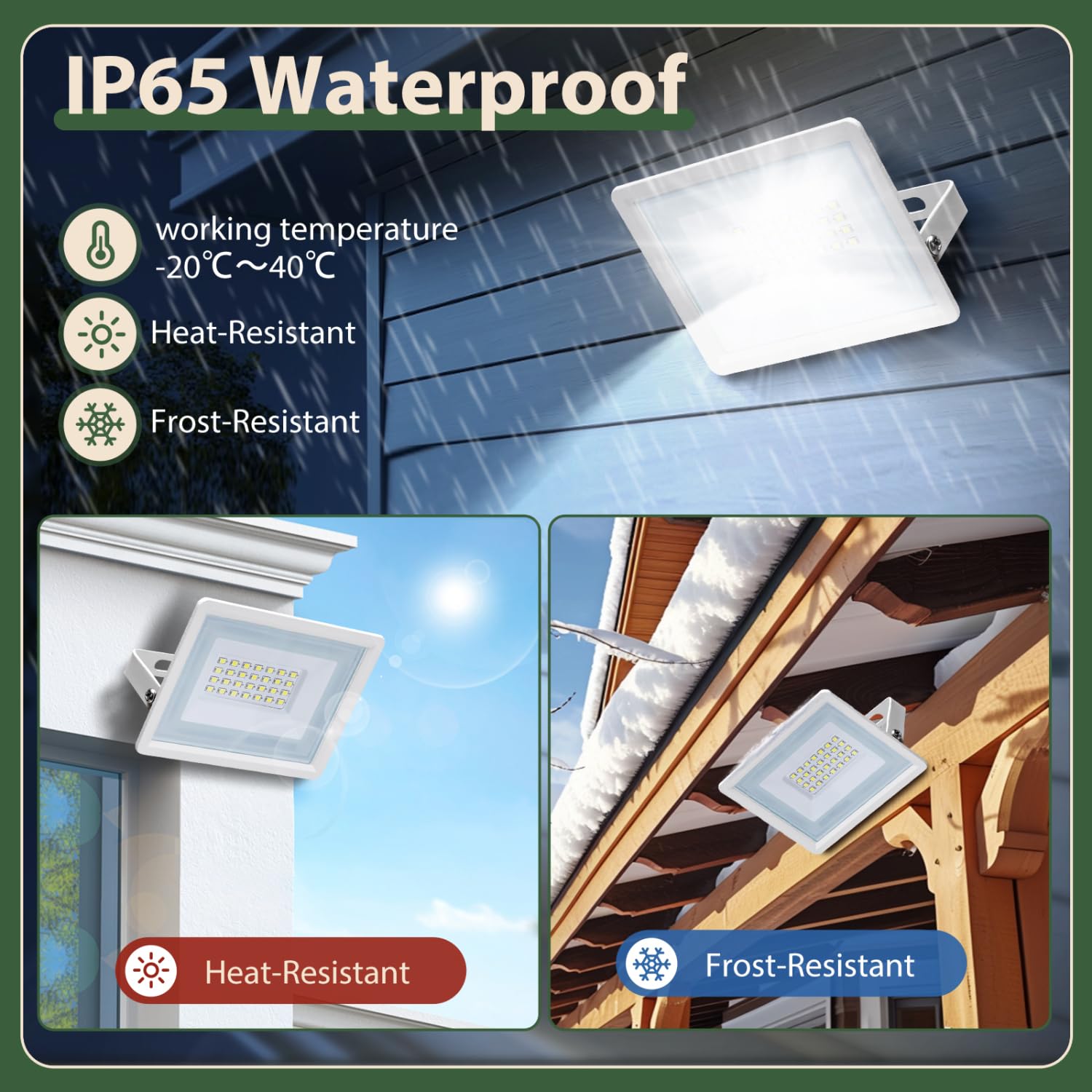 【Super hell und energiesparend】Aigostar LED-Strahler für den Aussenbereich verwendet hochwertige LED-Chips: hohes Licht, hohe Lichtausbeute, lange Lebensdauer.Es kann die traditionelle Glühbirne ersetzen.Der 30W LED-Strahler mit 2510 Lumen Lichtleistung, kann mehr als 85% Strom sparen.#【Sicheres und langlebiges Material】Die LED-Strahler für den Aussenbereich bestehen aus einer hochwertigen Aluminiumlegierung und einer Linse aus gehärtetem Glas, die hitze-, korrosions- und stossbeständig sind.Der Abstrahlwinkel von 110° beleuchtet einen grösseren Bereich.# 【Gute Wärmeableitung】 Das ultradünne Gehäusedesign sorgt für eine bessere Wärmeableitung und verlängert die Lebensdauer des LED-Strahlers für den Aussenbereich auf bis zu 25000 Stunden. Hervorragend geeignet für energiesparende Aussenbeleuchtung.#【IP65 Wasserdicht und staubdicht】Die Wasserdichtigkeit des LED-Strahlers für den Aussenbereich ist IP65, geeignet für die Aussenumgebung. Unabhängig von Regen, Schnee, Sonnenlicht, Wind, Hitze oder Kälte kann er den normalen Betrieb des Scheinwerfers gewährleisten.#【Wide Range of Uses】Mit dem um 180 Grad einstellbaren Winkel ist der Strahler für die Wand-, Boden- und Deckenmontage vorbereitet. Aussenstrahler bieten eine weitreichende Beleuchtung für Ihr Gewerbe- oder Wohnobjekt. Dazu gehören Gärten, Höfe, Garagen, Villen, Parks, Werbetafeln, Dächer, Gebäude, Strassen, Plätze usw.