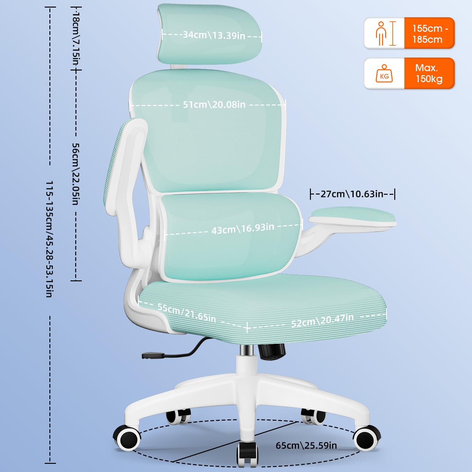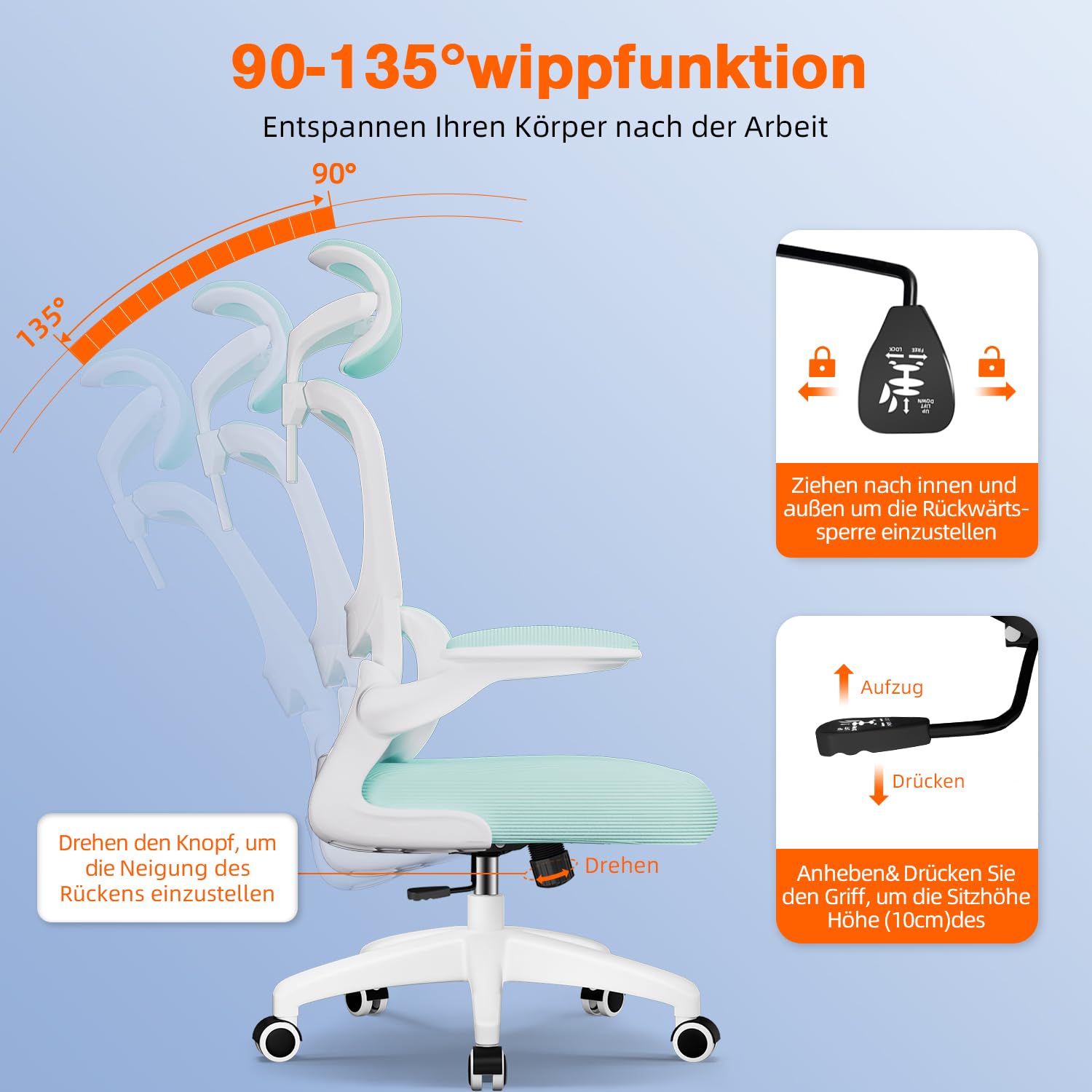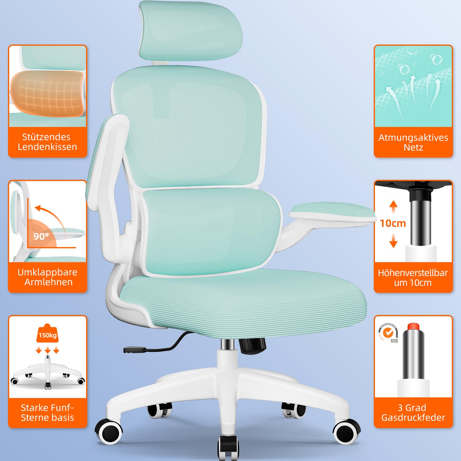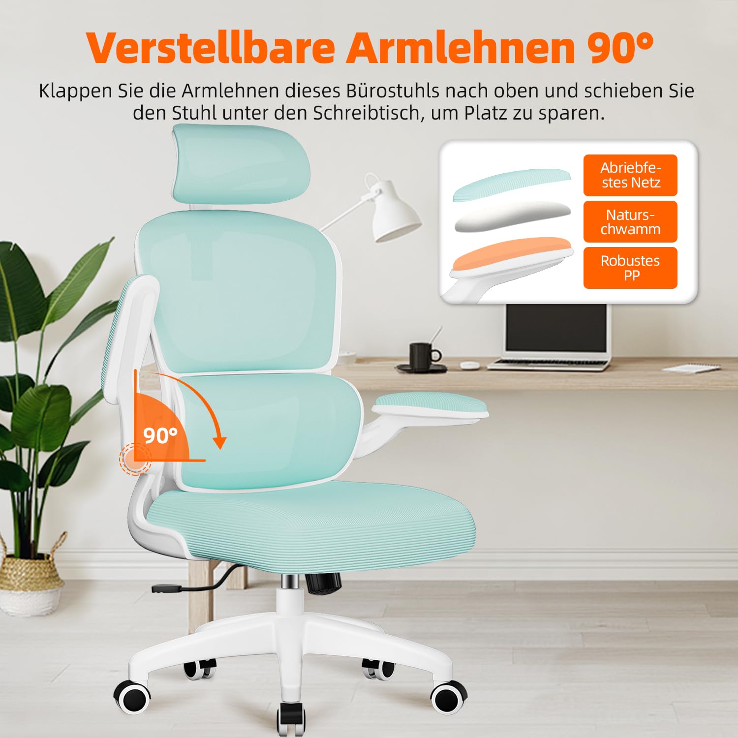 Aiidoits Bürostuhl mit Klappbaren Armlehnen, Lendenwirbelstütze und Höhenverstellbarer, Bürostuhl Ergonomisch 150 kg, Wippfunktion bis 135°, Blaugrün