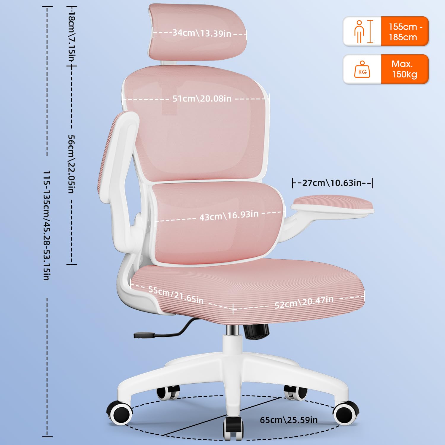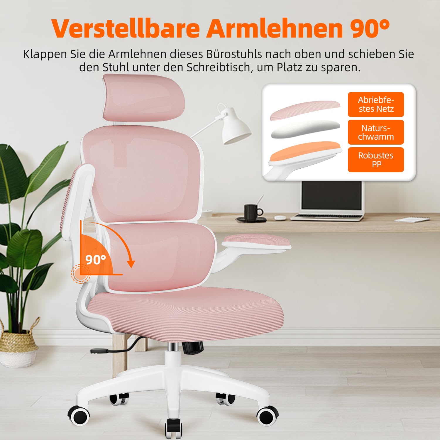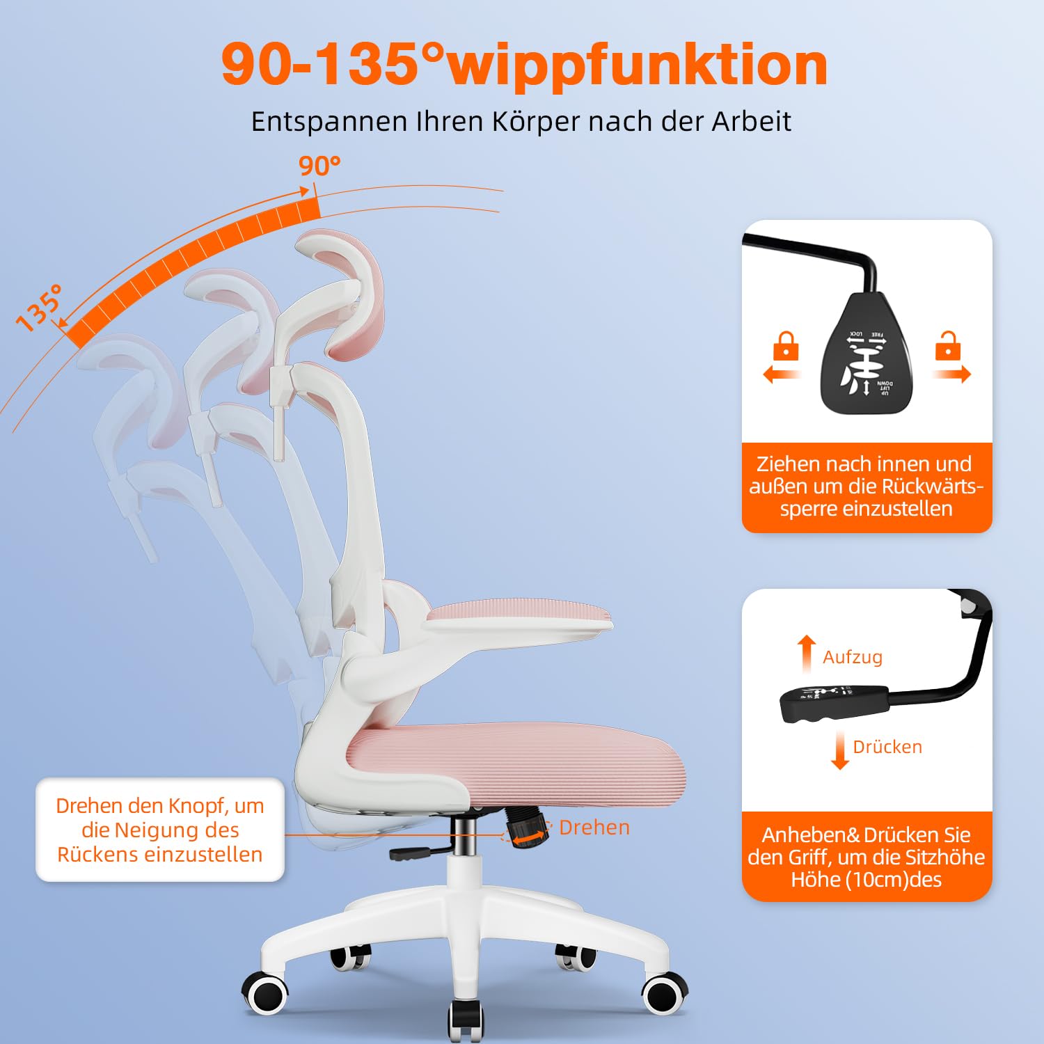 Aiidoits Bürostuhl, Ergonomischer Bürostuhl mit Verstellbarer Kopfstütze, Klappbaren Armlehnen und Lendenwirbelstütze, Wippfunktion bis 135°, Rosa
