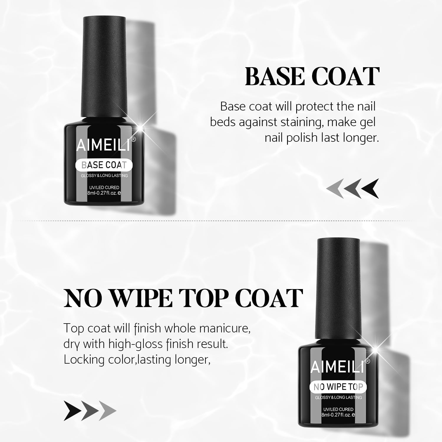 AIMEILI Base Coat und No Wipe Top Coat UV Gel 2 x 8 ml, Unter- und Ueberlack Extra Shine