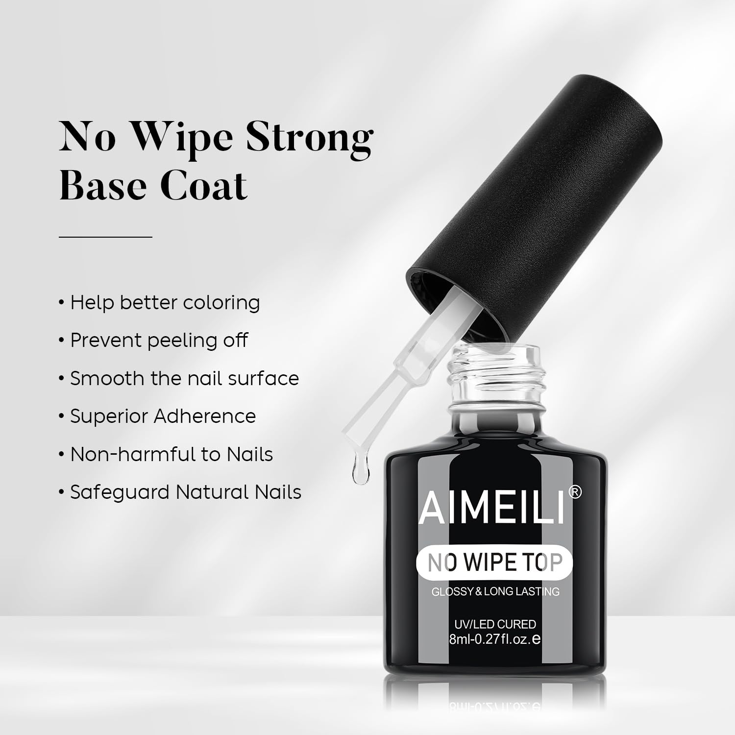 Der AIMEILI No Wipe Top Coat versiegelt die Farbschichten mit einer glatten, luftdichten Schutzschicht. Er schuetzt den Nagellack effektiv vor Absplittern, Rissen, Abloesungen und Farbverlust. Dank der No Wipe Formel ist kein Abwischen nach dem Aushaerten notwendig.