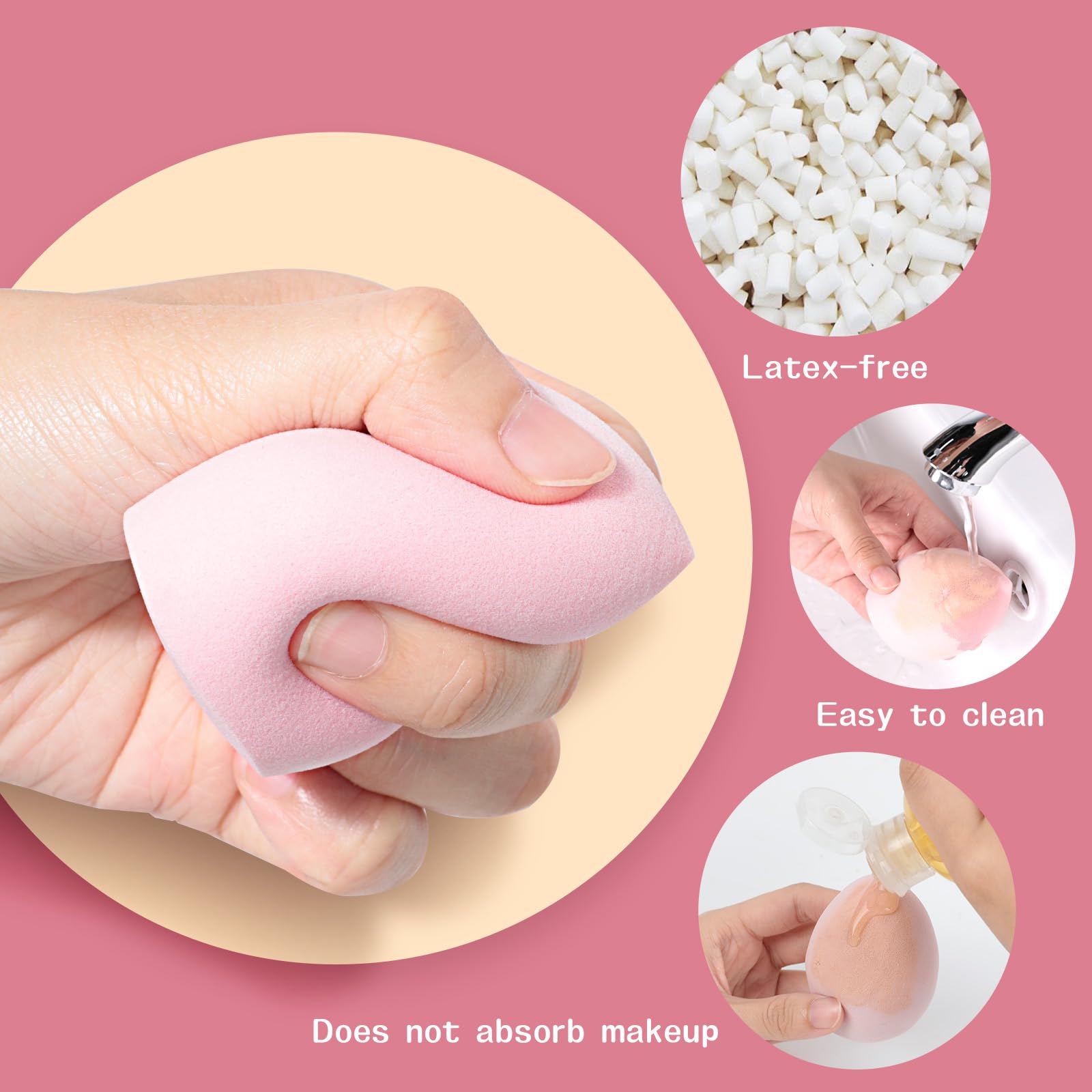 Die Make-up-Schwaemme bestehen aus latexfreiem, hydrophilem Polyurethan, das besonders weich, elastisch und hautfreundlich ist. Die feine Struktur sorgt dafuer, dass das Make-up gleichmaessig verteilt wird, ohne zu viel Produkt aufzusaugen. Ideal auch fuer empfindliche Haut.