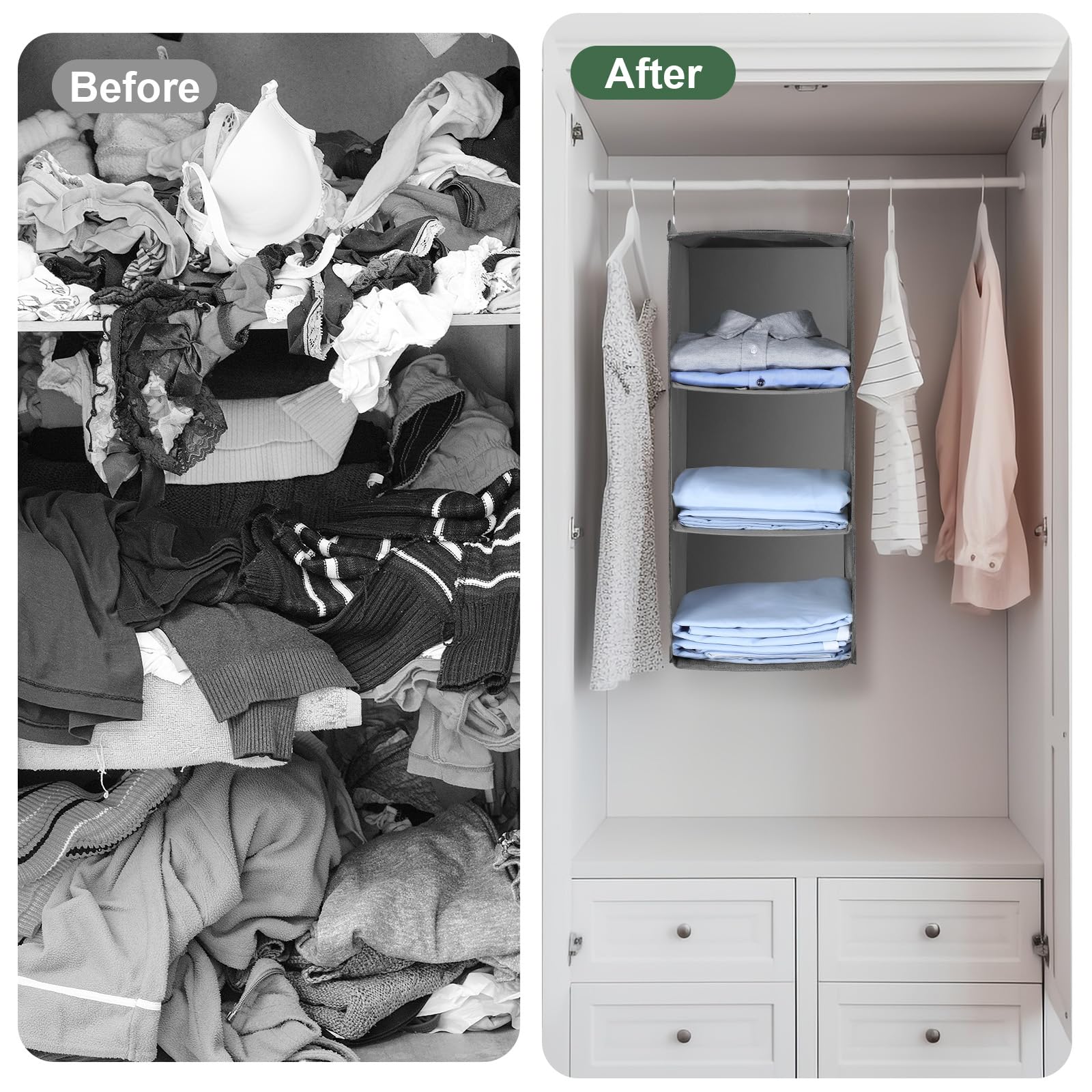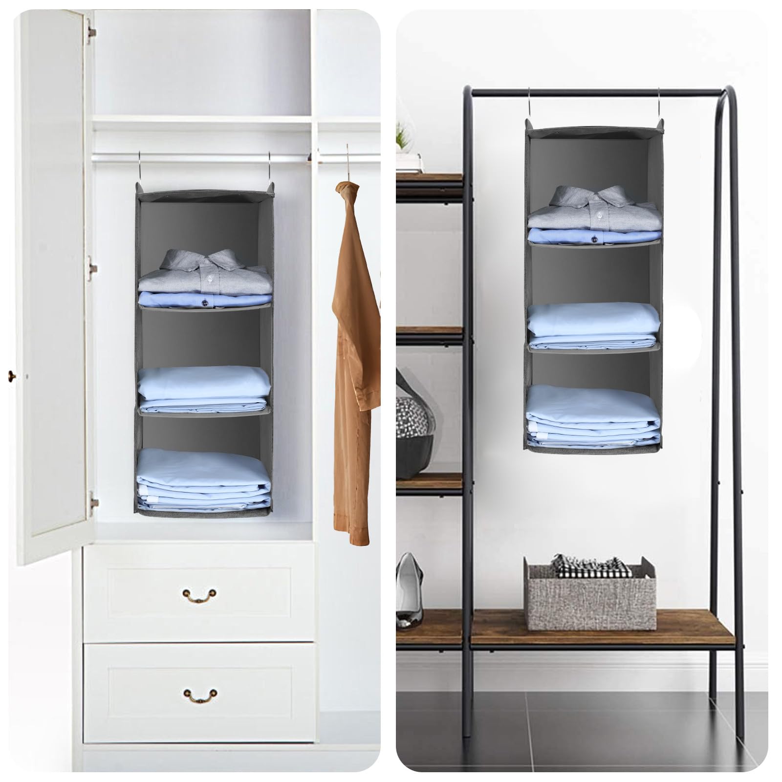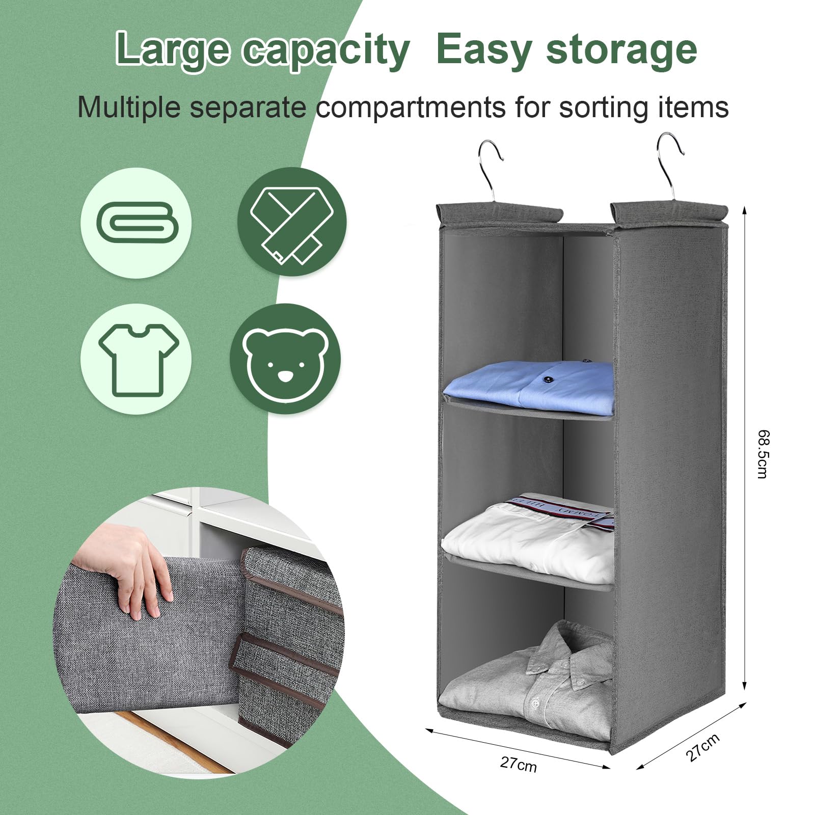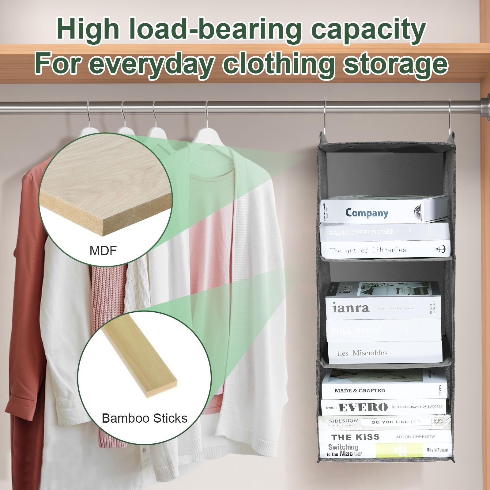 AiQInu Hängeregal Kleiderschrank,Hängeaufbewahrung Schrank Organizer mit 3 Fächern,Faltbar Platzsparend Hängeorganizer Aufbewahrungssystem mit Metallhaken und Bambus-Stock Verstärkt