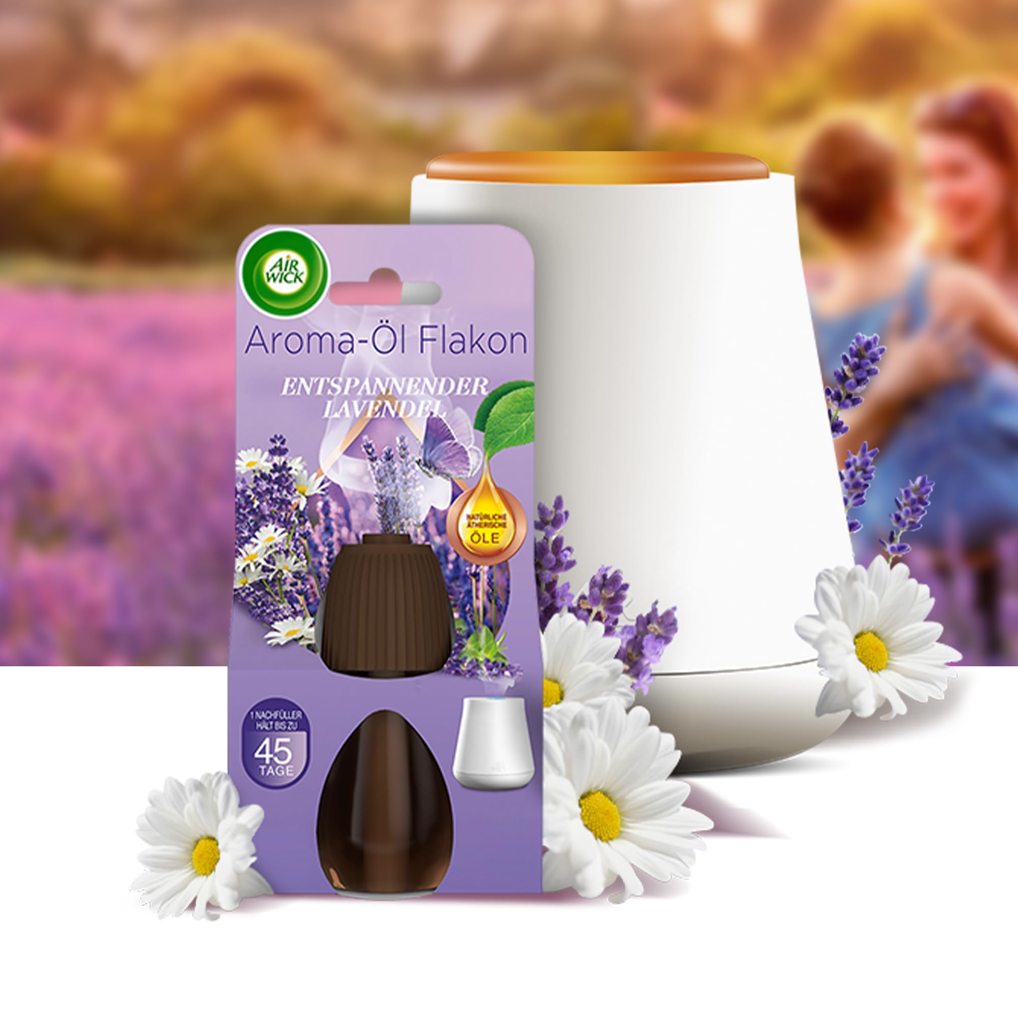 Air Wick Aroma-Öl Flakon - Entspannender Lavendel Die Intensität des Duftes kann individuell anhand von 3 Stufen eingestellt werden:Niedrig: 4 Sekunden Duftnebel, dann 17 Minuten PauseMittel: 5 Sekunden Duftnebel, dann 12 Minuten PauseHoch: 6 Sekunden Duftnebel, dann 10 Minuten PauseProduktdetailsAir Wick Aroma-Öl Flakon, 1 x 20 ml ätherisches ÖlNachfüller für den Air Wick DiffuserEnthält natürliche ätherische Öle, die in einen feinen Duftnebel verwandelt werden, ohne feuchten NiederschlagVor Gebrauch Kennzeichnung & Produktinformation lesen Inhaltsstoffe Coumarin, Linalool, 4-tert-Butylcyclohexyl acetate, 1-(1,2,3,4,5,6,7,8-Octahydro-2,3,8,8-tetramethyl-2-naphthalenyl)ethanone, alpha-iso-Methy-lionone, Limonene4-(4-Hydroxy-4-methylpentyl)cyclohex-3-en-1- carbaldehyd und delta-1-(2,6,6-Trimethyl-3-cyclohexen-1-yl)-2-buten-1-one.Kann allergische Reaktionen hervorrufen.Gefährliche Inhaltsstoffe: Hydrocarbons, C12-C16, isoalkanes, cyclics, Arzt anrufen. Kein Erbrechen herbeiführen. Unter Verschluss aufbewahren. Inhalt/Behälter gemäss den lokalen/regionalen Vorschriften der Entsor-gung zuführen. Inhalt/Behälter gemäss den lokalen/regionalen Vorschriften der Entsorgung zuführen. Über Air Wick Bereits seit 1943 entwickelt Air Wick Raumdüfte, die das Zuhause immer frisch und einladend duften lassen. Das eigene Zuhause ist einer derwichtigsten Rückzugsorte - Air Wick hilft dabei, sich dort besonders wohl zu fühlen und stellt eine grosse Bandbreite an Duftrichtungen zur Ver-fügung.