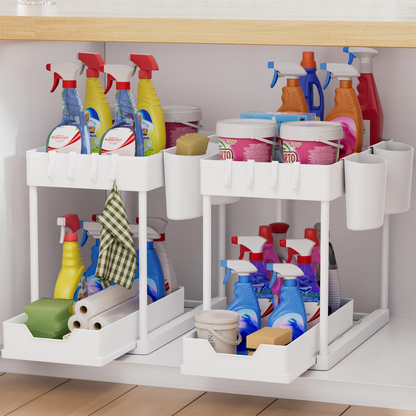 AIXPI Küchen Organizer 2 Etagen, Unter Waschbecken Regal mit Haken und Tasse Gewürzregal Spülschrank Organizer Küchenregal Schrank Organizer für Badezimmer Küch (Weiss 2 Set)