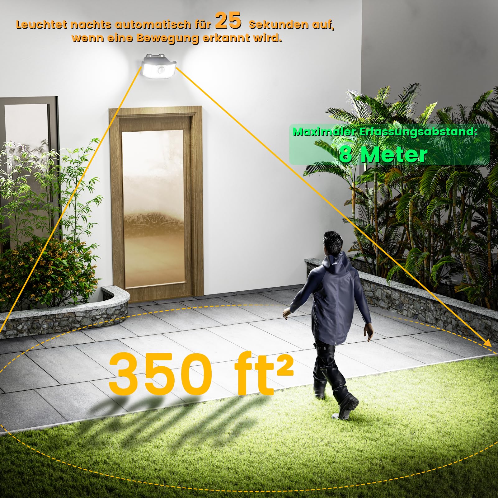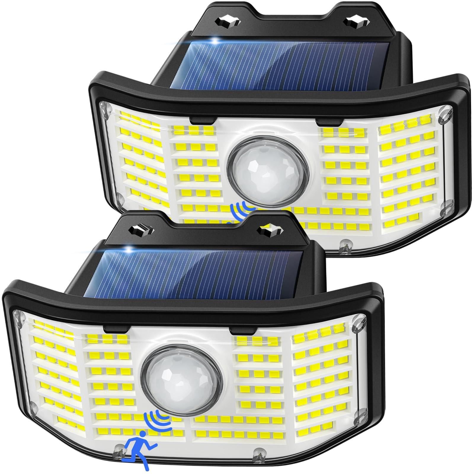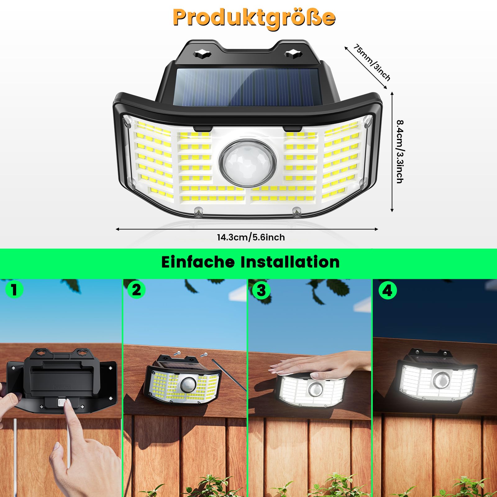 - 【112 LED und 270° breitere Beleuchtung】Solarleuchten sind mit 112 superhellen LED perlen ausgestattet, profitieren von einem 270° breiten Beleuchtungswinkel, der Beleuchtungsbereich einer Lampe kann 350 Quadratfuss erreichen, was einen grossen Bereich beleuchten und gleichzeitig ein helles Licht erzeugen kann und sichere Umgebung für Ihre Familie.