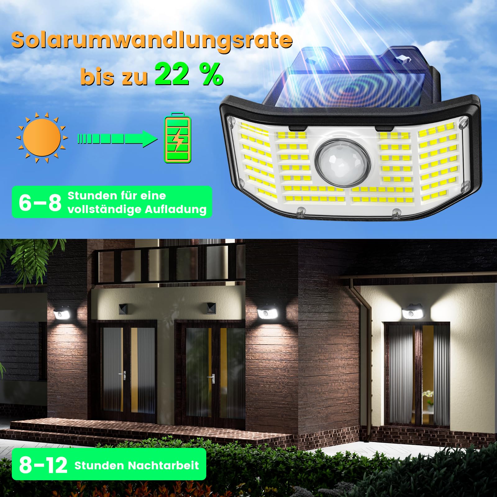 - 【Energiesparend und langlebig】Keine Stromrechnung, Solarleuchten für den Aussenbereich sind mit einem Hochleistungs Solarpanel ausgestattet, die Umwandlungsrate der Solarenergie kann bis zu 22% erreichen. Mit einem 1200 mAh Akku mit grosser Kapazität beträgt die Helligkeit bis zu 800 Lumen. Die Solar Sicherheitsleuchten laden tagsüber 6–8 Stunden Sonnenschein auf und können nachts 8–12 Stunden lang verwendet werden, wenn das Licht 10 Mal pro Stunde ausgelöst wird.