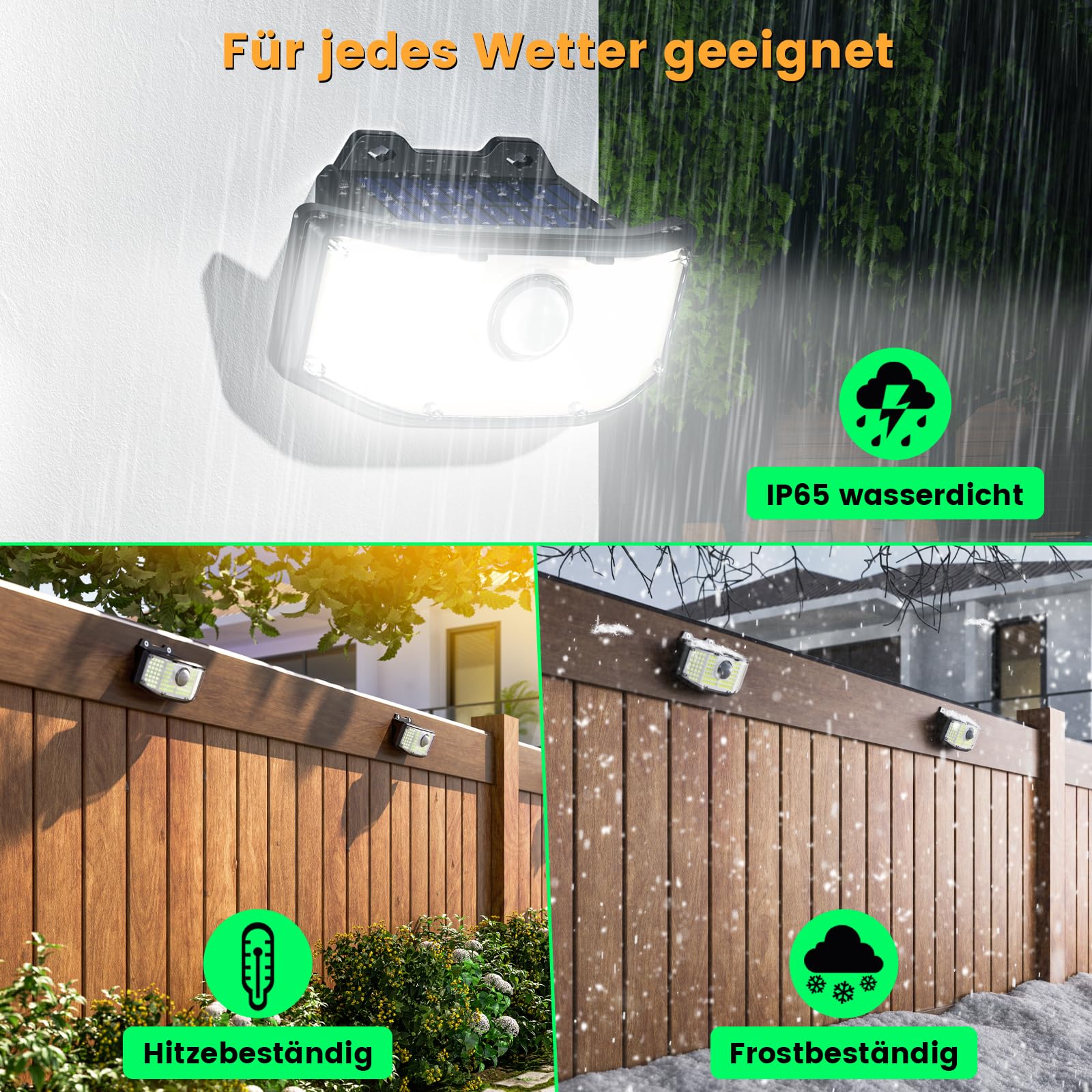- 【IP65 wasserdicht】LED Solar Sicherheitsleuchte besteht aus hochwertigem ABS Material und ist wasserdicht nach IP65, wodurch Wasser effektiv isoliert werden kann. Selbst bei extremen Wetterbedingungen sind Aussenleuchten mit Bewegungsmelder kein Problem.