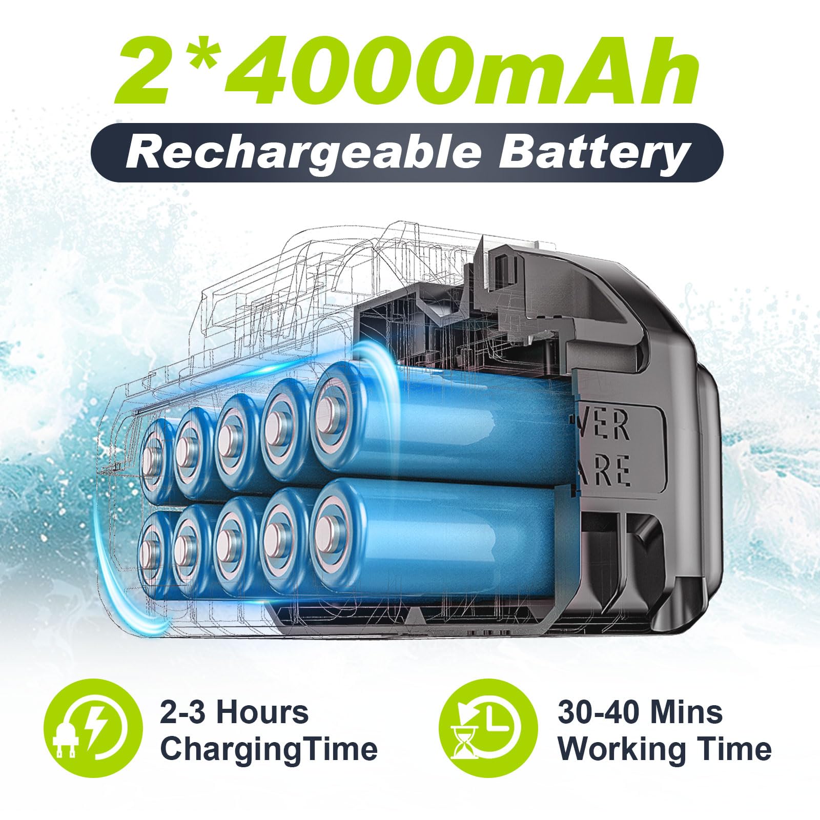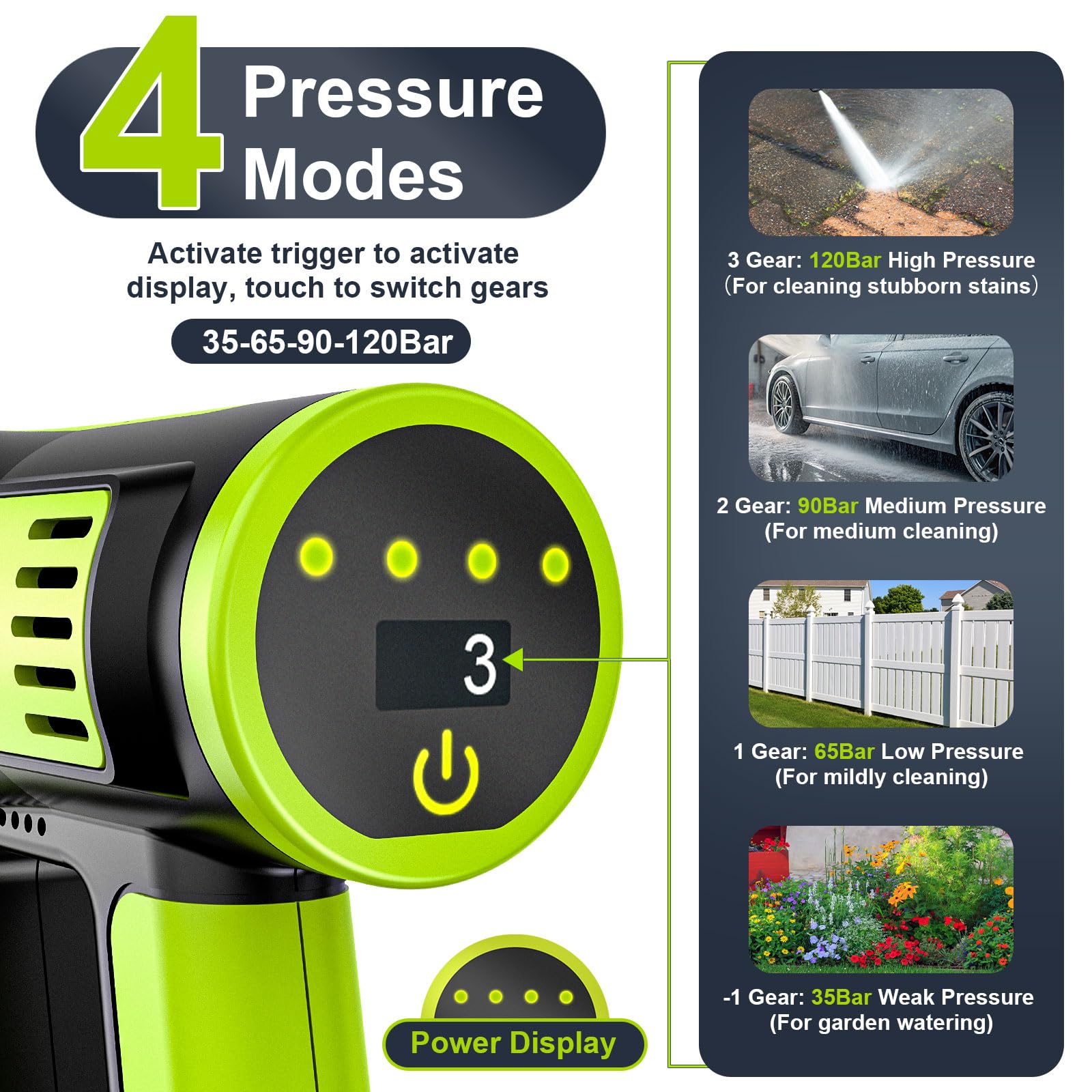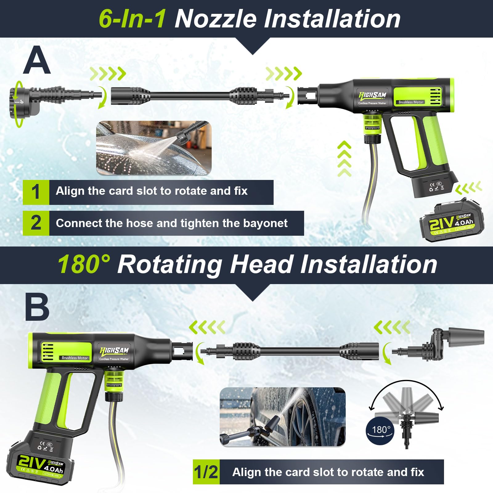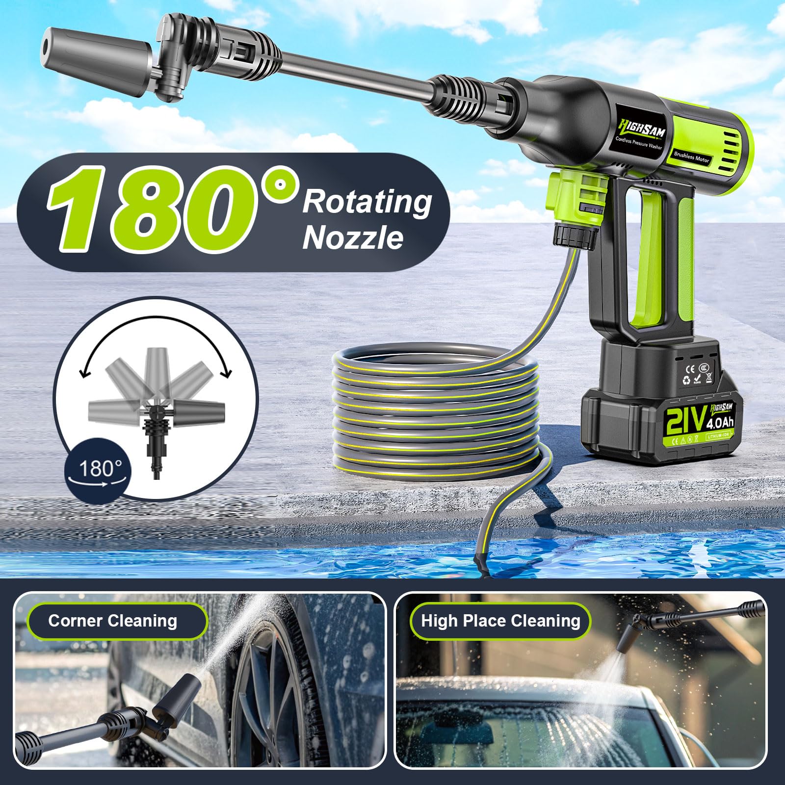 Akku Hochdruckreiniger, highsam Pressure Washer 4-Gang-Modus Max 120Bar, Druckreiniger Mobiler mit 2x4.0Ah Batterien, 6-in-1und 180° Drehbare Düse, Schaumsprüher, 5M Schlauch | Reinigung Bewässerung